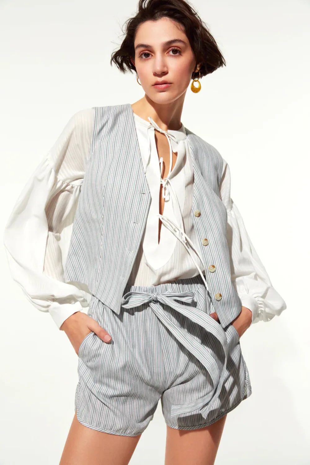 Jeny şort koton kumaştan üretilmiştir. Beli lastiklidir ve kendi kumaşından kemere sahiptir.