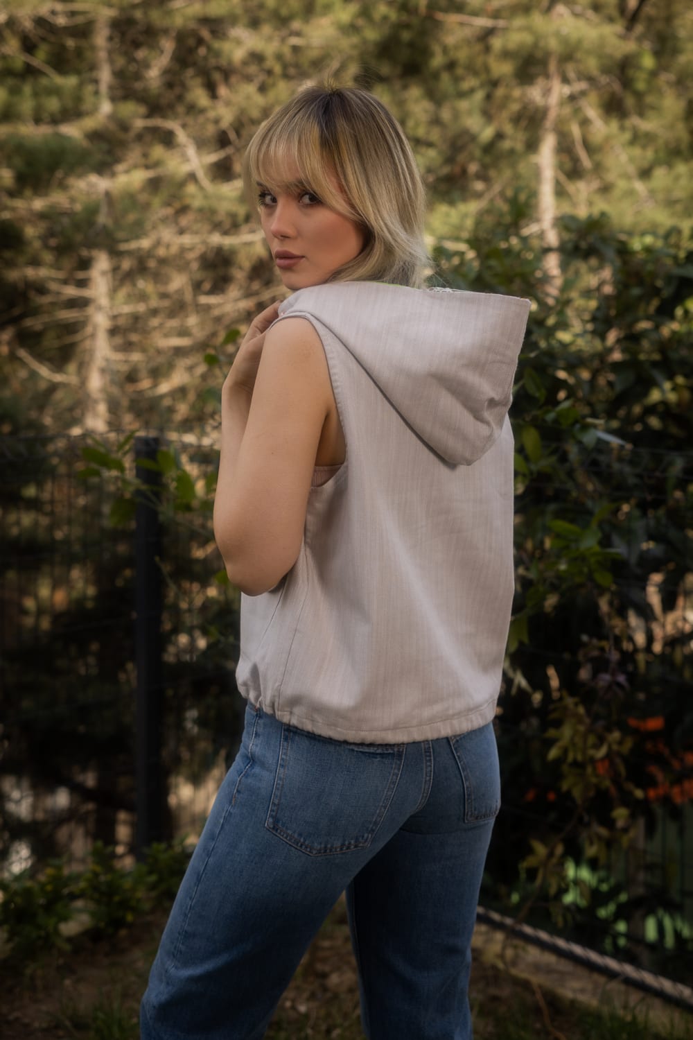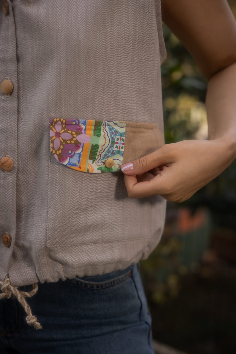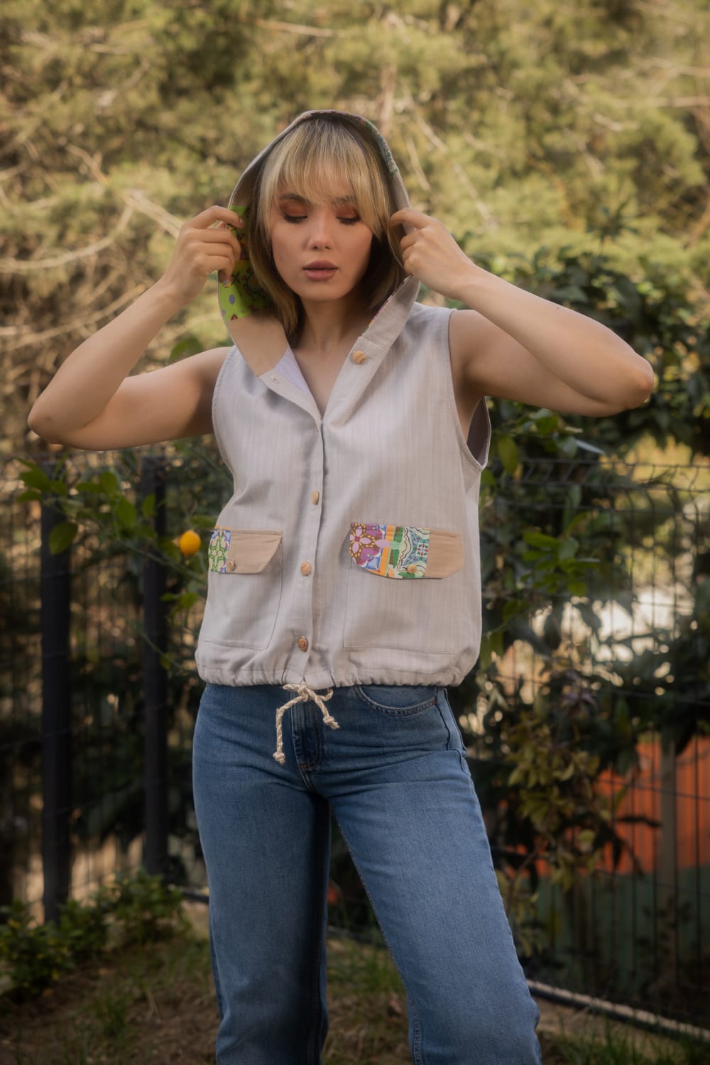 Pivi and Kobo YelekDesenler, Sanatçı Defne Camcıoğlu’nun eserlerinden oluşturulmuştur.Viskon karışımlıdır,Ürün, dökümlü ve yumuşak dokulu viskon karışımlı kumaştan üretilmiştir.Kapüşon yaka ve önden bağcık detaylı olan ürün patch birleşimleri ile şık bir görünüm sunmkatadır.BAKIM ÖNERİLERİ:30 derecede yıkama yapılabilir,Ağartıcı kullanılamaz,Makinede kurutmayınız.