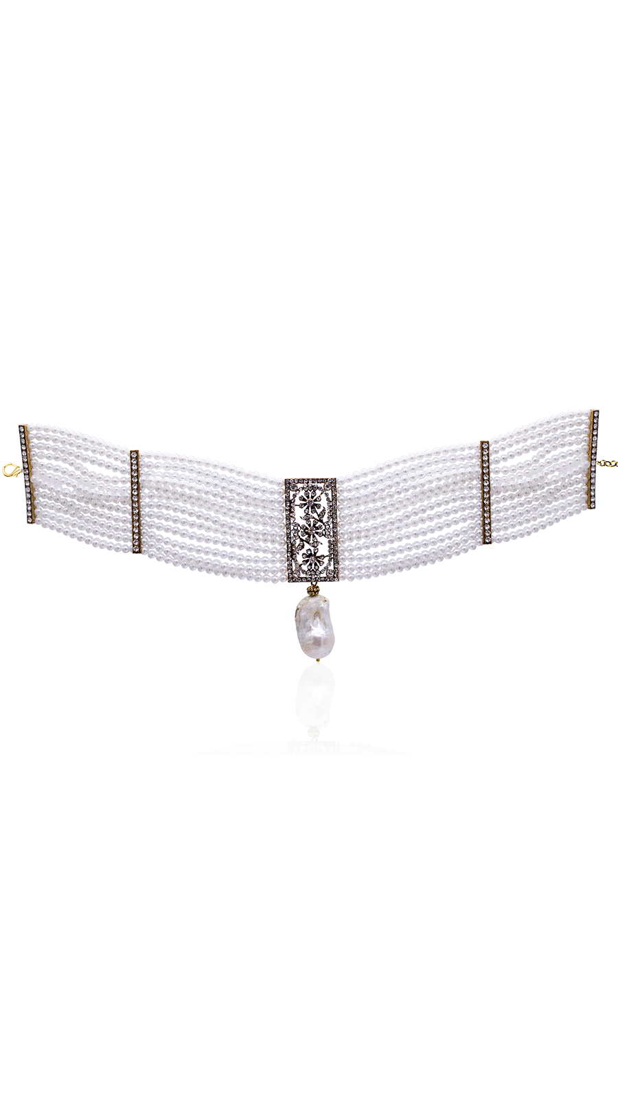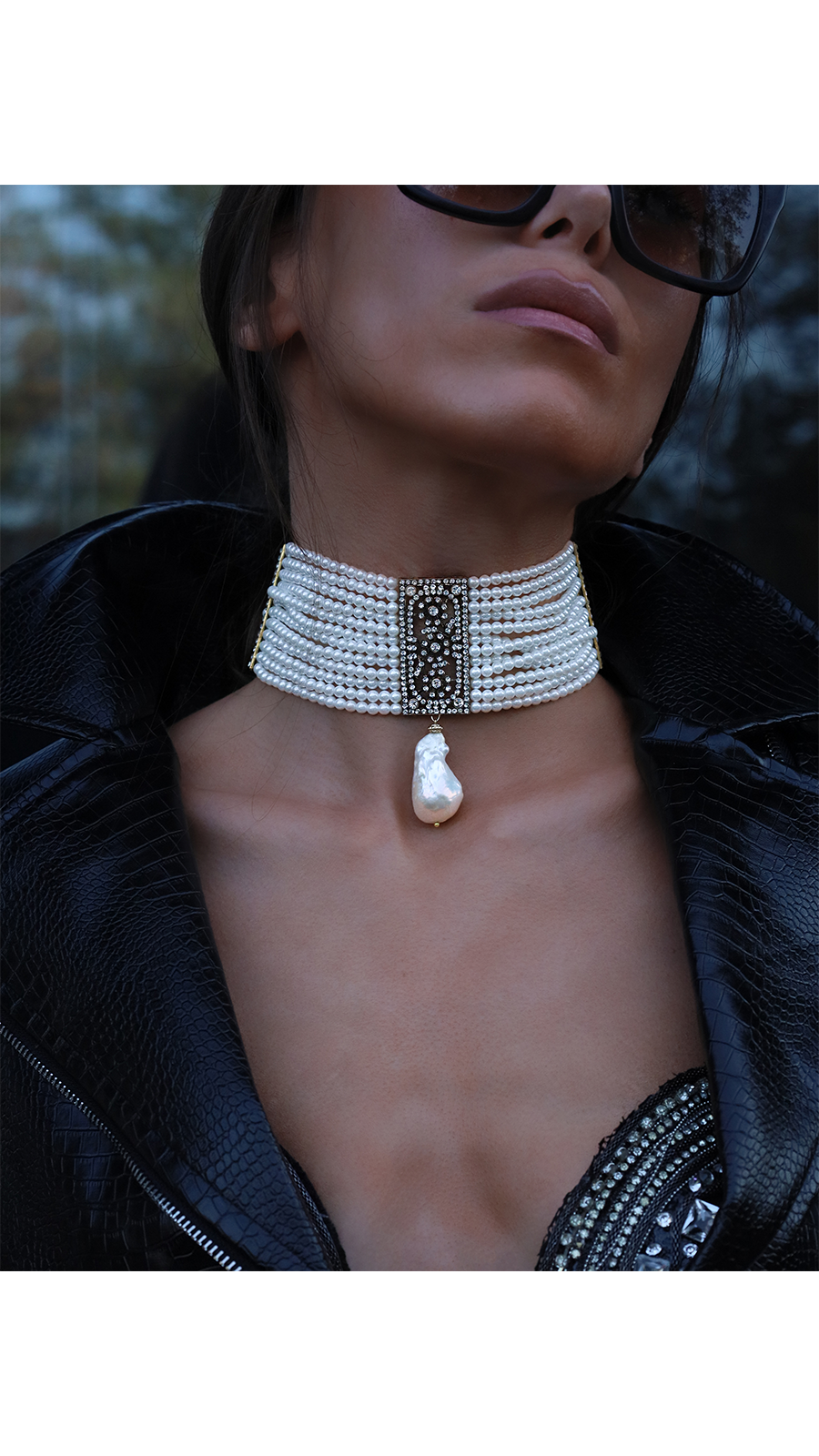 Doze İnci Kolye, zarafetin ve ihtişamın kusursuz bir birlikteliğini sunar. On iki sıra incinin dizilimiyle oluşan bu muhteşem kolye, incilerin saf ve klasik güzelliğini çağdaş bir lüksle harmanlayarak göz kamaştırır. Kolyenin ortasındaki 22 ayar altın kaplama pirinç üzerinde parıldayan kristal taşların işlenmiş sembolü, kolyeye zengin bir karakter ve göz alıcı bir odak noktası katıyor. Son dokunuş olarak, Doze İnci Kolye'den zarifçe sarkan barok inci, her harekette ışığı yakalayarak büyüleyici bir etki yaratır. Bu kolye, giyen kişiye sıradışı bir çekicilik kazandırırken, her bakışı üzerine çekme gücüne sahiptir. Doze İnci Kolye, kendi hikayesini gözler önüne seren, kendinden emin ve stil sahibi kadınlar için yaratılmıştır.