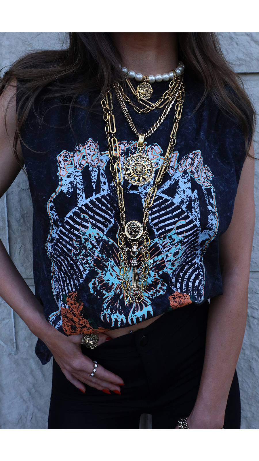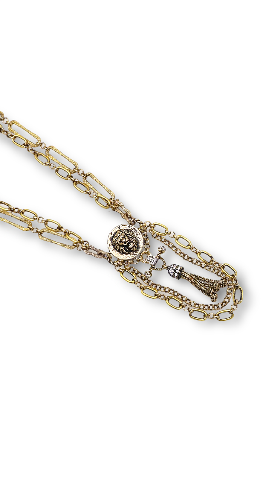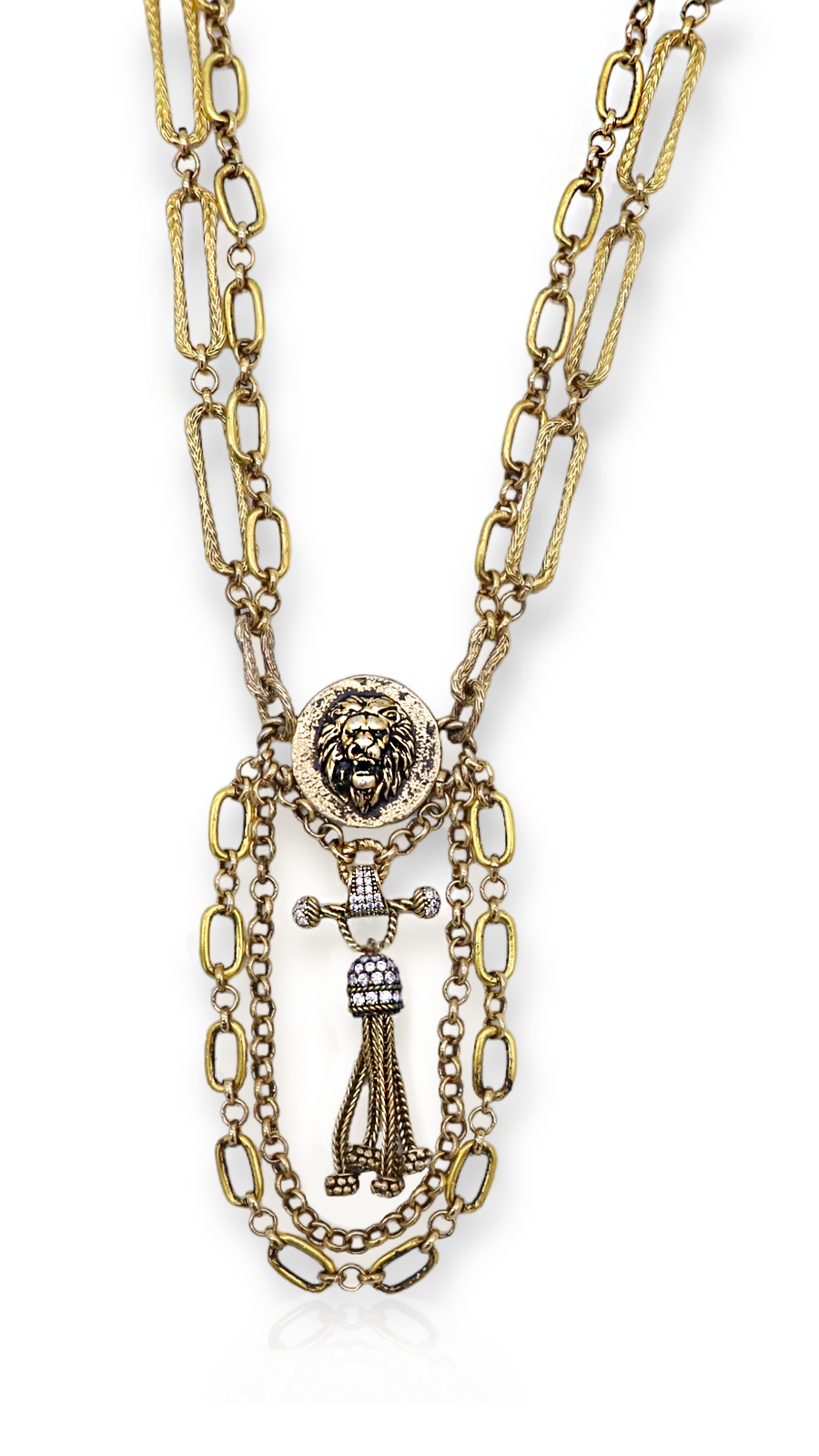 Görkemin ve ihtişamın simgesi Leone Zincir Aslan Kolye, Bayemeyc atölyesinin yaratıcı zanaatkarlığının bir ürünüdür. Bu kolye, zincirlerin dansı ve altının parıltısını, cesur bir sanat eserine dönüştürür. Asaletin metali, 22 ayar altın kaplama pirinç, farklı boyut ve dokularda zincir halkalarına hayat vererek, bir ahenk içinde omuzlarınızı sarar. Leone Zincir Aslan Kolye'nin odak noktasındaki aslan sembolü, yabanın kükreyişini adeta teninize taşır. Aslanın güçlü yüzü, kudret ve kuvvetin bir yansıması olarak, her detayı ince bir işçilikle canlandırılmıştır. Onun altından sarkan püskül, hareketle birlikte ışıltılı kristal taşların ışığını saçarak, zerafetin ve cesaretin birlikteliğini kutlar. Leone Zincir Aslan Kolye, sadece bir aksesuar olmanın ötesinde, taşıyanın karakterini ve içindeki vahşi ruhu serbest bırakır.