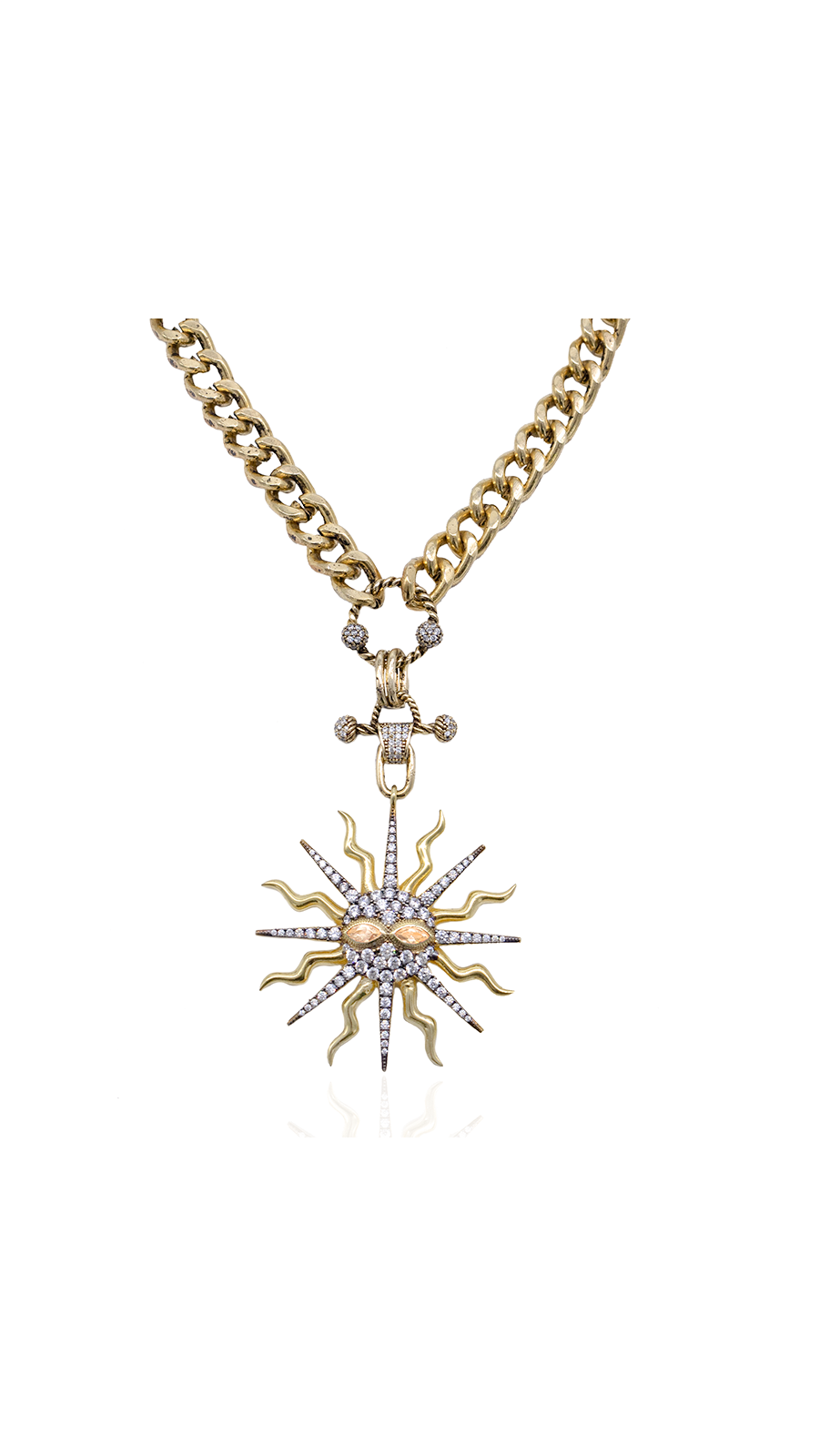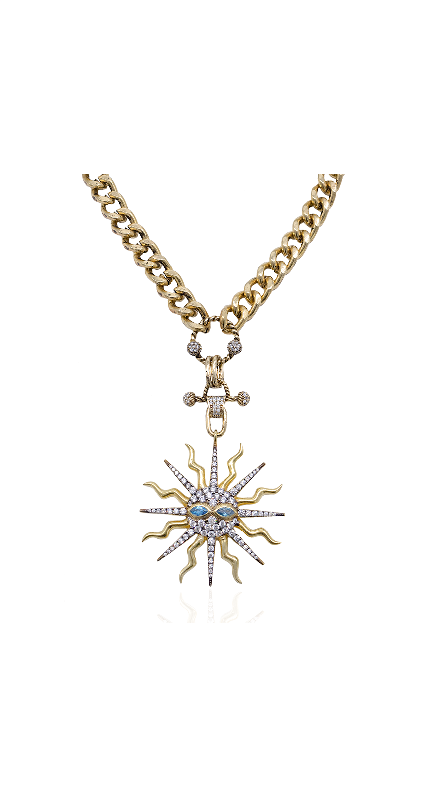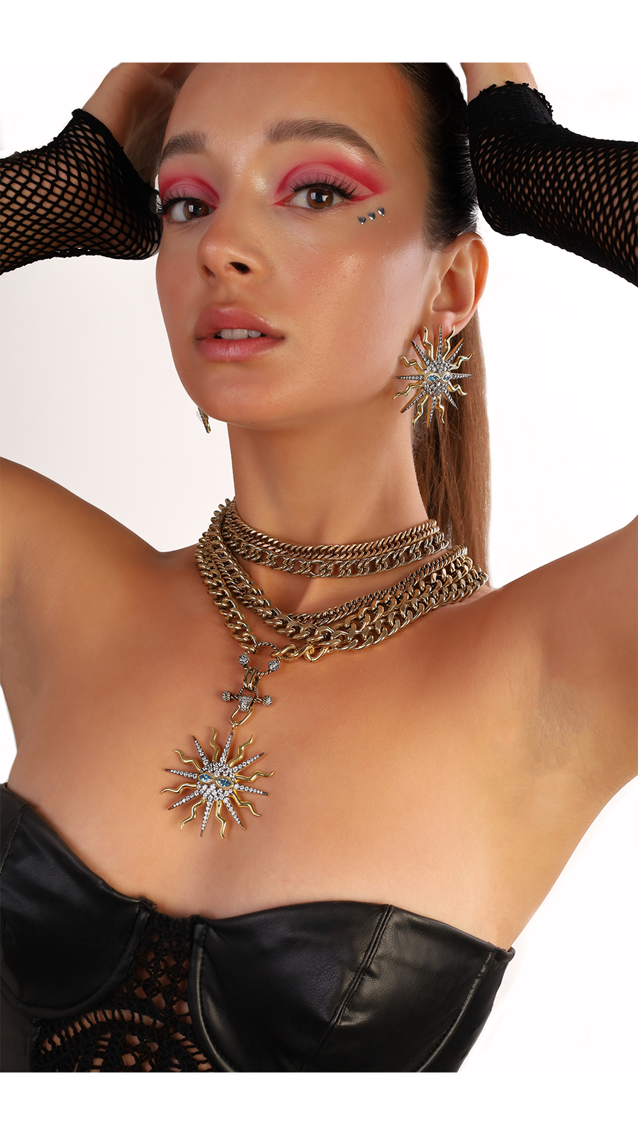 Maschera Altın Kaplama Charm Kolye, antik dönemlerin maskeli balolarının gizemini çağdaş bir tasarımla yeniden hayal ediyor. Altın ışıltısının dans ettiği bu kolye, 22 ayar altın kaplama pirinçten özenle dökülmüş zincirlerin üzerinde adeta bir hikaye anlatıyor. Maschera Altın Kaplama Charm Kolye merkezindeki asil bir halka, etrafını saran kristal taşların ışığıyla, bir zamanlar Venedik sokaklarında gizemli bir maske giyen asilleri anımsatıyor. Bu hikayenin kalbinde yer alan maskeli güneş sembolü, eski medeniyetlerin güneşe duyduğu hayranlık ve büyüyü simgelerken, Aqua taşlarındaki derin mavi gözler, sonsuz okyanusların ve gökyüzünün derinliklerini yansıtıyor. Güneşin kolları, dünyanın dört bir yanından toplanan kristal taşlarla süslenmiş, her biri kendi içinde farklı bir dünya, farklı bir öykü barındırıyor. Maschera Altın Kaplama Charm Kolye, sadece bir aksesuar değil, aynı zamanda giyenin üzerinde yaşayan bir sanat eseri olarak yerini alır.
