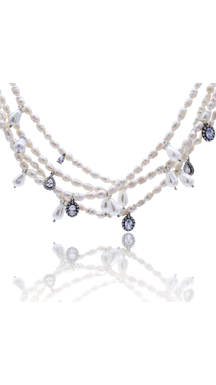 PRINCESA İnci Kolye, Bayemeyc imzasını taşıyan, denizin derinlerinden çıkarılan incilerin ve yıldızların parıltısını bir araya getiren muazzam bir tasarımdır. Bu kolye, dört sıra inci diziliminin oluşturduğu karmaşık yapısıyla, bir bakışta sadeliği ve karmaşıklığı harmanlayarak göz alıcı bir kontrast yaratıyor. Üzerine yerleştirilmiş olan kristal taşlar, her bir incinin saf güzelliğini vurgularken, damla formundaki inciler ise kolyenin çarpıcı simetrisini kırmak için zarif bir şekilde serpiştirilmiş. PRINCESA İnci Kolye, deniz kıyısında rüzgarın melodisine eşlik ederken, şehrin kalabalığında bir ışık huzmesi gibi parlayacak bir tasarım harikasıdır.