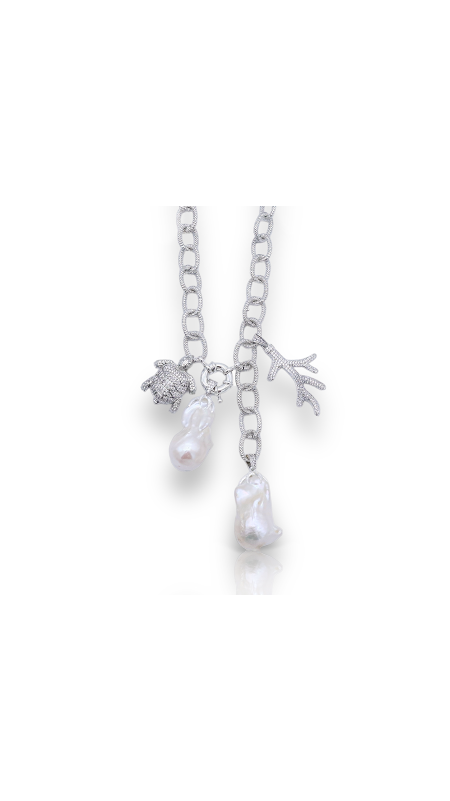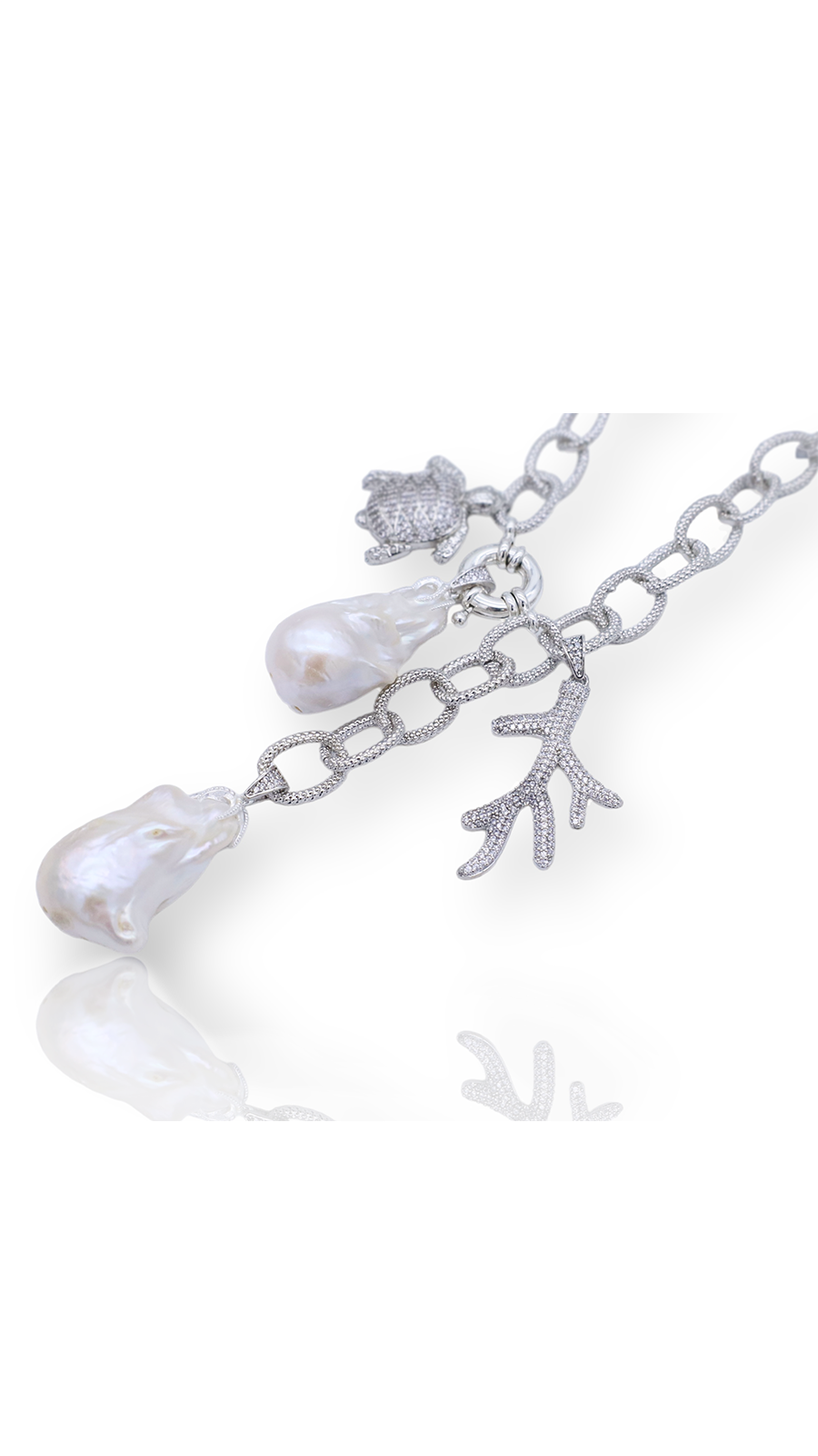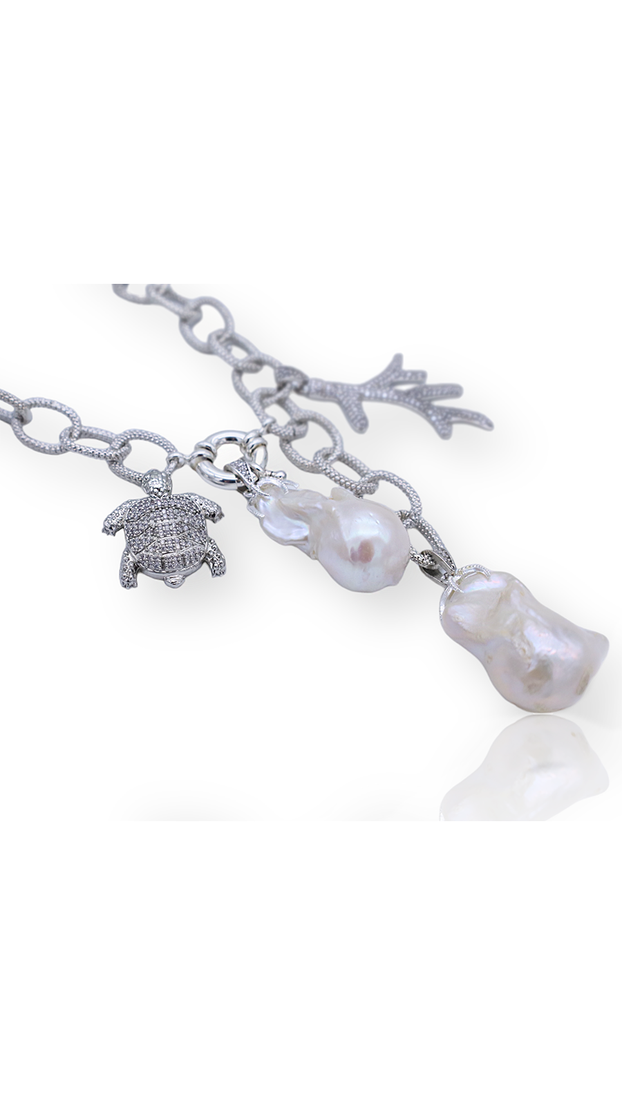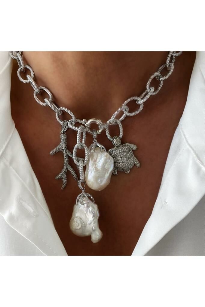 TEMIS Barok İnci Kolye, Bayemeyc'in el işçiliği ve tasarım gücünün bir yansıması olarak öne çıkıyor. Bu zarif kolye, 925 ayar gümüş kaplama pirinç zincir ve ona asil bir zarafet katan iki adet büyük barok inci ile bezeli. Kolyenin odak noktasındaki kaplumbağa ve dal sembolleri, doğanın ve denizlerin eşsiz güzelliklerini sembolize ederken, aynı zamanda şıklığı ve ince detayları ön plana çıkarıyor. TEMIS Barok İnci Kolye, sadece bir aksesuar olmanın ötesinde, takan kişinin doğayla bağını ve zarif stilini vurgulayan bir ifade parçasıdır. Gündüzden geceye her anınızda eşlik edecek TEMIS Barok İnci Kolye, Bayemeyc koleksiyonunun en popüler parçalarından biri olma ünvanını taşımaktadır.