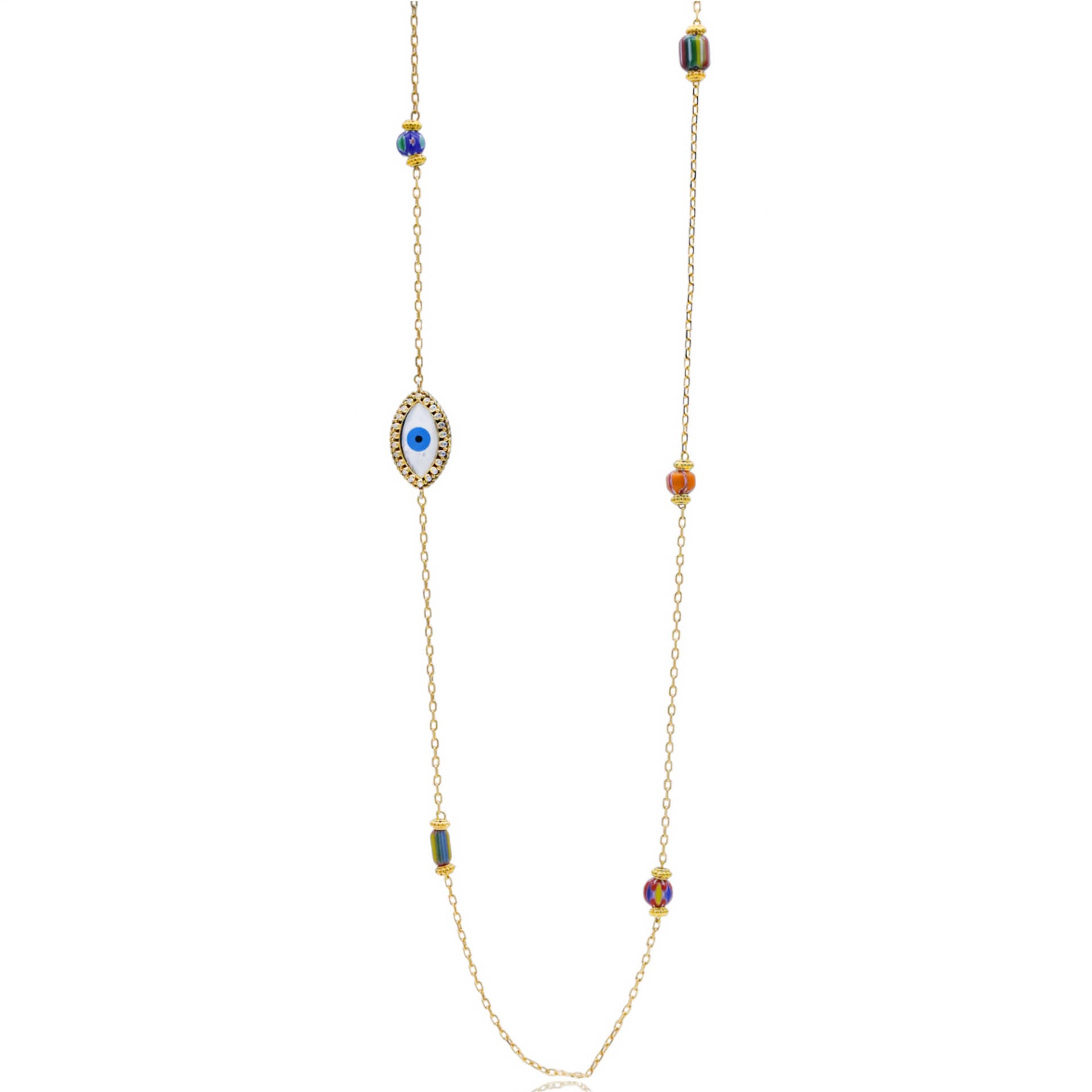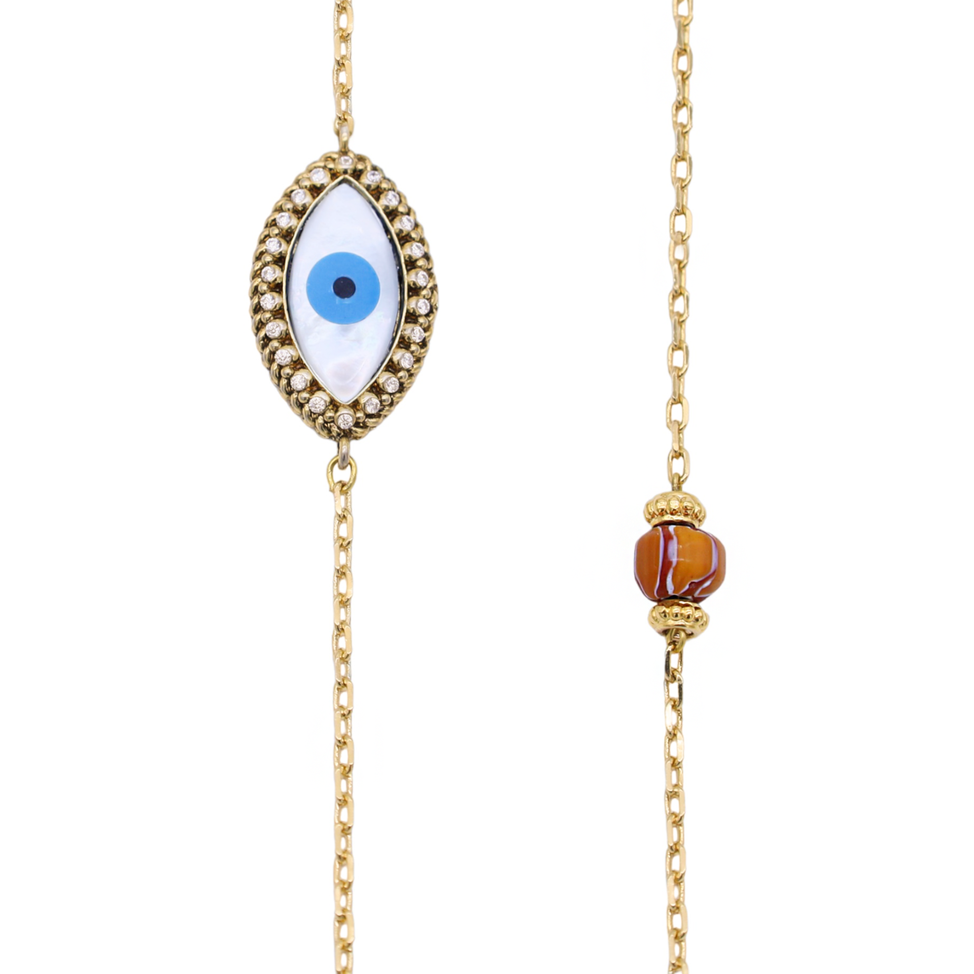 VINTANA Göz Zincir Kolye, zarif tasarımında sedef taşları ve doğal taşların uyumunu sergiliyor. 22 ayar altın kaplama pirinç zincir ile tamamlanan bu özel kolye, zarafeti ve doğanın güzelliklerini bir araya getiriyor. VINTANA Göz Zincir Kolye, sizi eşsiz bir stil ve doğal zarafetle buluştururken, her detayında benzersiz bir görünüm sunuyor. Doğal taşların gücü ve sedefin zarifliği, bu kolyeyi hem anlamlı hem de etkileyici bir aksesuar haline getiriyor.