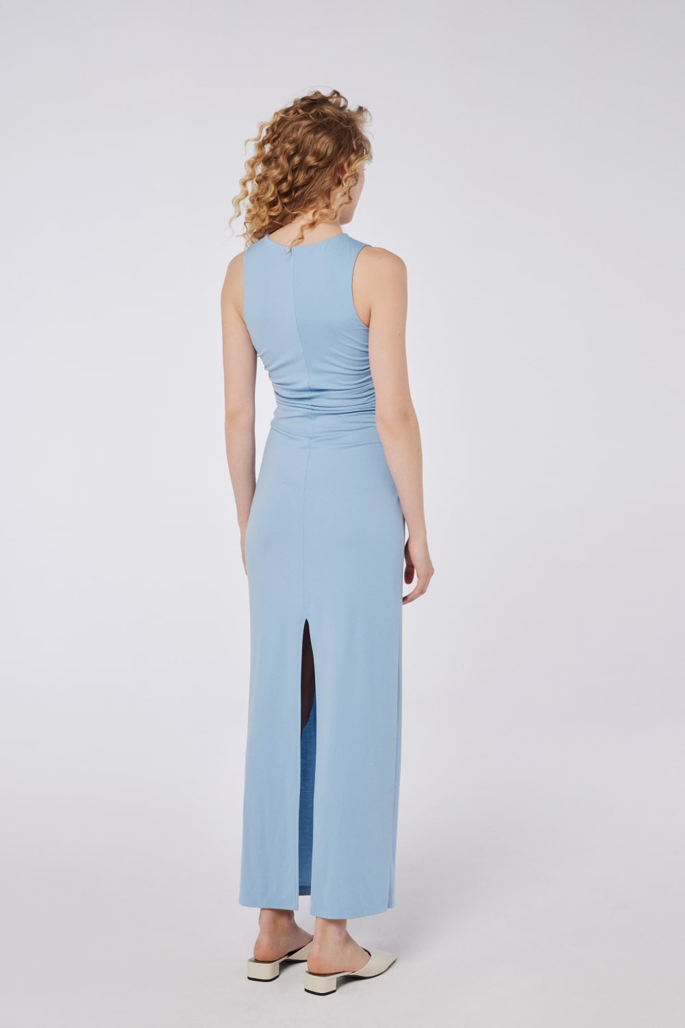 Kesik detaylı yakası ve ince büzgüleri ile vücuda oturan bu elbise, minimalist ama çarpıcı bir duruş sunar. Beden hatlarını saran tasarımı, yere kadar uzanan akıcı bitişle tamamlanır.