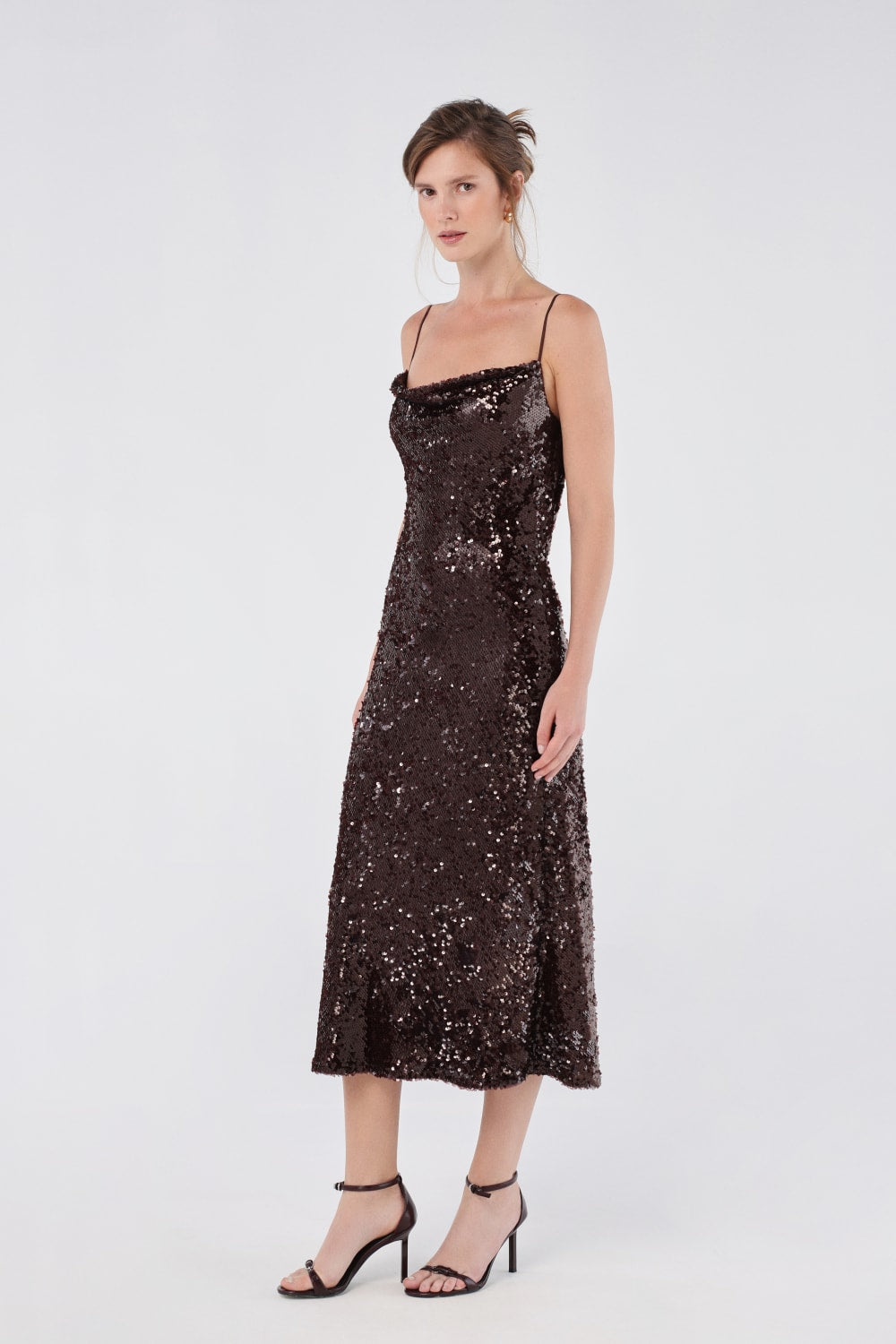 Kaygan kahverengi payet kaplamasıyla göz alıcı bir parlaklık sunan bu slip-on elbise, drape yakası ve zarif ince askılarıyla şık bir şekilde dökülür. Alçak sırt kesimi, ayarlanabilir bağcık detayıyla modern ve çekici bir dokunuş kazanır. Midi boy silueti, zarafet ve sofistike görünümü mükemmel bir dengeyle bir araya getirir. Hafif kumaşı, konforu korurken lüks bir parlaklık sunar.