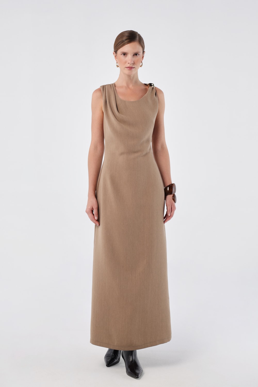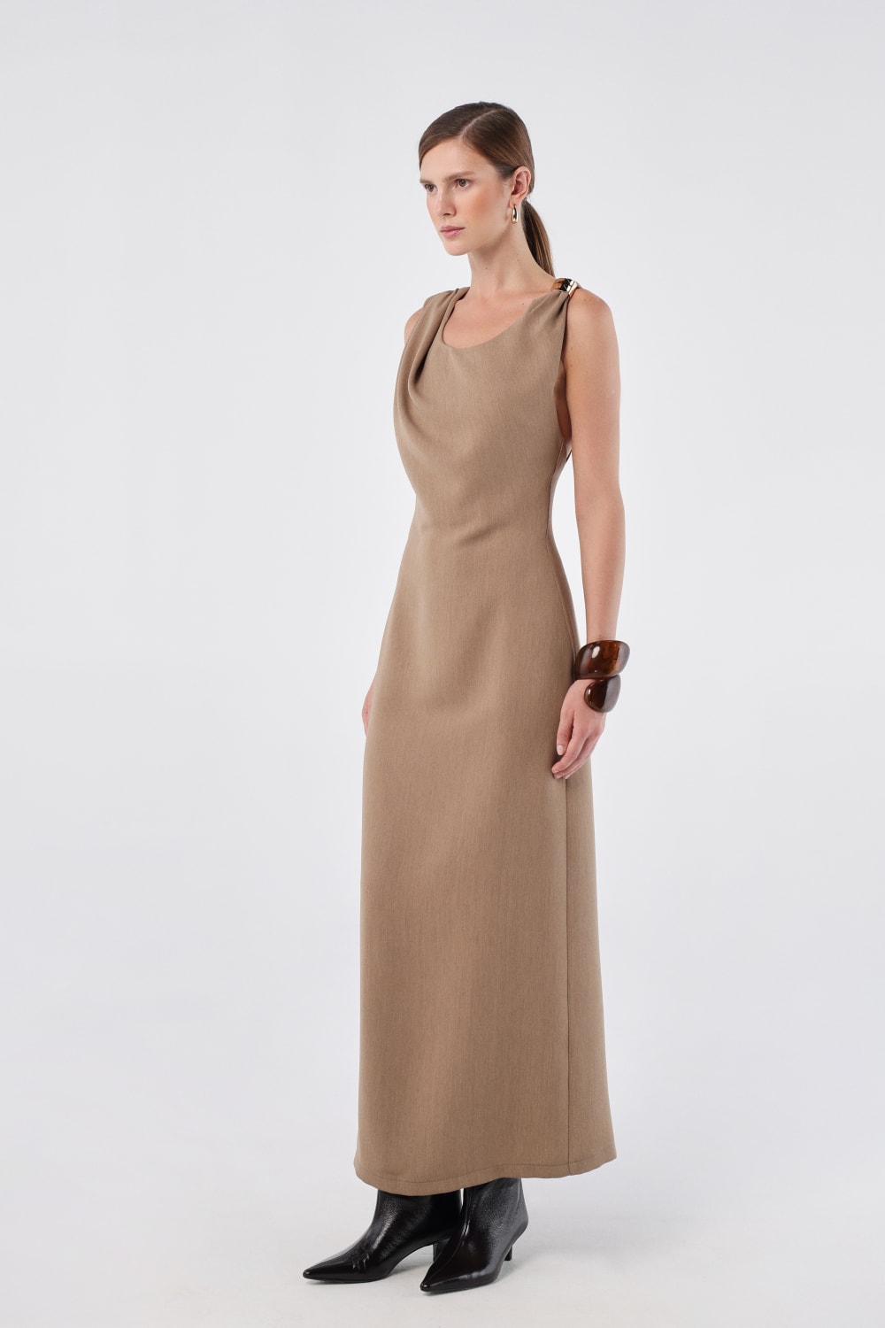 Ön kısımdaki zarif drapeler sofistike bir görünüm sunarken, sırtın eşsiz bükümlü detayı her açıdan göz alıcı bir etki yaratır. Omuzdaki şık toka modern bir dokunuş katar ve arka kısımdaki ince yırtmaç, hem hareket özgürlüğü hem de cazibe sağlar.
