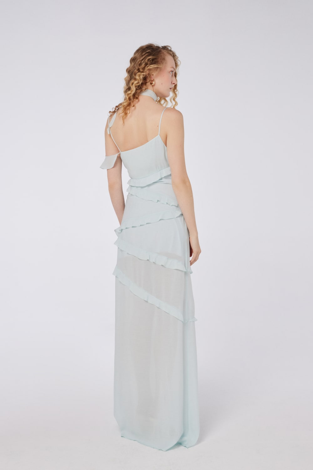 Akıcı formu ve cesur fırfır detaylarıyla bu maxi elbise, etkileyici bir siluet yaratarak özel akşamlar ve davetler için ideal bir tercih sunar.