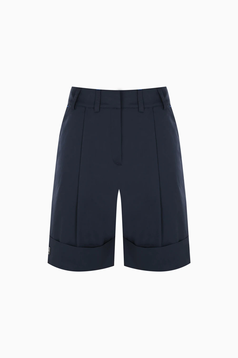 Önü pensli, geniş kesim, iki yan cepli, metal logo aksesuarlı, lacivert poplin kumaş bermuda şort.