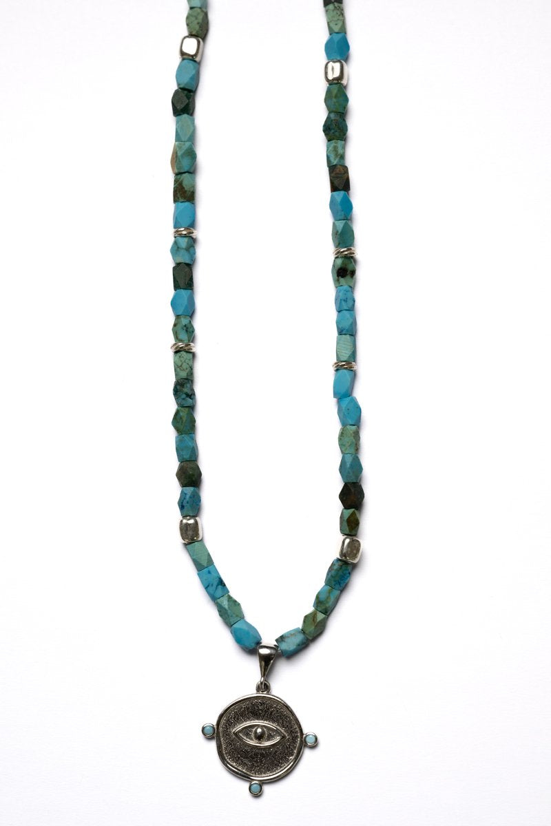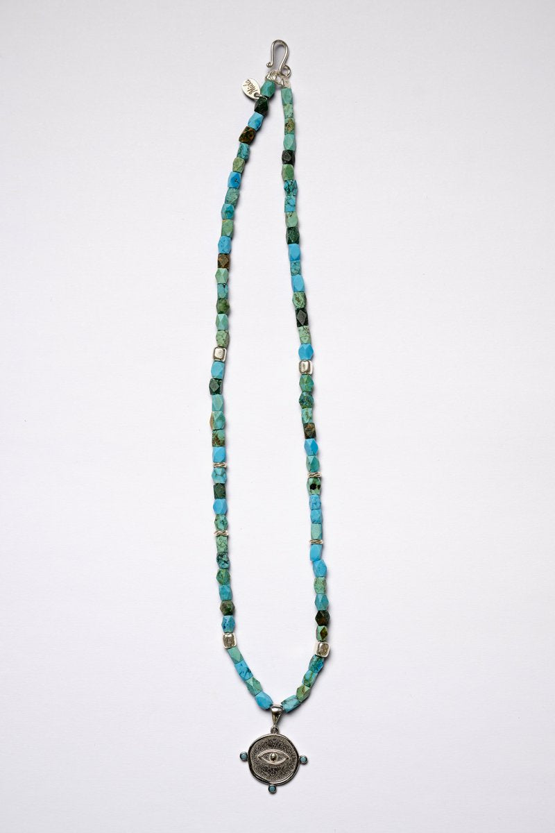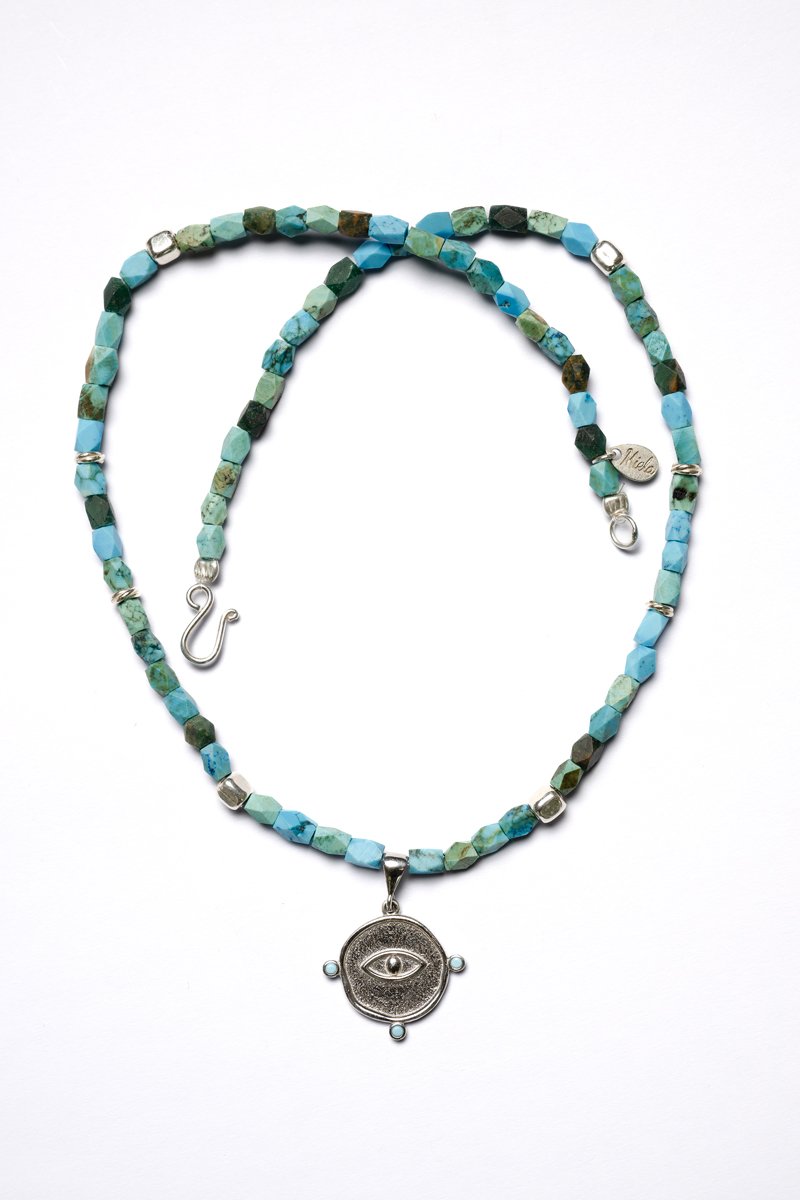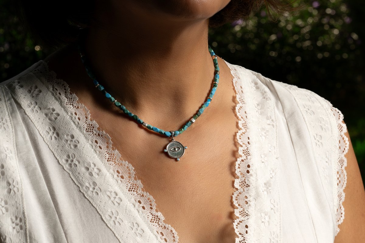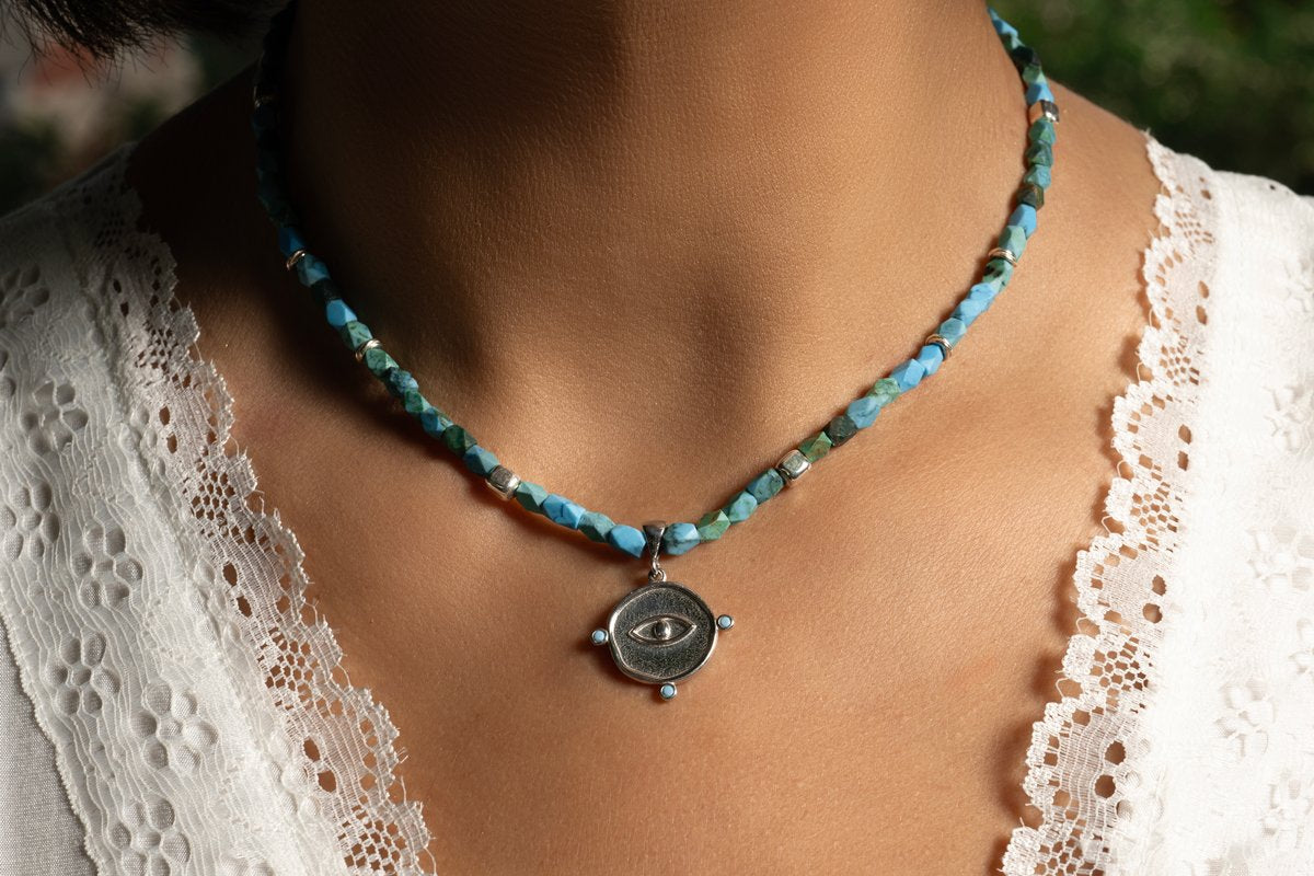 Zena kolye turkuaz taşı kullanılarak tasarlanmıştır.