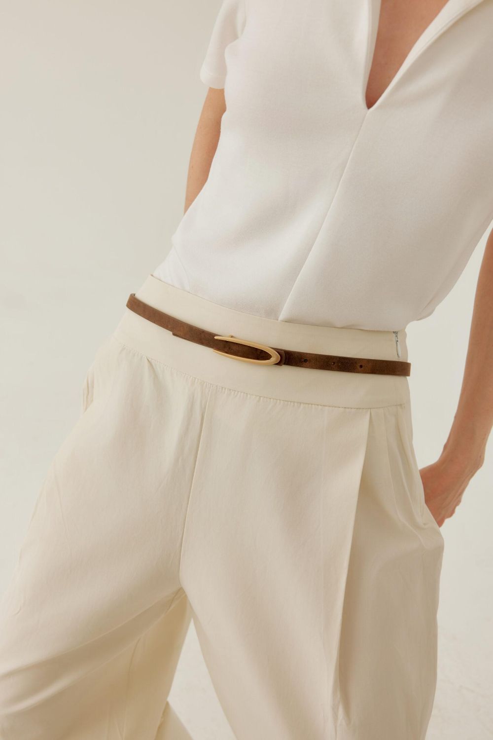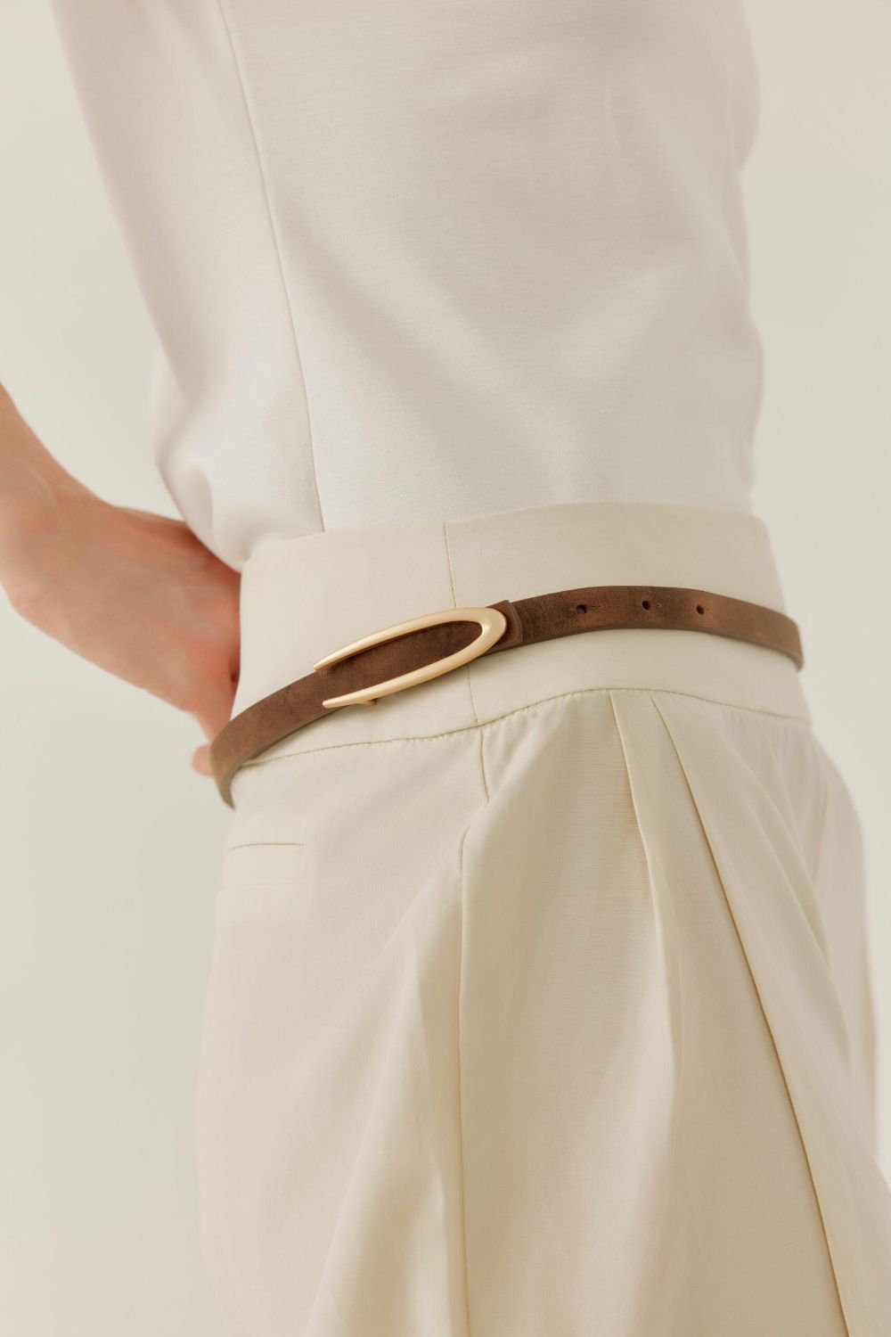 Giorgio is destined to become a wardrobe essential.Crafted from smooth, ultra-thin sustainable leather, it secures with a petite gold-tone bar buckle. The Giorgio belt is designed to deliver a flawless fit with its fully adjustable strap, allowing it to wrap smoothly around the waist for a perfectly tailored look. Available in off-white, brown, and Bordeaux leather options, each style is finished with a striking gold buckle that instantly elevates any outfit.
