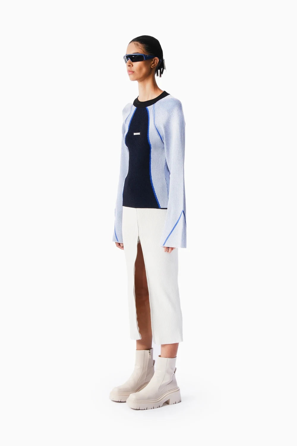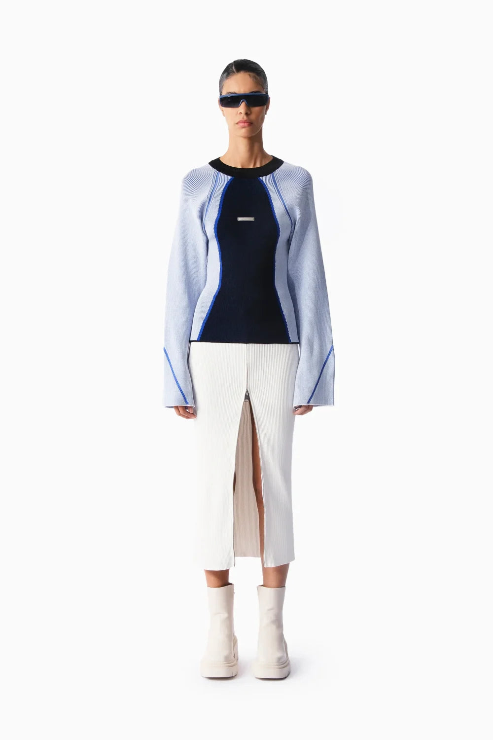 Trompet kollu, nervürlü ve ön tarafında KNTLGY metal logo aksesuar detaylı triko kazak.