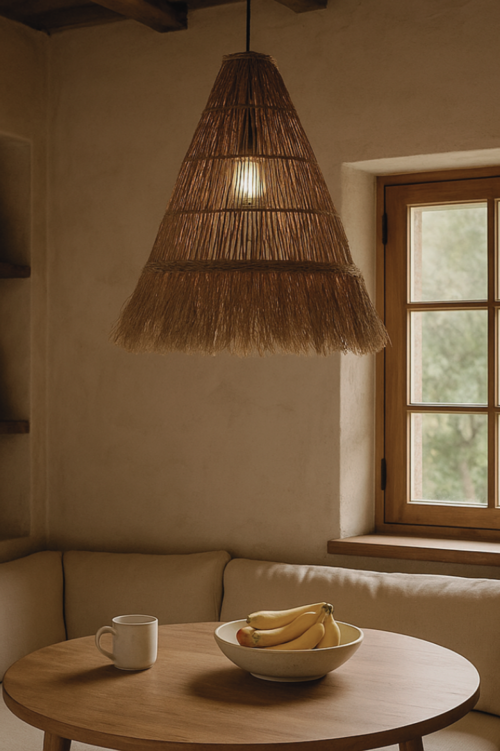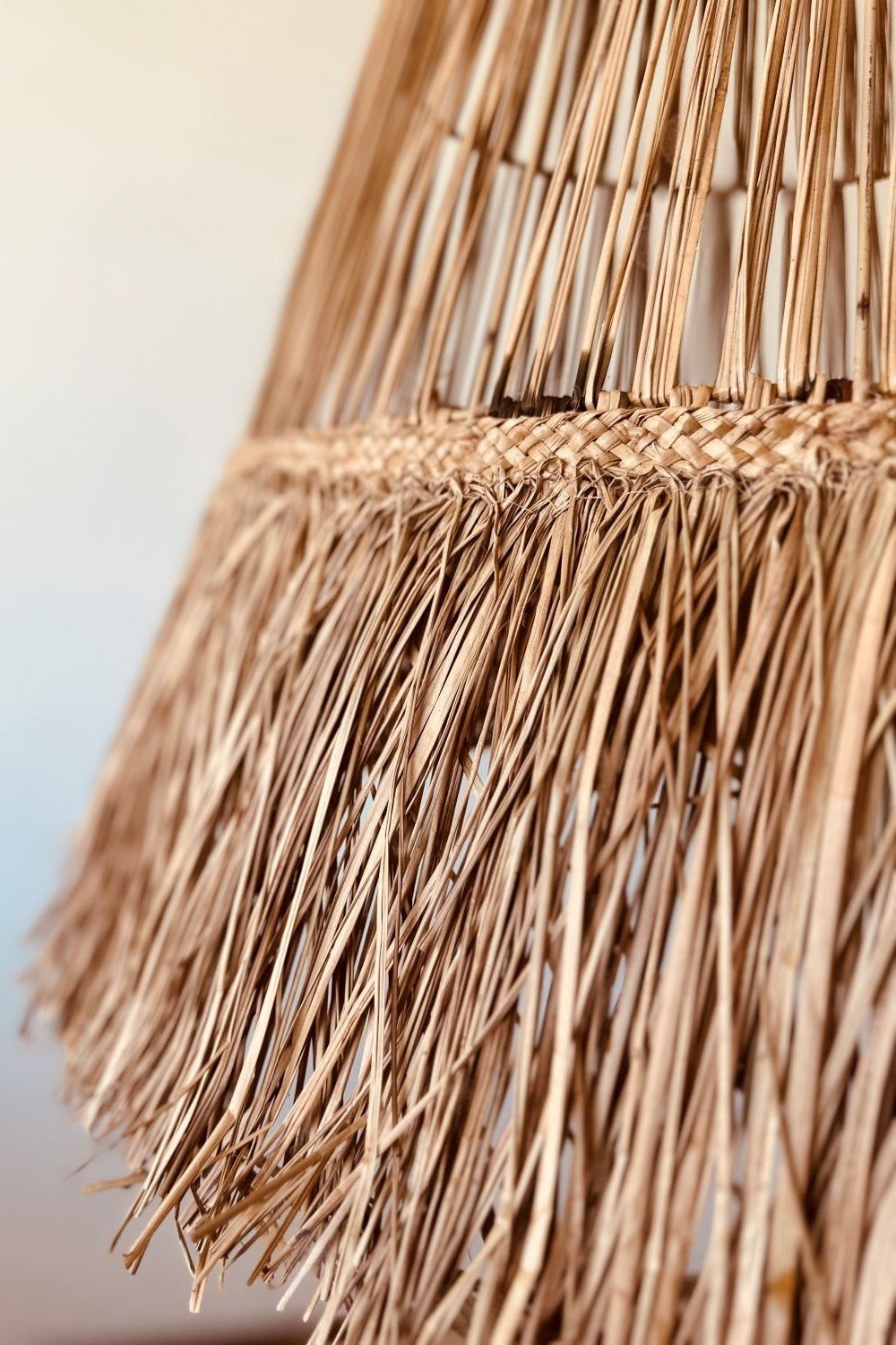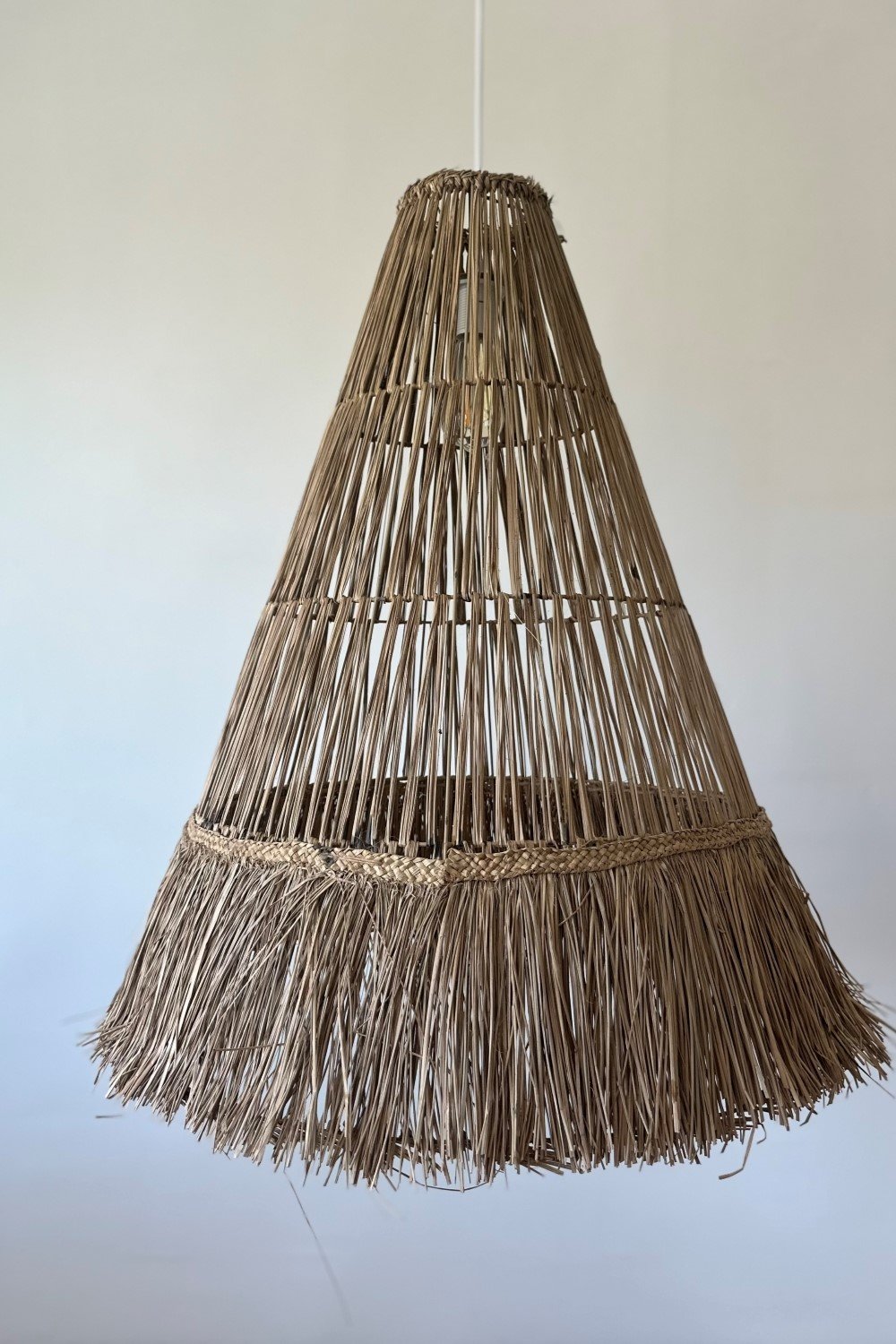 İnce ana hatlar ve orta alanda kalın bir örgü detayı ile son dokunuşu yapılmış bu hasır avize, mekana doğallık ve yumuşaklık katacaktır. Karşılama alanlarında veya geniş mekanlarda tercih edilebilir.
