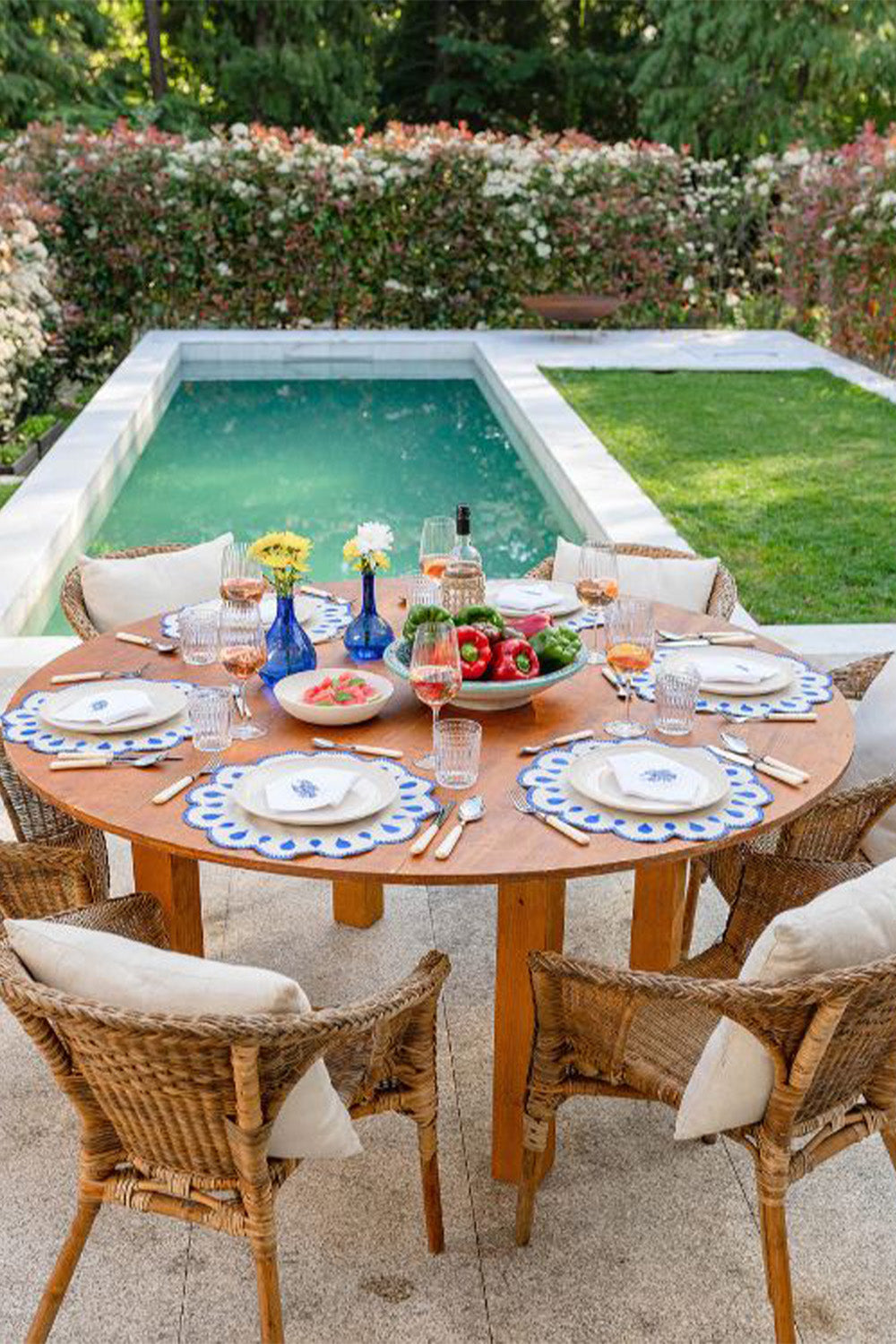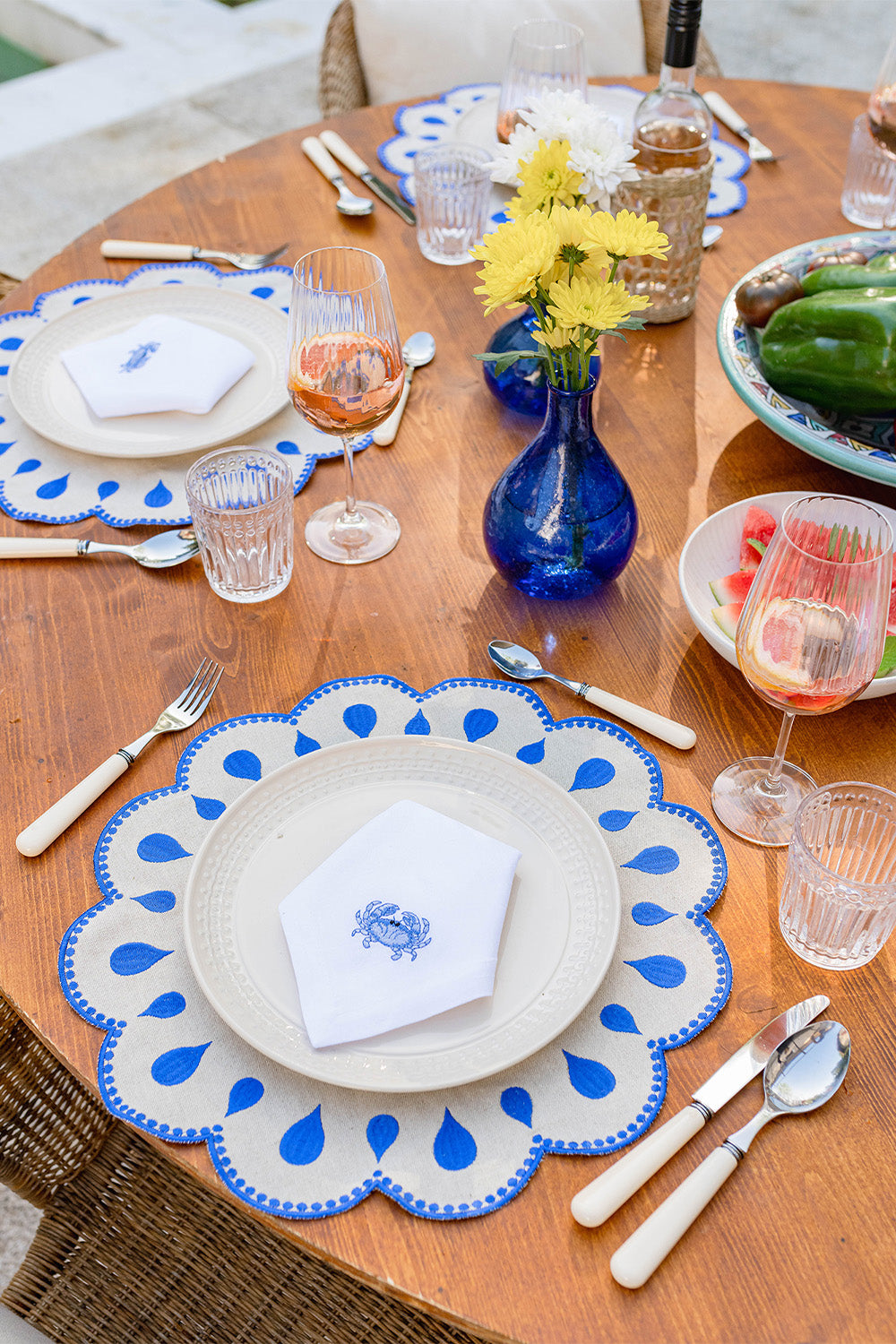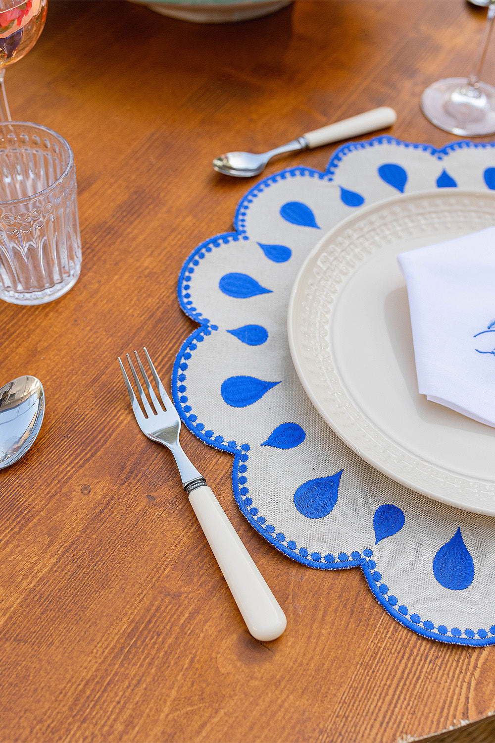 seti, bejin doğallığıyla mavinin serinliğini buluşturan zarif bir masa tekstili