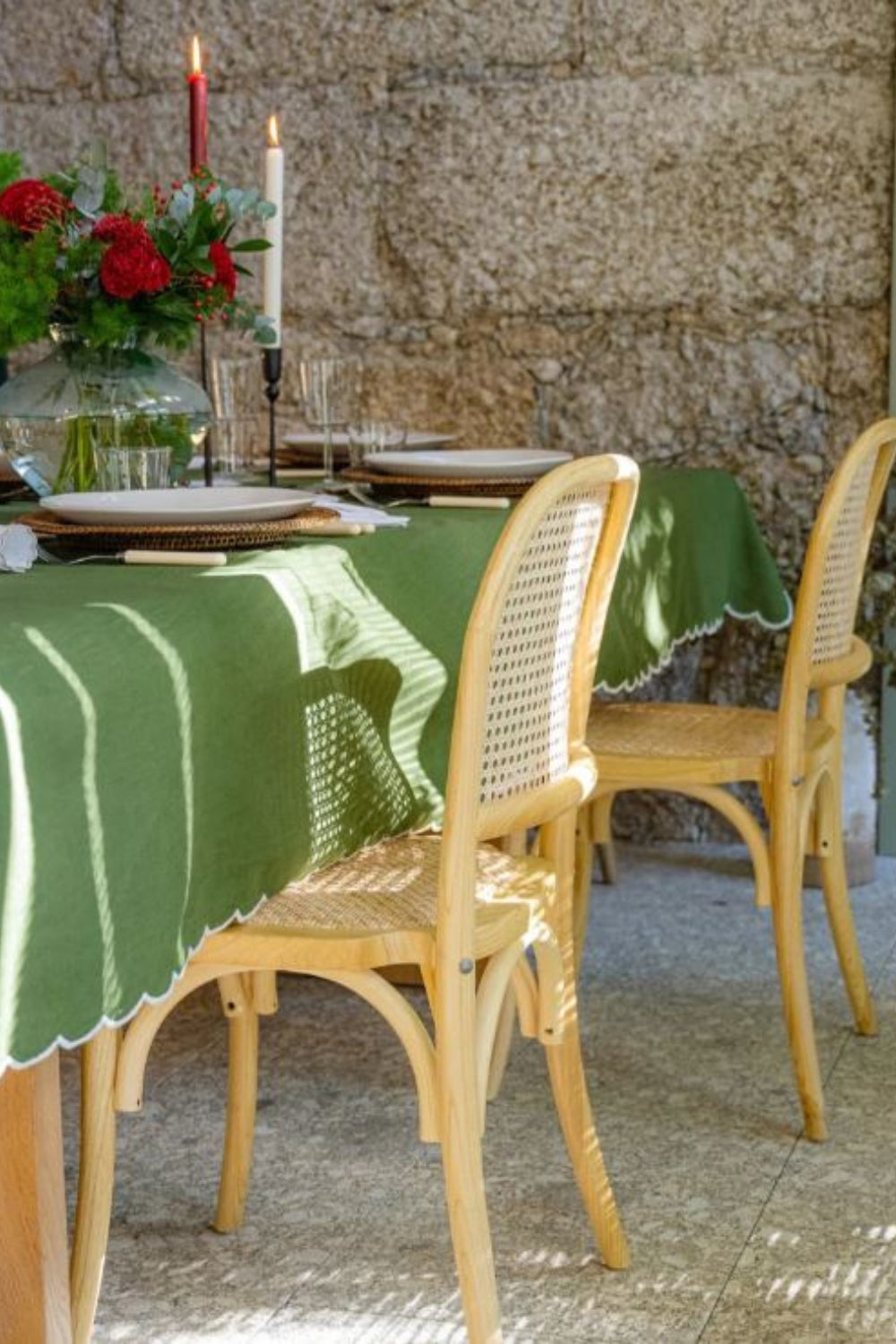 Canlı yeşil tonları ve özenle işlenmiş kesik dikiş detaylarıyla öne çıkan bu masa örtüsü, sofranıza sade ama etkileyici bir şıklık kazandırır. Keten ve pamuk karışımından üretilen kumaşı, hem yumuşak bir dokunuş hem de uzun ömürlü bir kullanım sunar.