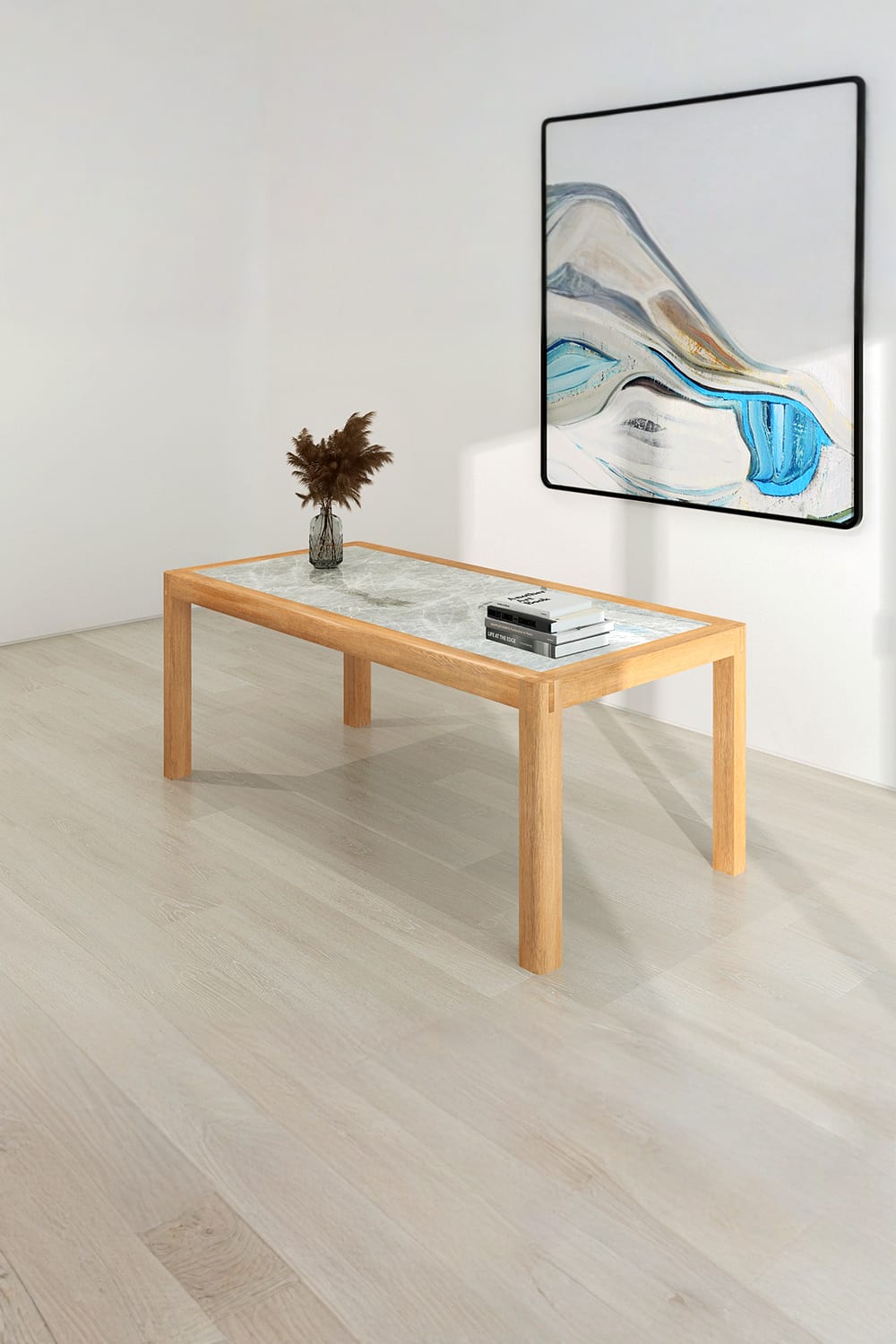 Noma masa, yalın formuyla öne çıkan çağdaş bir tasarım anlayışı sunuyor. Mermer yüzeyin doğal dokusu ile masif ahşabın sıcaklığı zarif bir çerçevede buluşuyor. El işçiliğiyle üretilen bu masa, net çizgileri ve dengeli duruşuyla hem estetik hem de zamansız bir karaktere sahip. Noma, sakin ama güçlü bir ifade arayan yaşam alanları için tasarlandı.