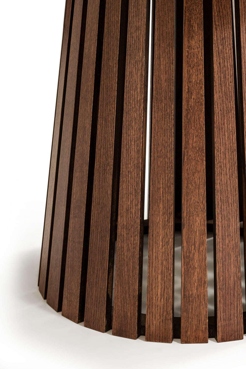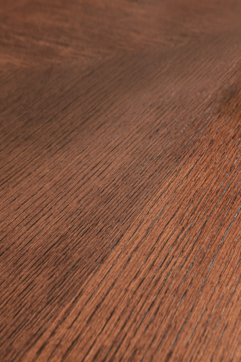 Focus Yemek Masası, üçgen desenli ceviz renkli meşe yüzeyi ve içi boş ızgara konik ayağıyla estetik ve mimari bir merkez parçasıdır.