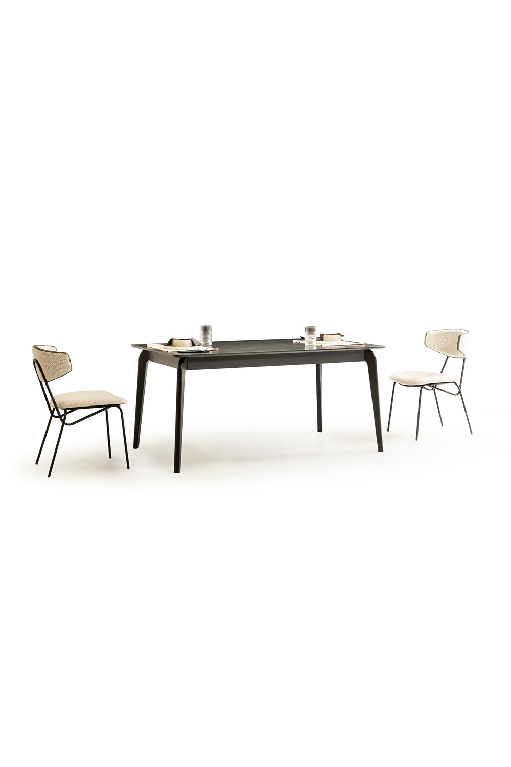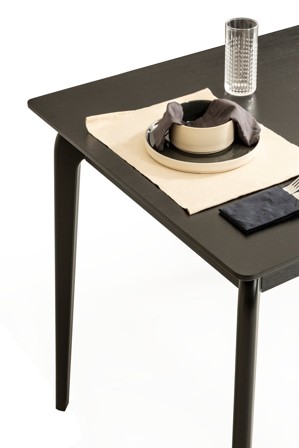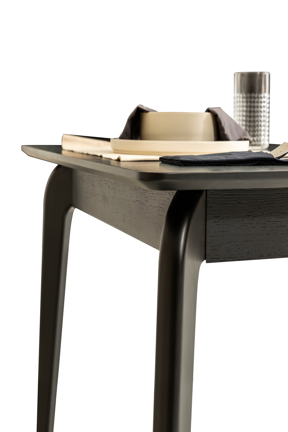 Morienn Yemek Masası, siyah meşe tablası ve kıvrımlı ahşap ayaklarıyla post-minimal heykelsi bir yemek deneyimi sunar.