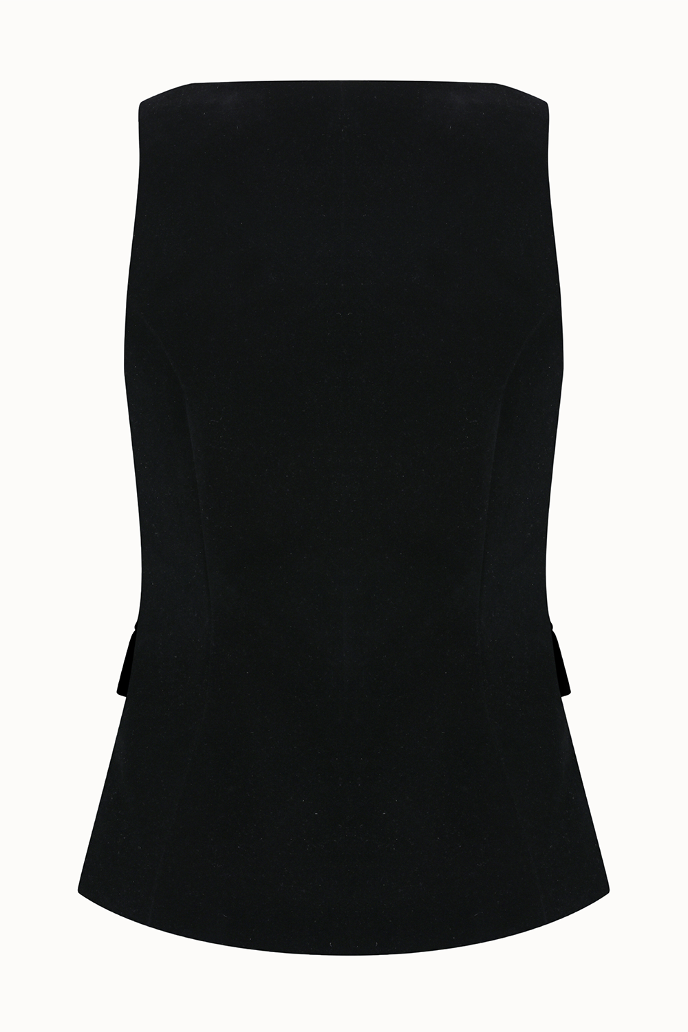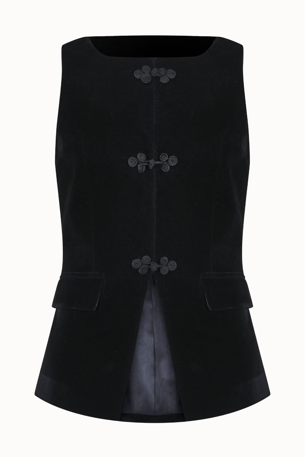Yumuşak siyah kadifeden tasarlanan bu yelek, geleneksel Çin düğmeleri, formu vurgulayan dikimi ve bel altındaki önden yırtmaç detayıyla öne çıkıyor. Klasik zarafet ile modern tasarımın kusursuz dengesini sunuyor.