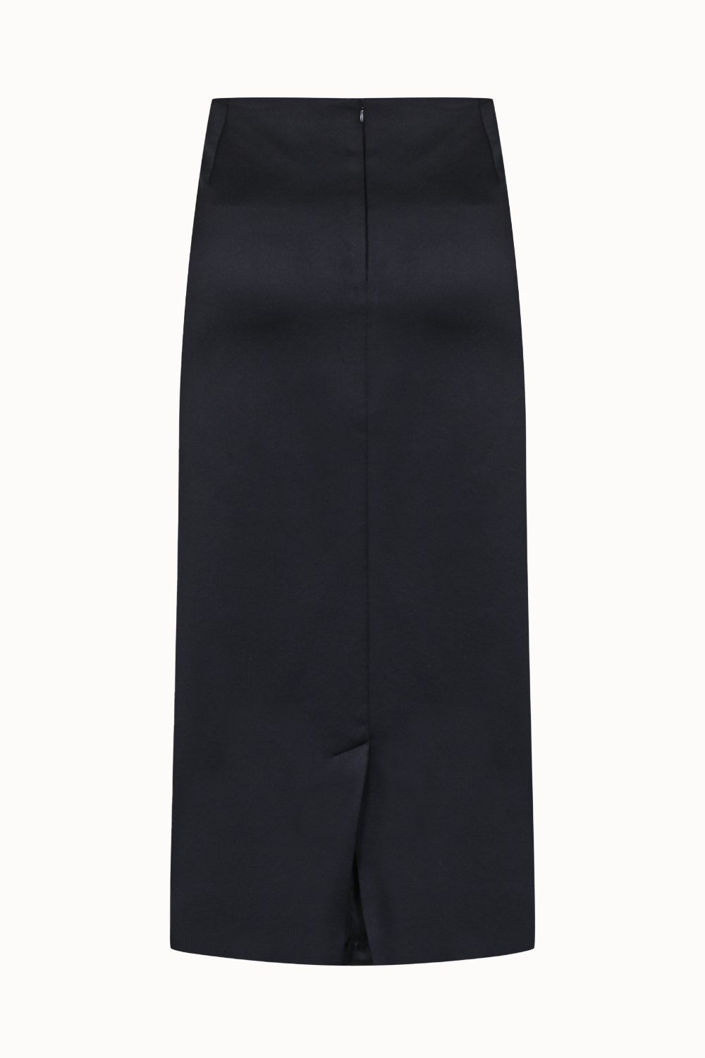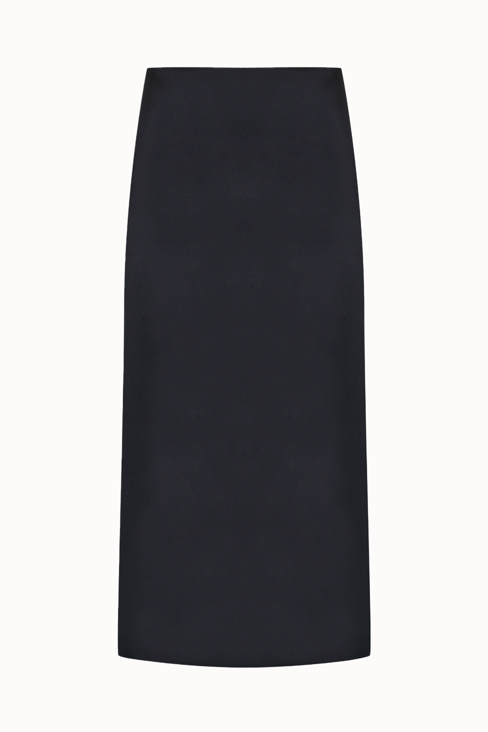 Siyah satenden tasarlanan bu yüksek belli midi etek, sade kalem formu ve arka ortadaki gizli fermuar detayıyla zarif bir siluet sunuyor. Şıklığı zahmetsizce taşıyan zamansız bir parça.