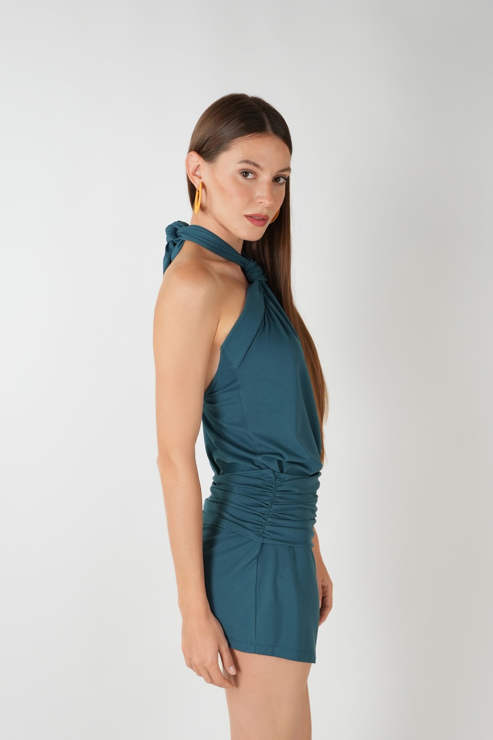 Zamansız bir siluet ve modern detayların buluştuğu bu mini elbise, ultra hafif ve yumuşak dokulu kumaşıyla hem şıklığı hem de rahatlığı bir araya getiriyor. Boyundan bağlamalı tasarımı ve sırt dekoltesiyle feminen bir duruş sunarken, yanlardaki büzgülü detaylar yalnızca vücut hatlarını vurgulamakla kalmaz, aynı zamanda elbisenin boyunu da isteğe göre ayarlama imkânı tanır. Bu sayede her vücut tipine uyum sağlar ve günün her anı için güçlü, kişiselleştirilebilir bir görünüm sunar.