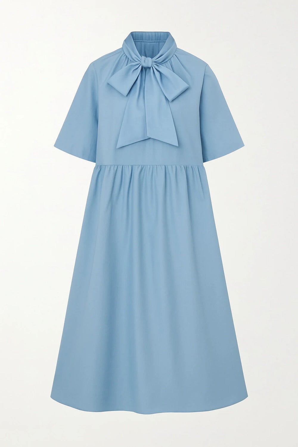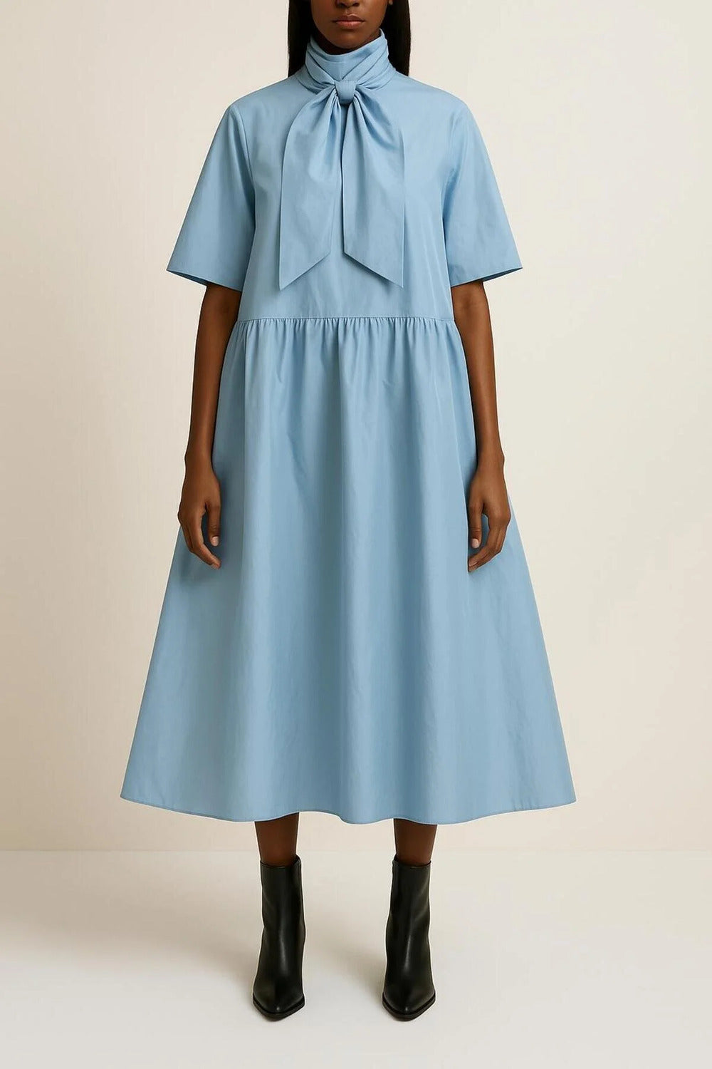 Büzgülü & Yakası Kuşakla Bağlama Detaylı A-Form Mavi Tafta Midi Elbise