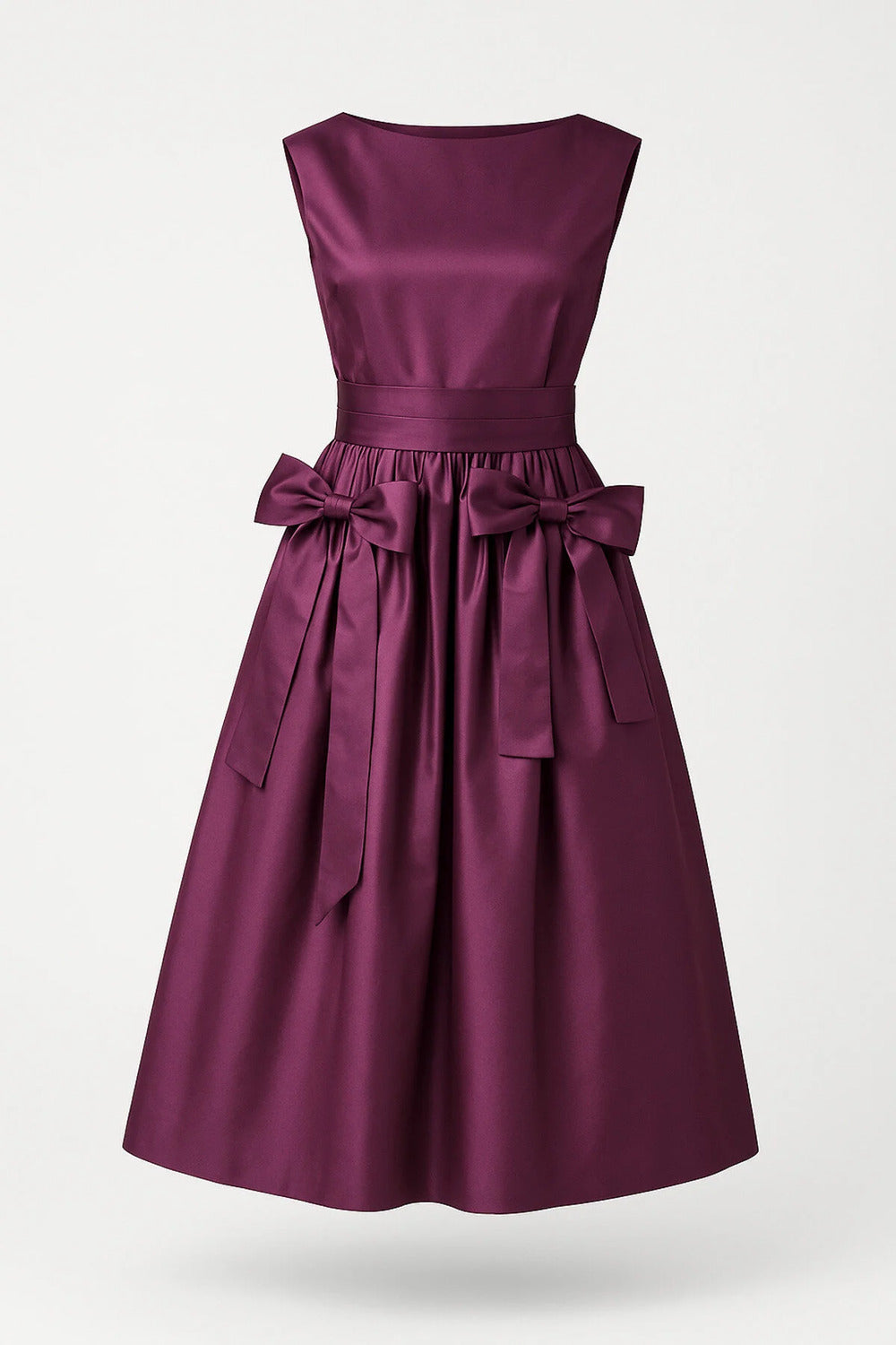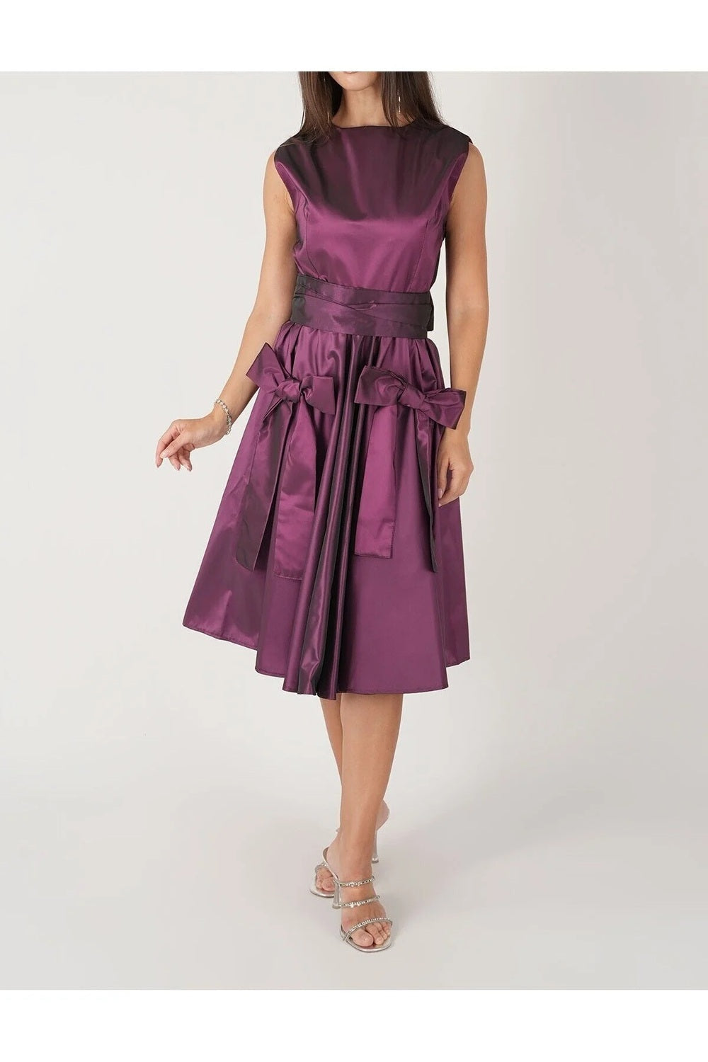 Çift Fiyonk Detaylı Tafta Midi Kolsuz Mürdüm Elbise