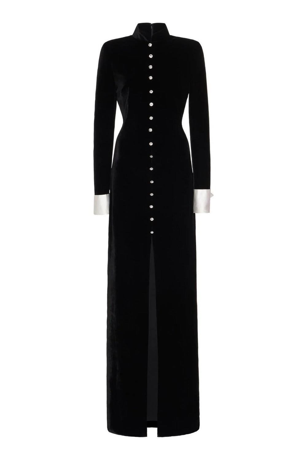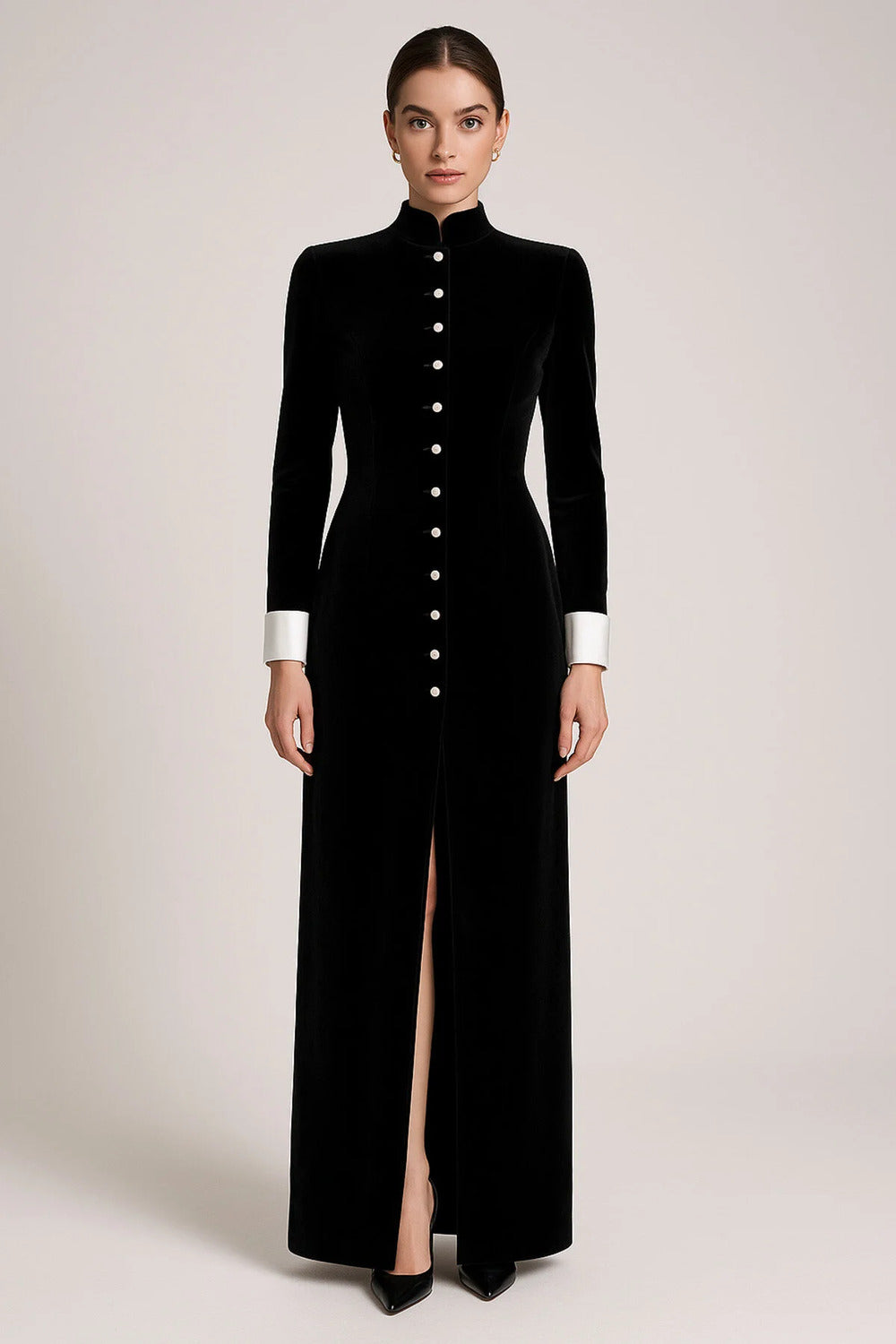 Dekoratif Düğme Detaylı Siyah Uzun Kollu Kadife Elbise