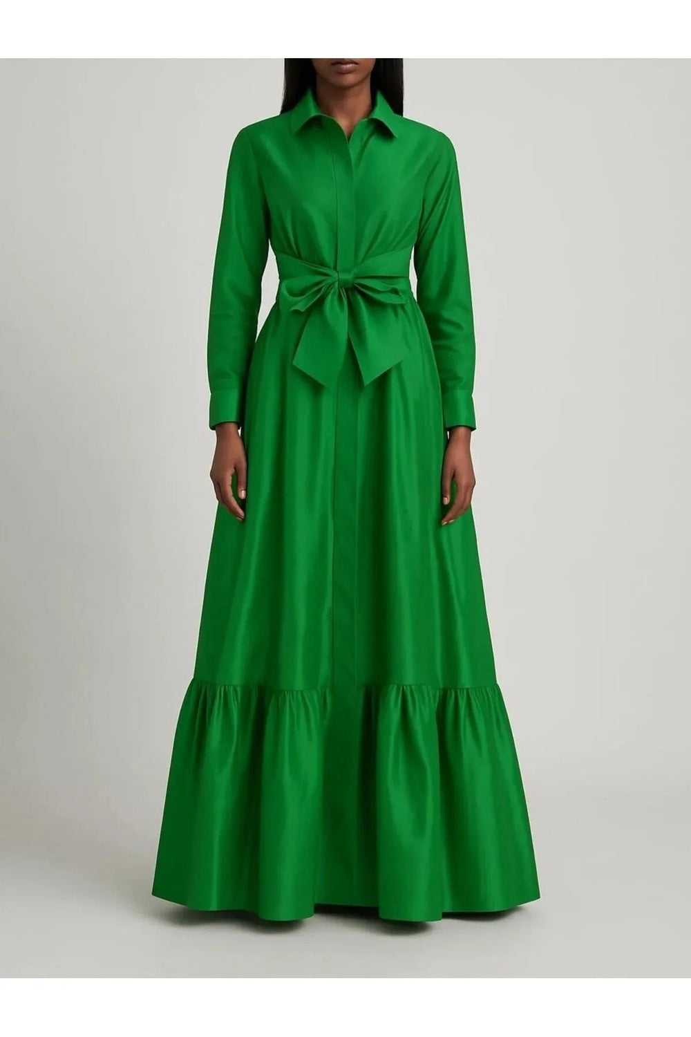 Etek Ucu Fırfırlı & Kuşaklı Maxi Boy Şık Yeşil Tafta Gömlek Elbise
