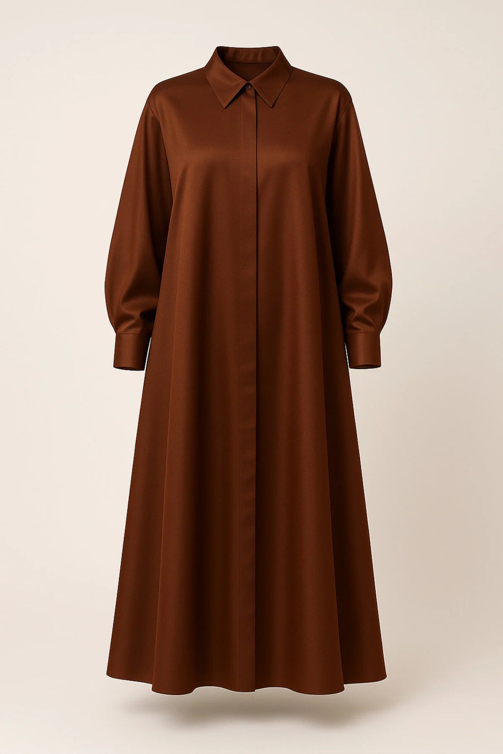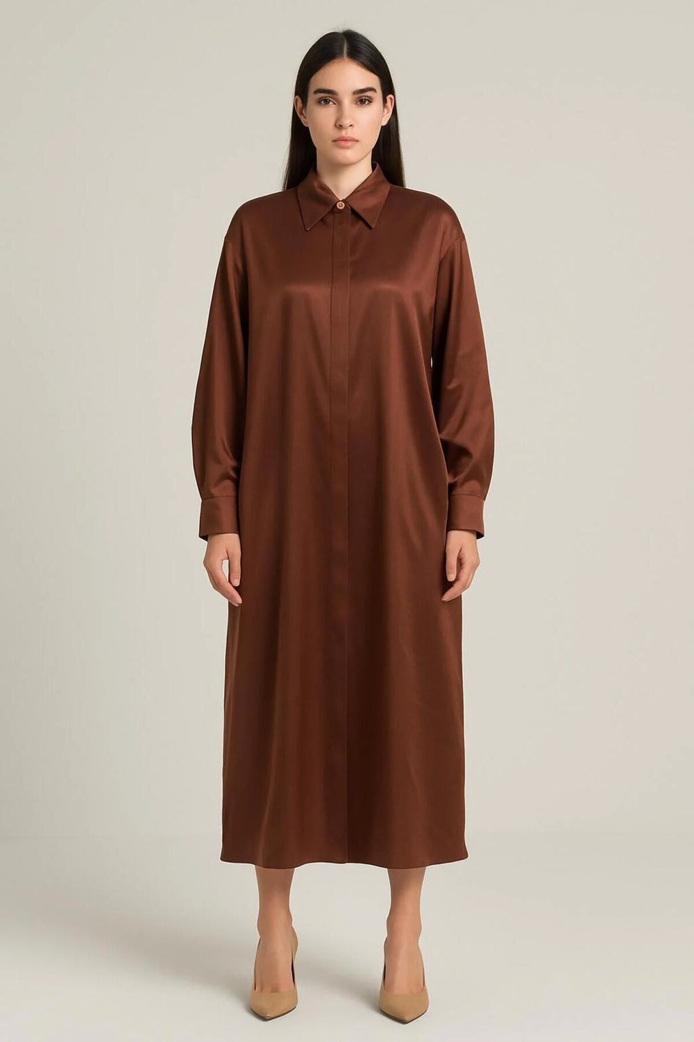 Kahverengi Saten A-Form Salaş Gömlek Elbise