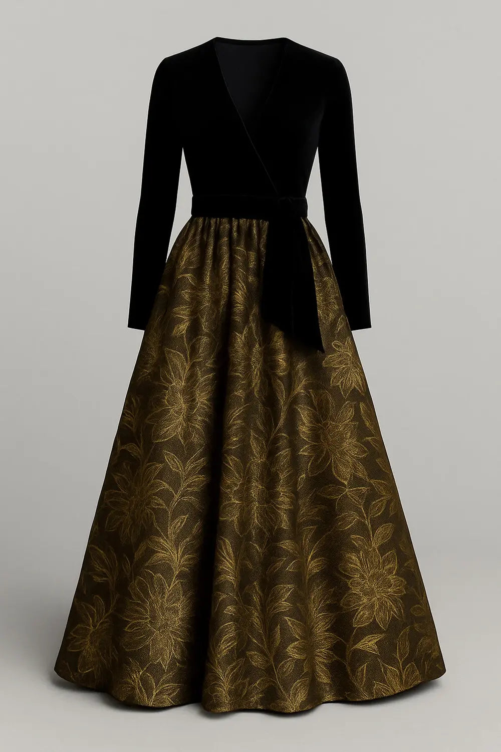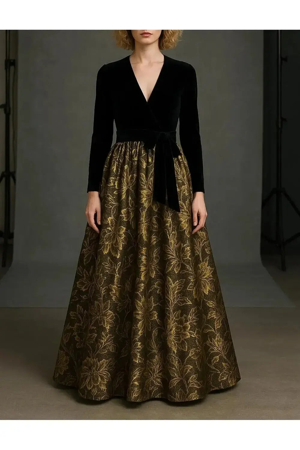 Kruvaze Üstü Siyah Kadife & Eteği Brokar Maxi Şık Elbise