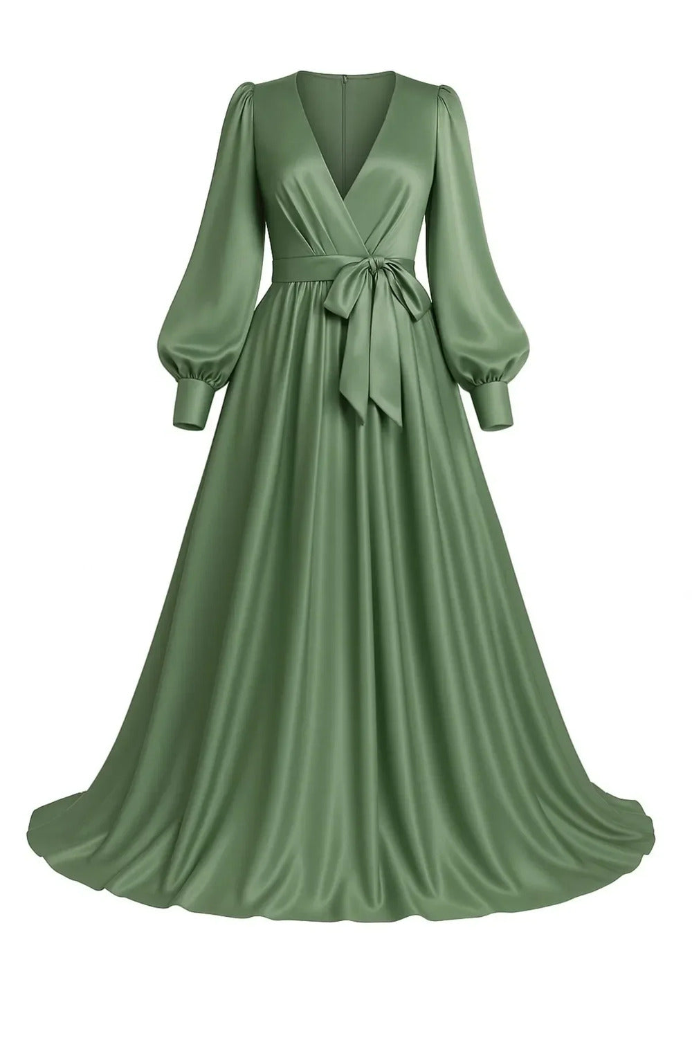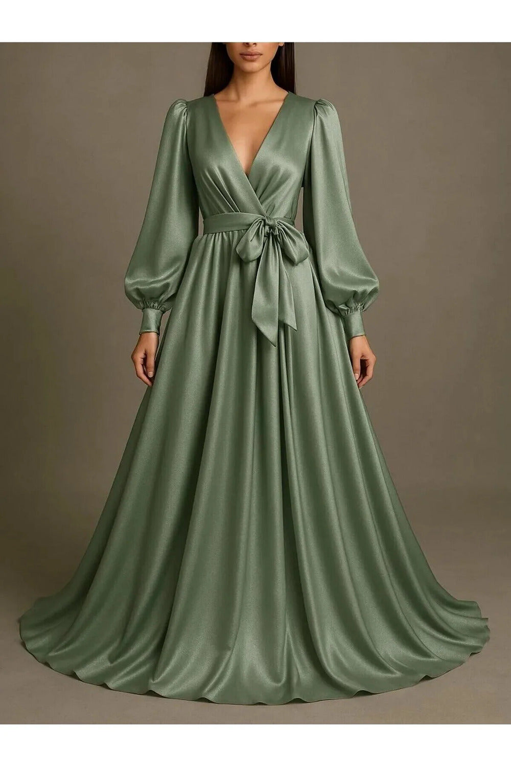 Kuşaklı, Kruvaze Kapamalı & Balon Kollu Mint Saten Maxi Şık Elbise