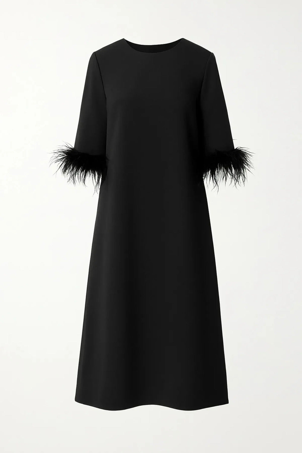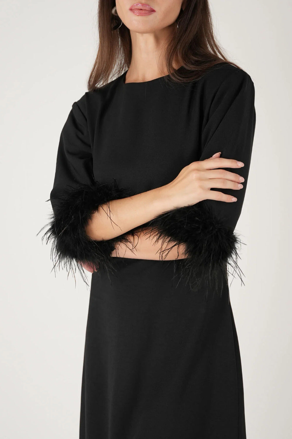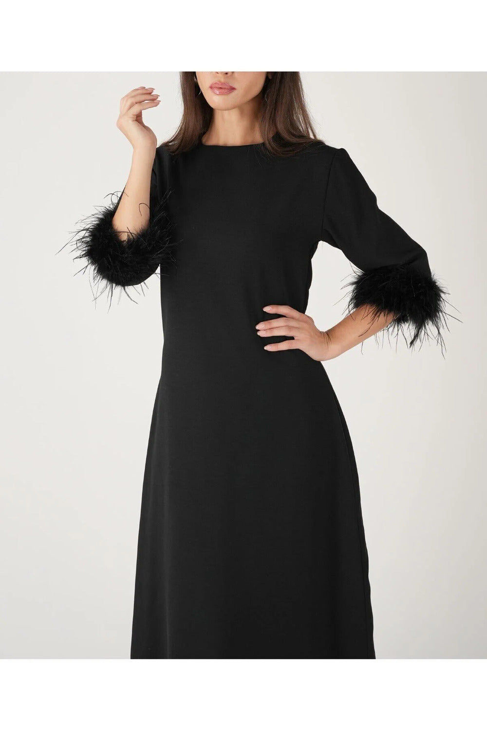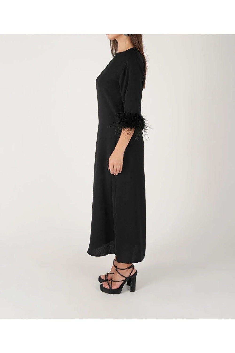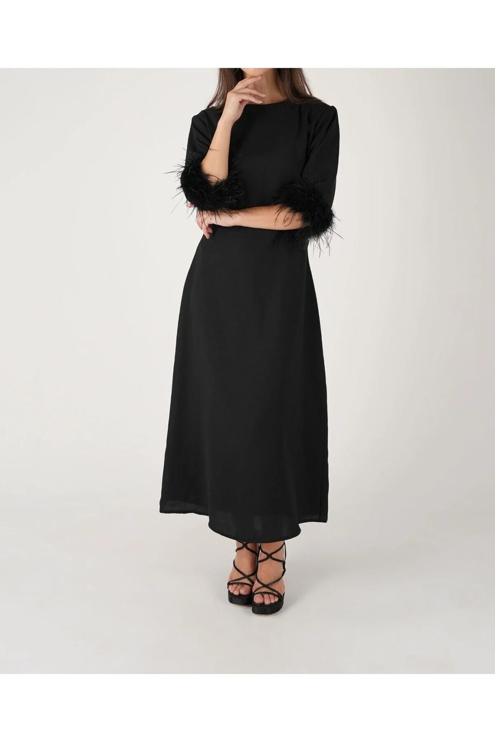 Otriş Detaylı Siyah Truvakar Kollu Midi Krep Elbise