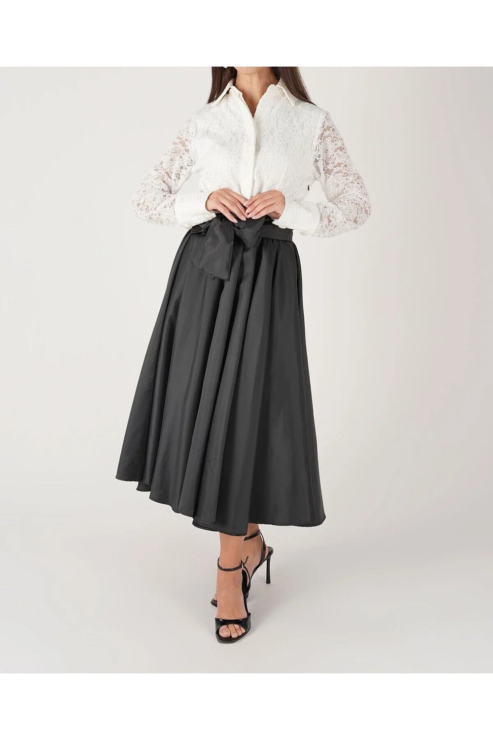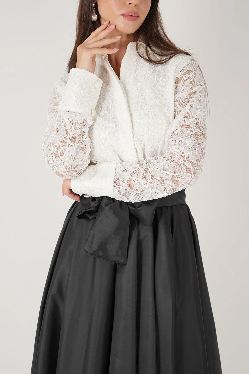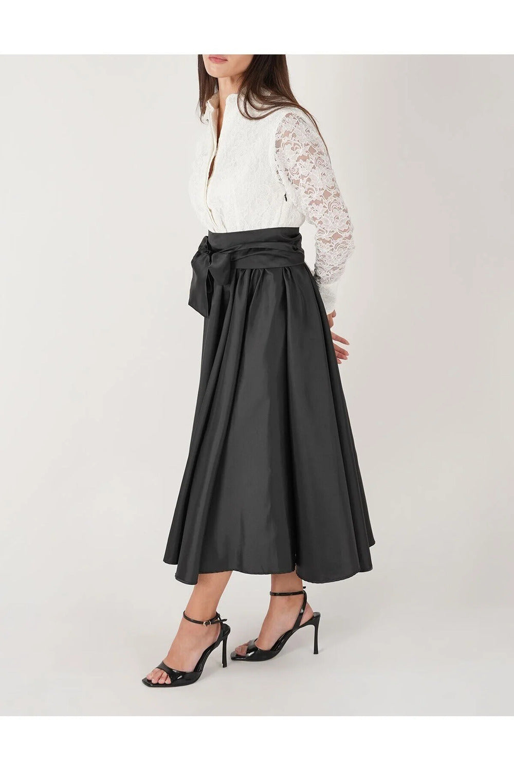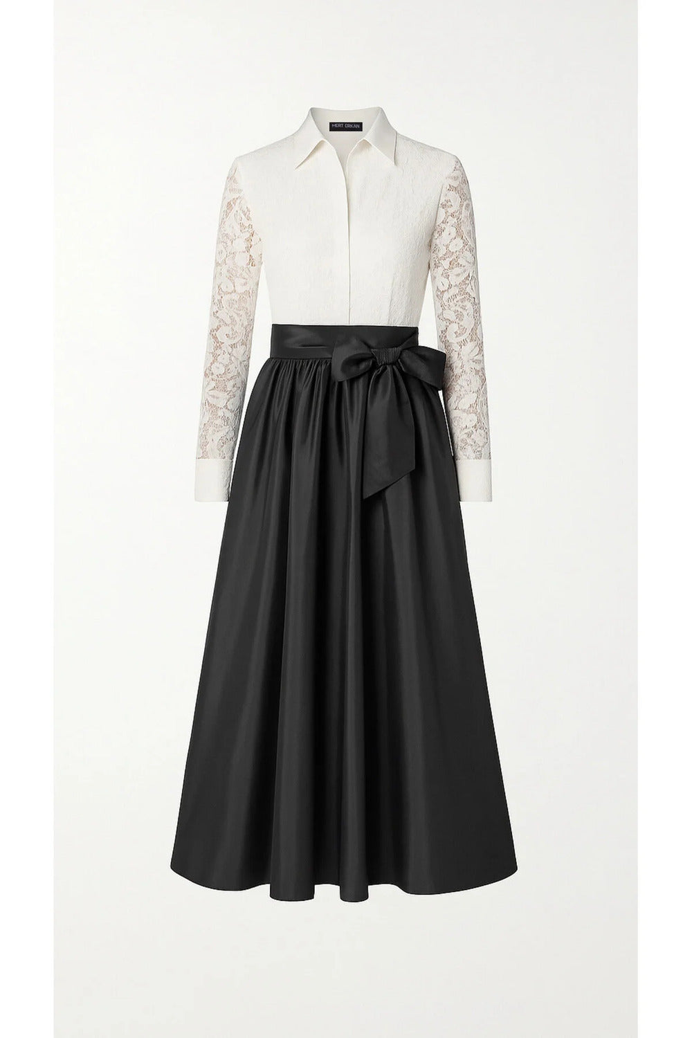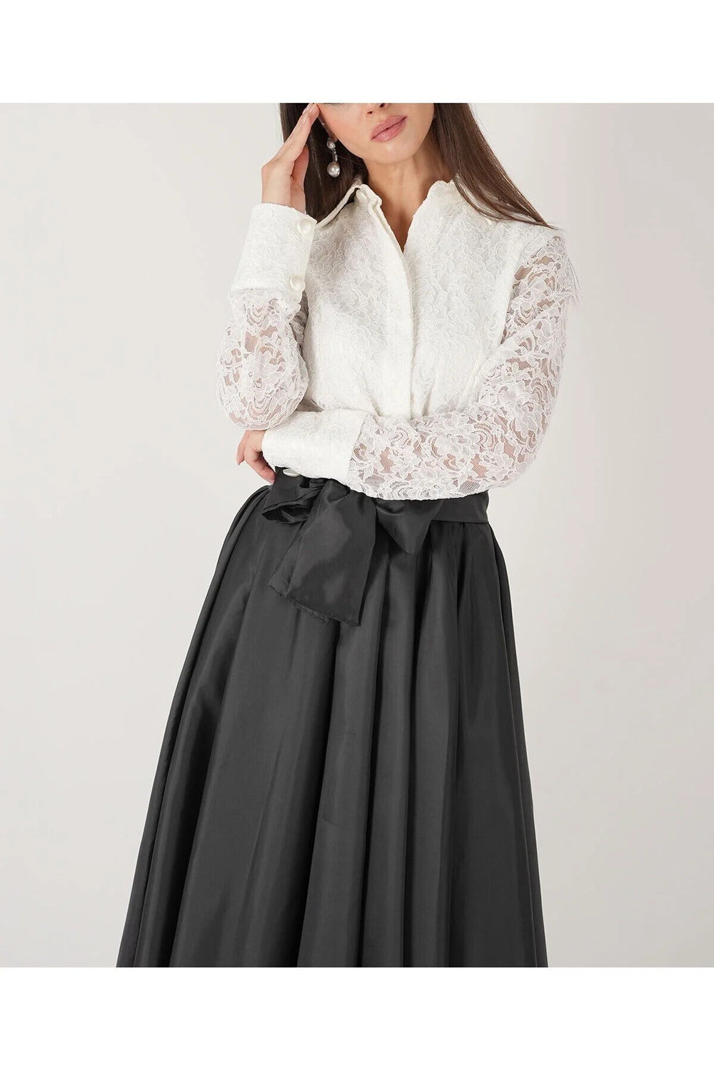 Üstü Beyaz Kordoneli Dantel & Eteği Siyah Tafta Midi Gömlek Elbise