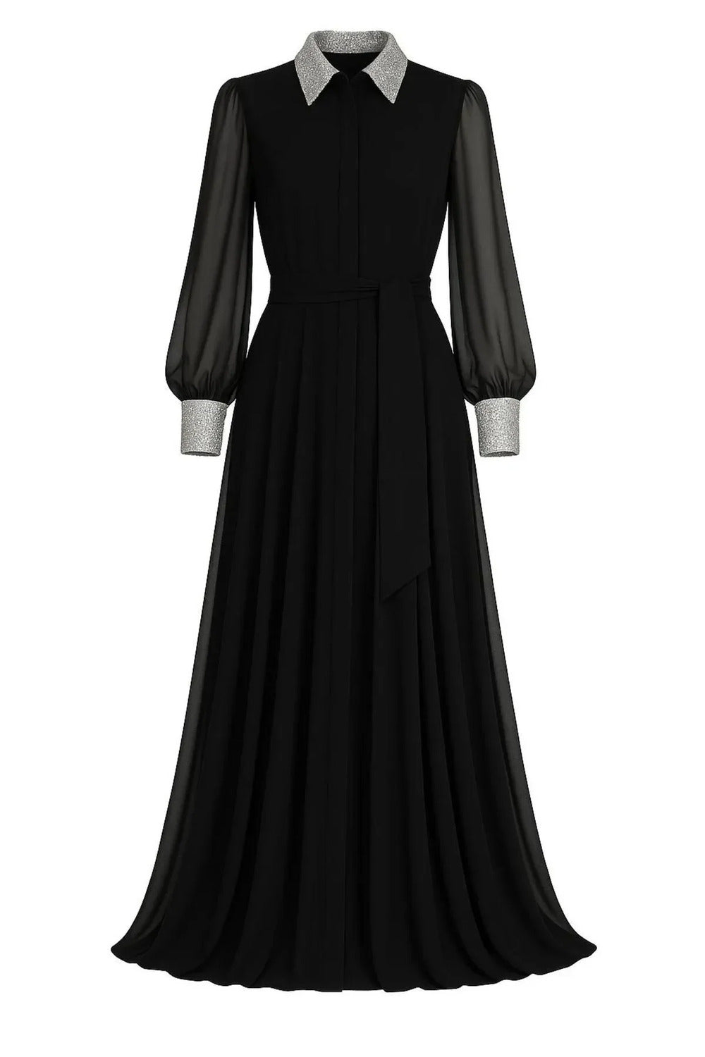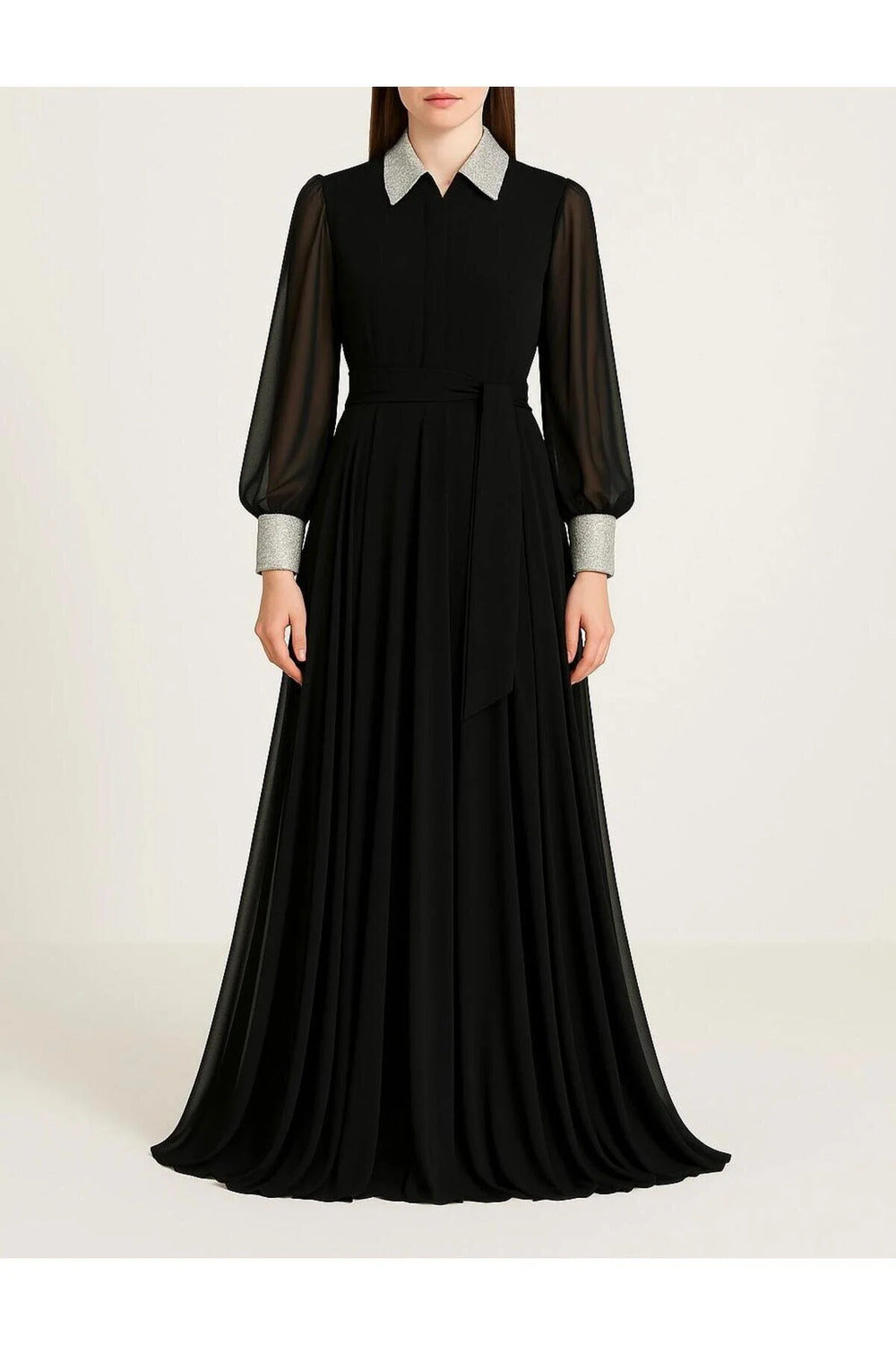 Yakası & Manşeti Silver Payet Detaylı Siyah Astarlı Şifon Gömlek Elbise