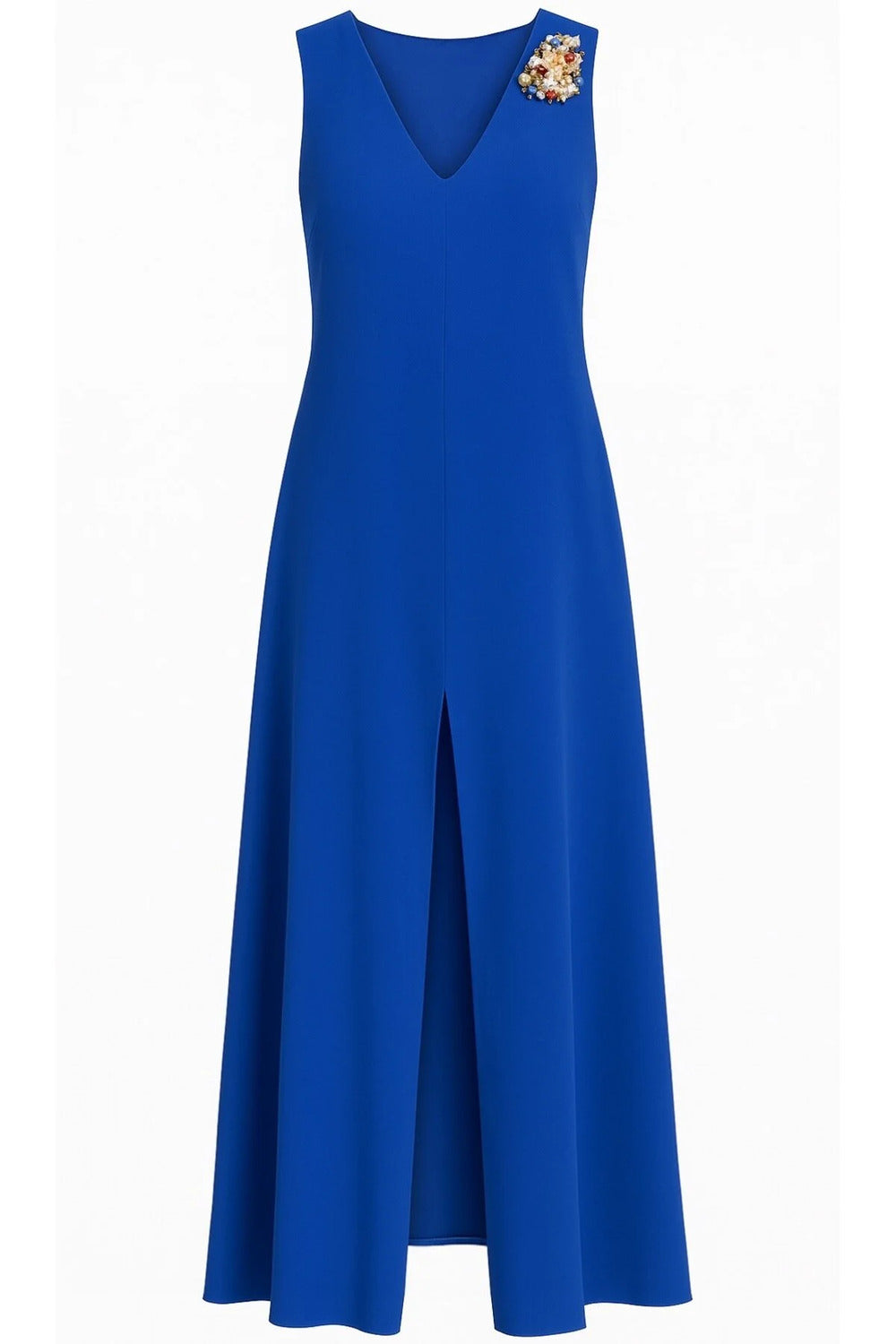 Yırtmaçlı & Patch Detaylı Saks Mavi Maxi Kolsuz Krep Elbise