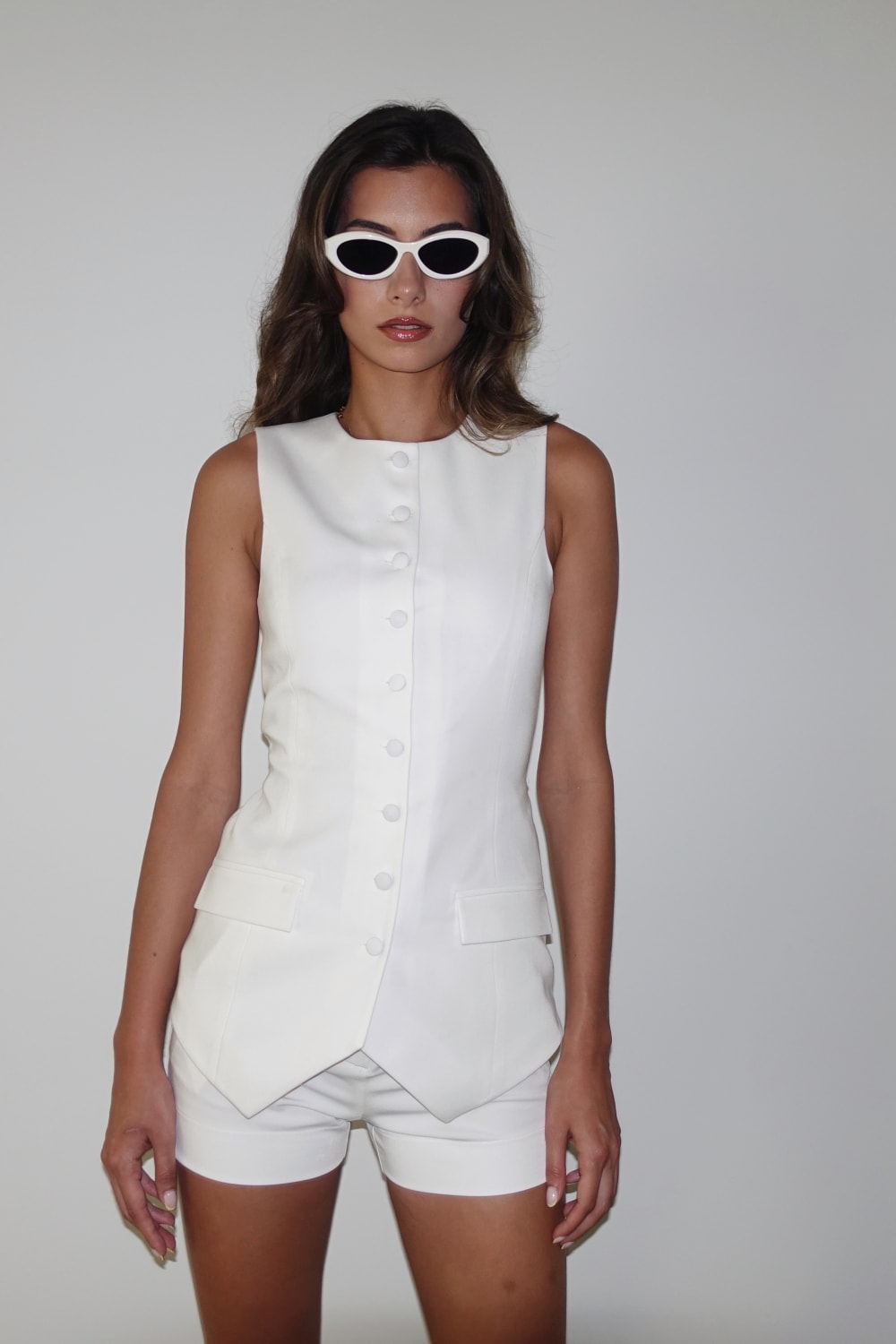Beyaz renkte, kolsuz ve dar kesim yelek. Yuvarlak yakaya sahip ve önde düğme kapama detayı mevcut. Bel kısmında ince bir kemerle vücuda oturan formunu pekiştirir. Üst kısmın alt kenarları sivri bir kesime sahiptir, klasik ceket görünümüne modern bir dokunuş katar. Kumaşı düz ve tok yapılıdır.
