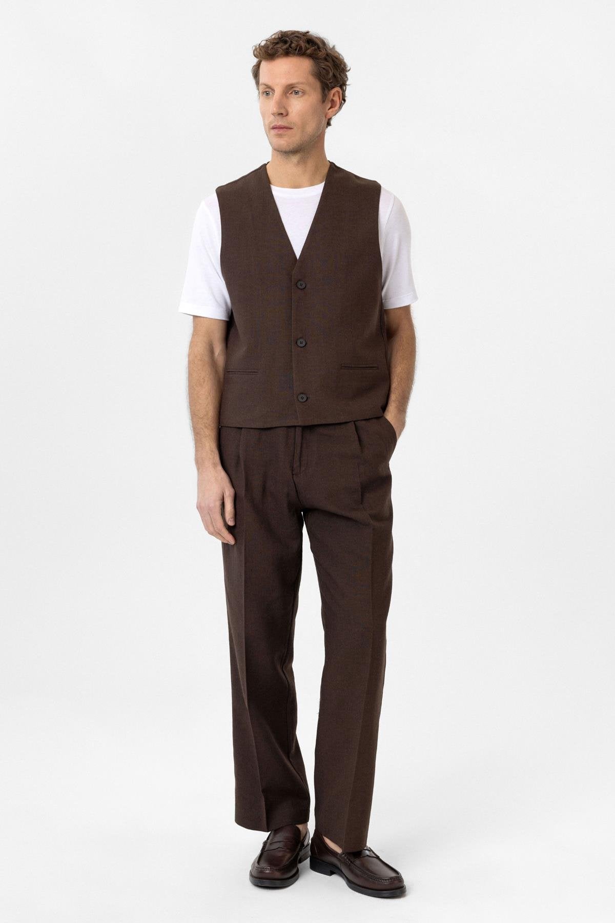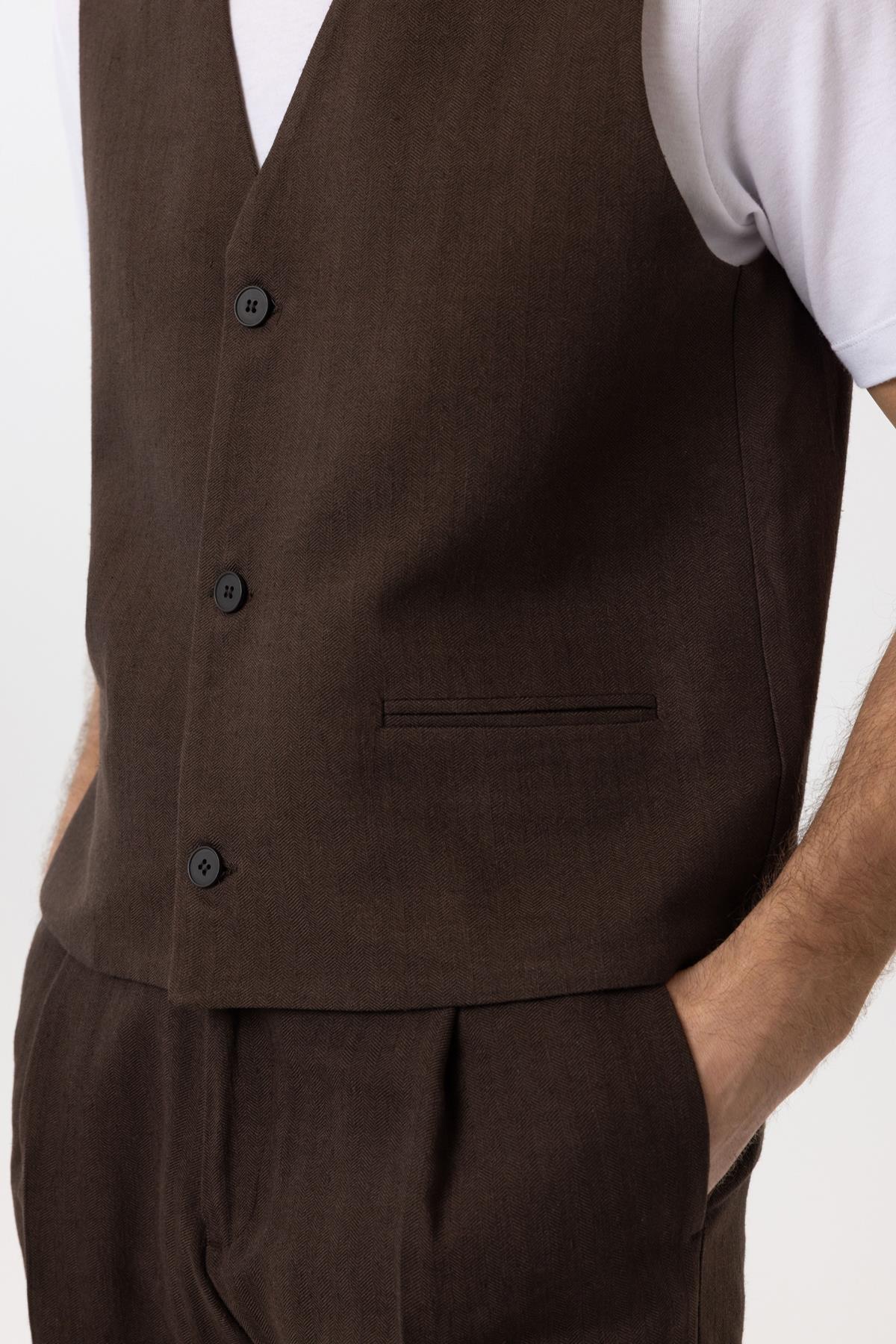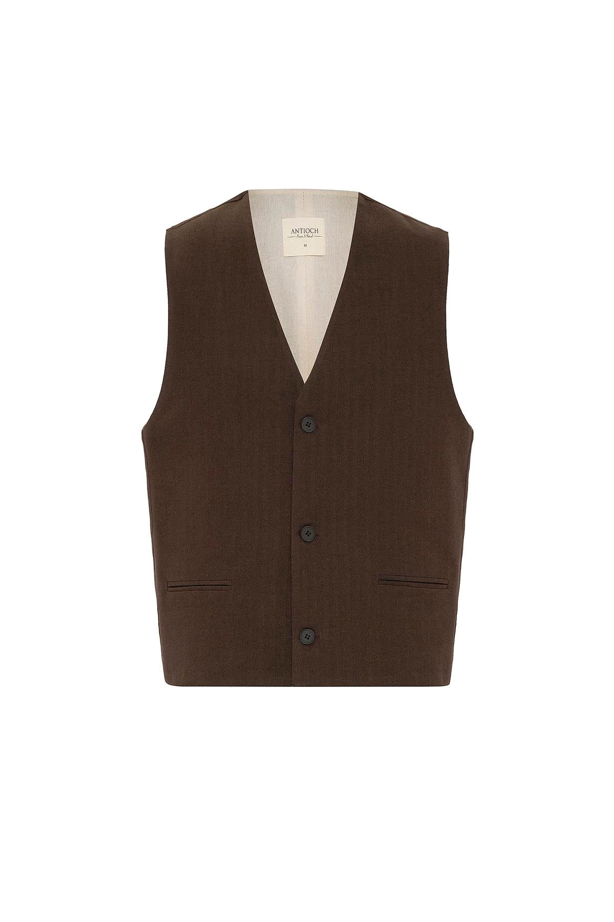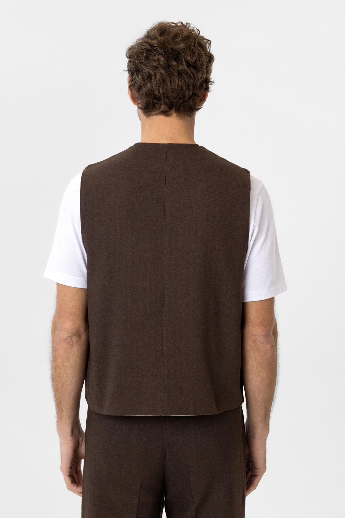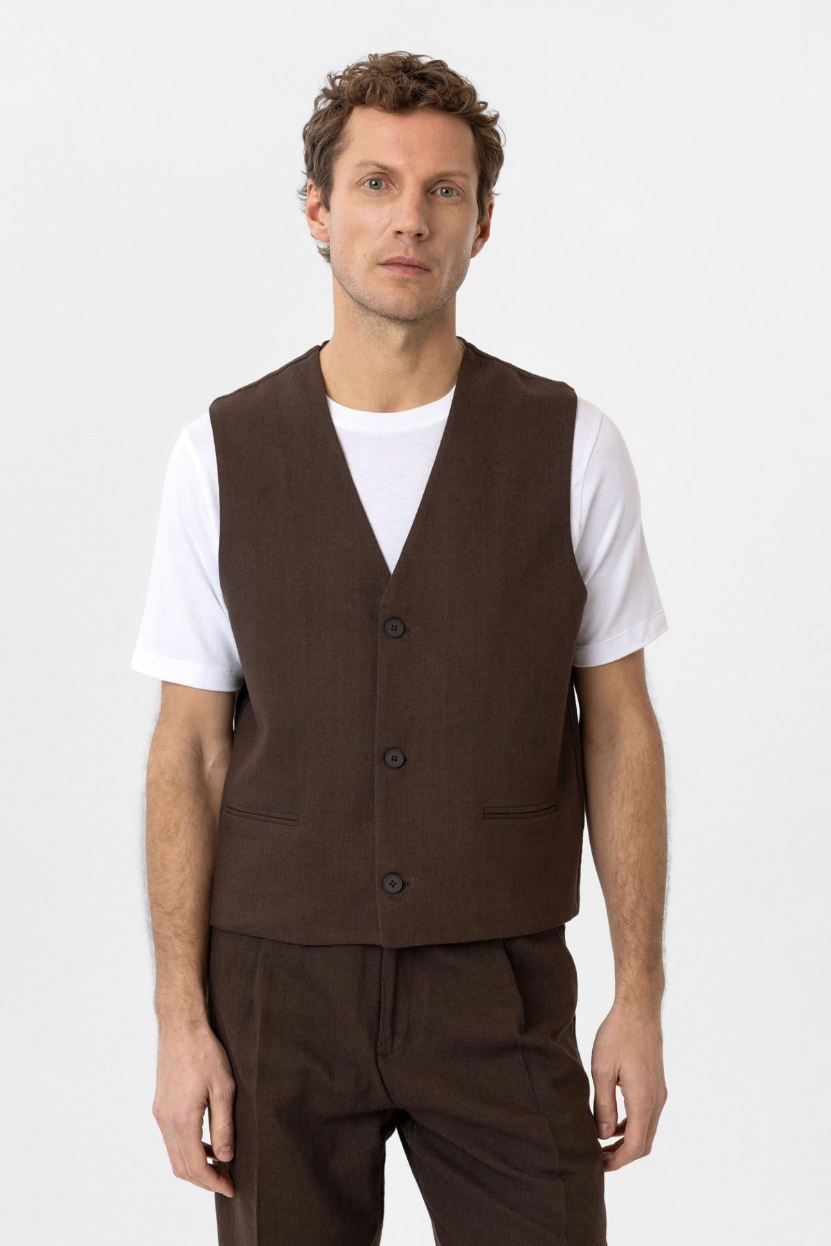 Kahve Relax Fit Keten Karışımlı Erkek Yelek