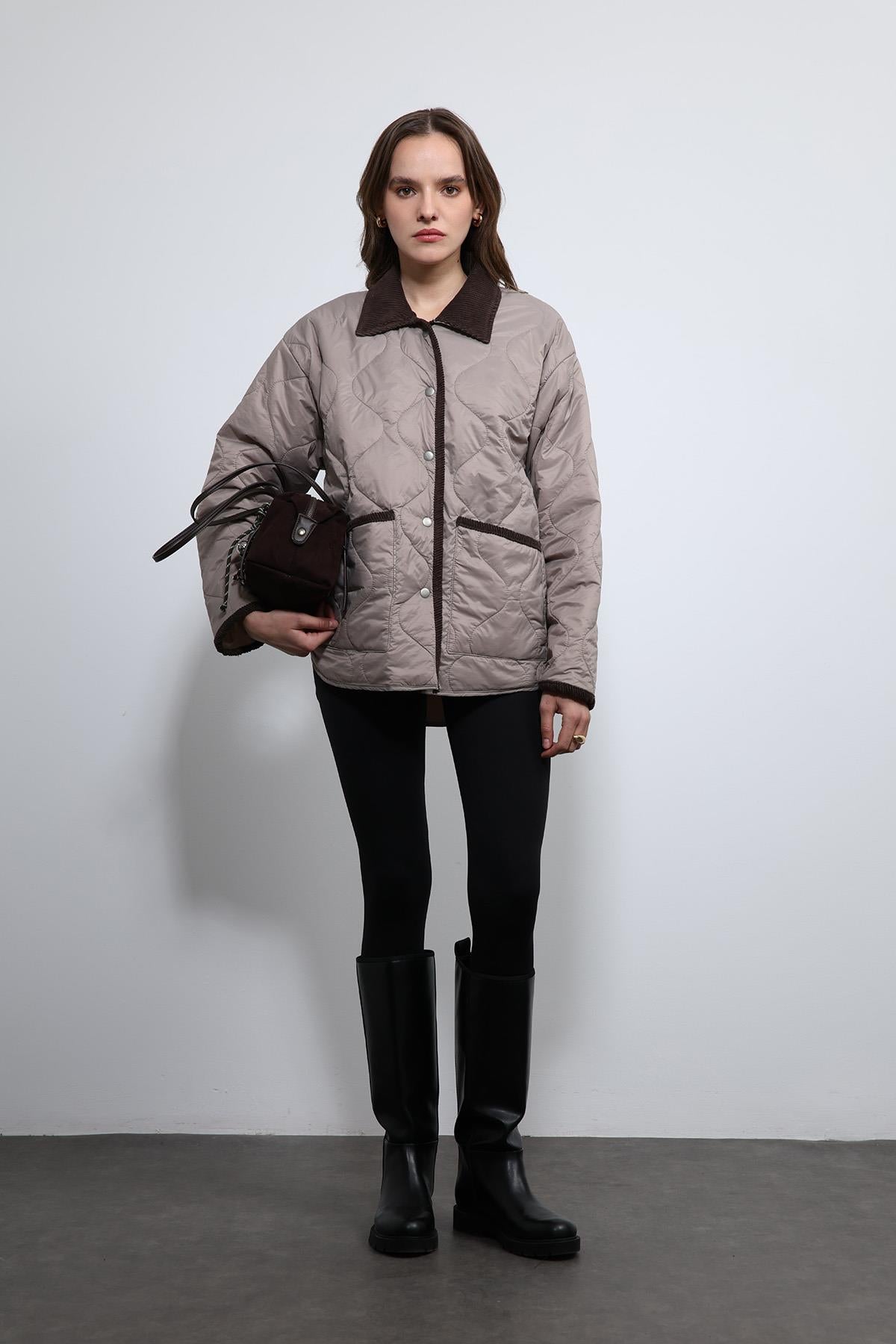 Bej Kontrast Yaka Desenli Mont