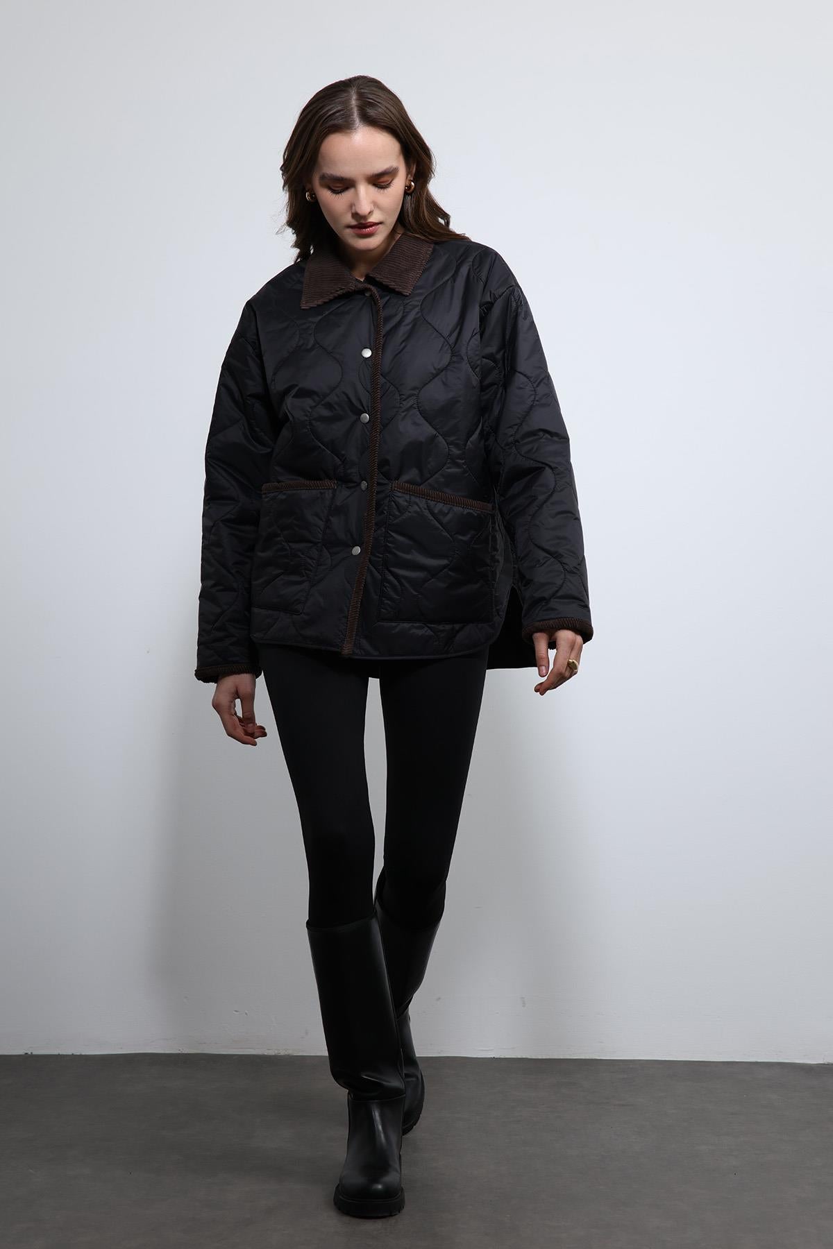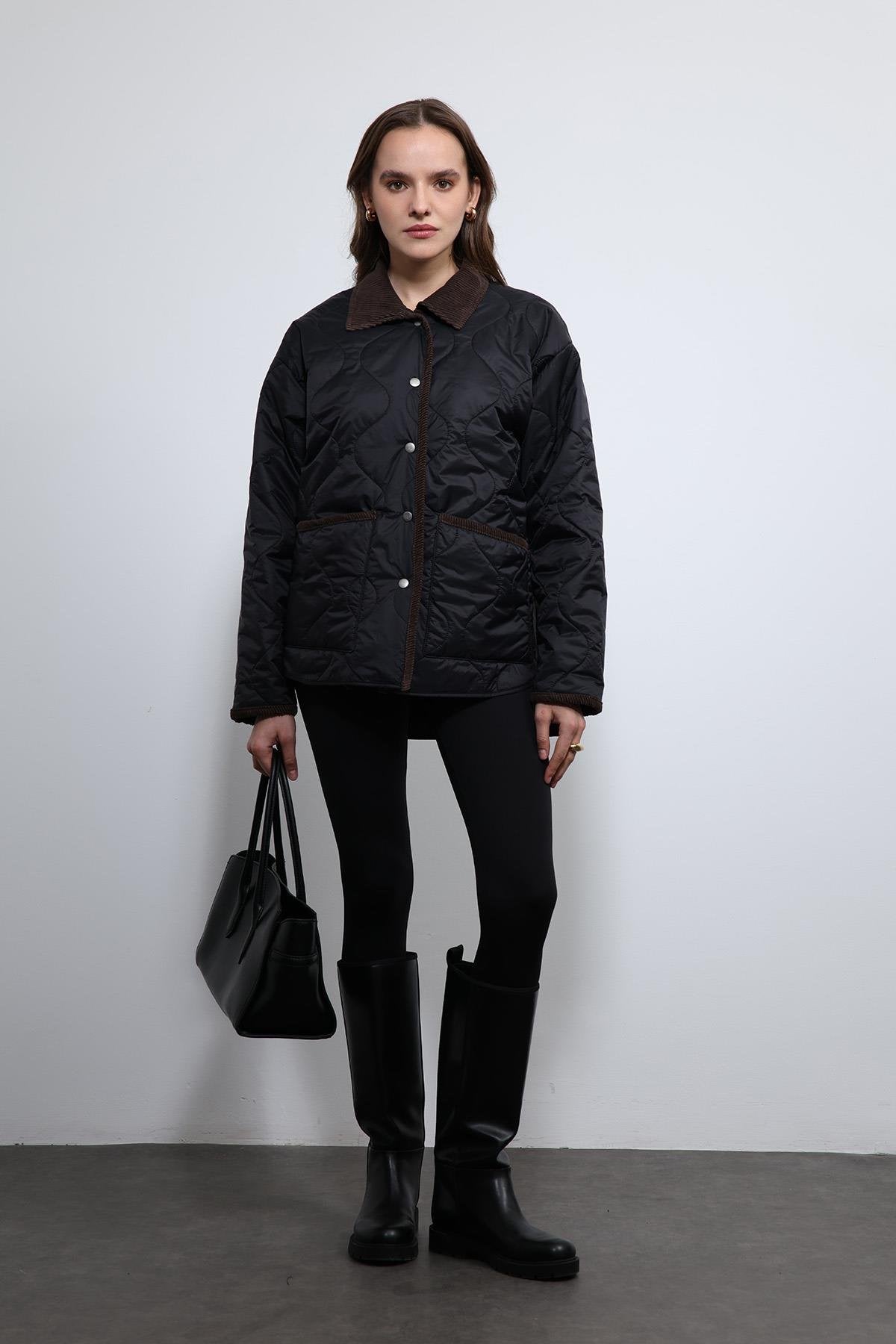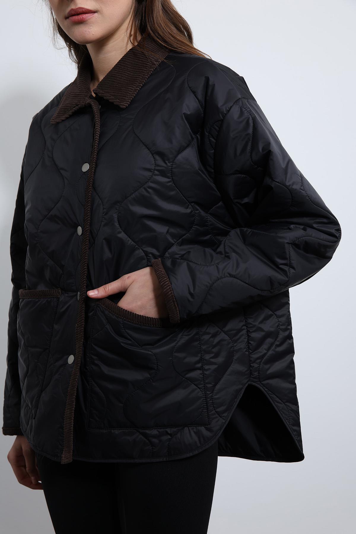 Siyah Kontrast Yaka Desenli Mont