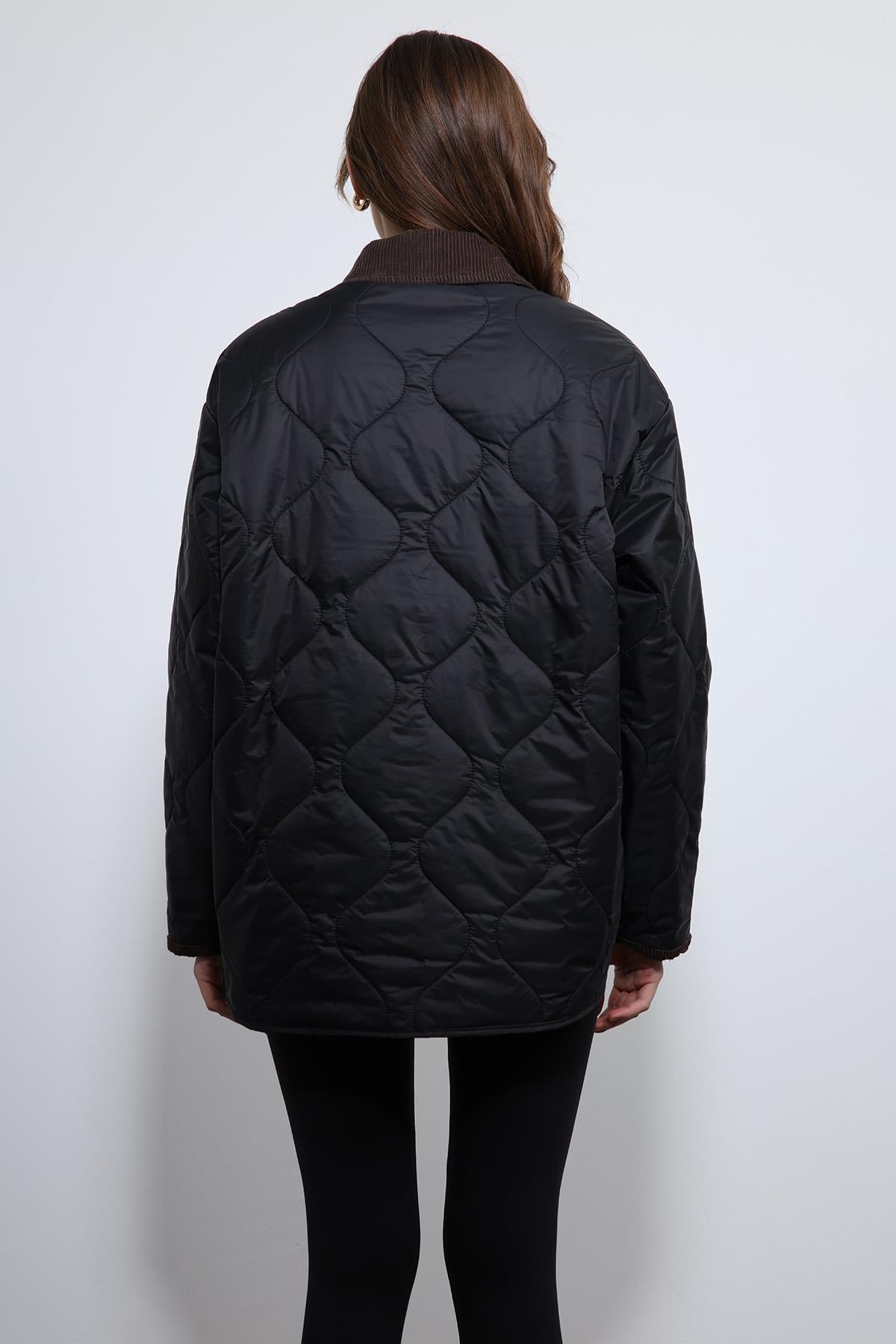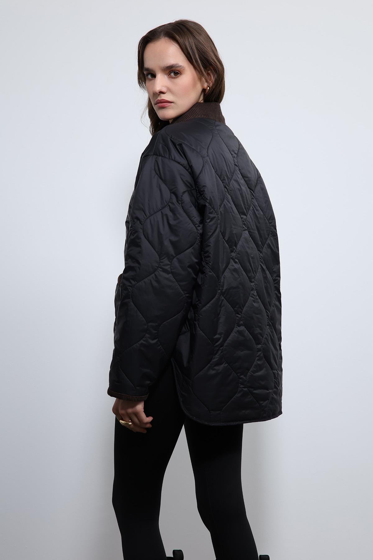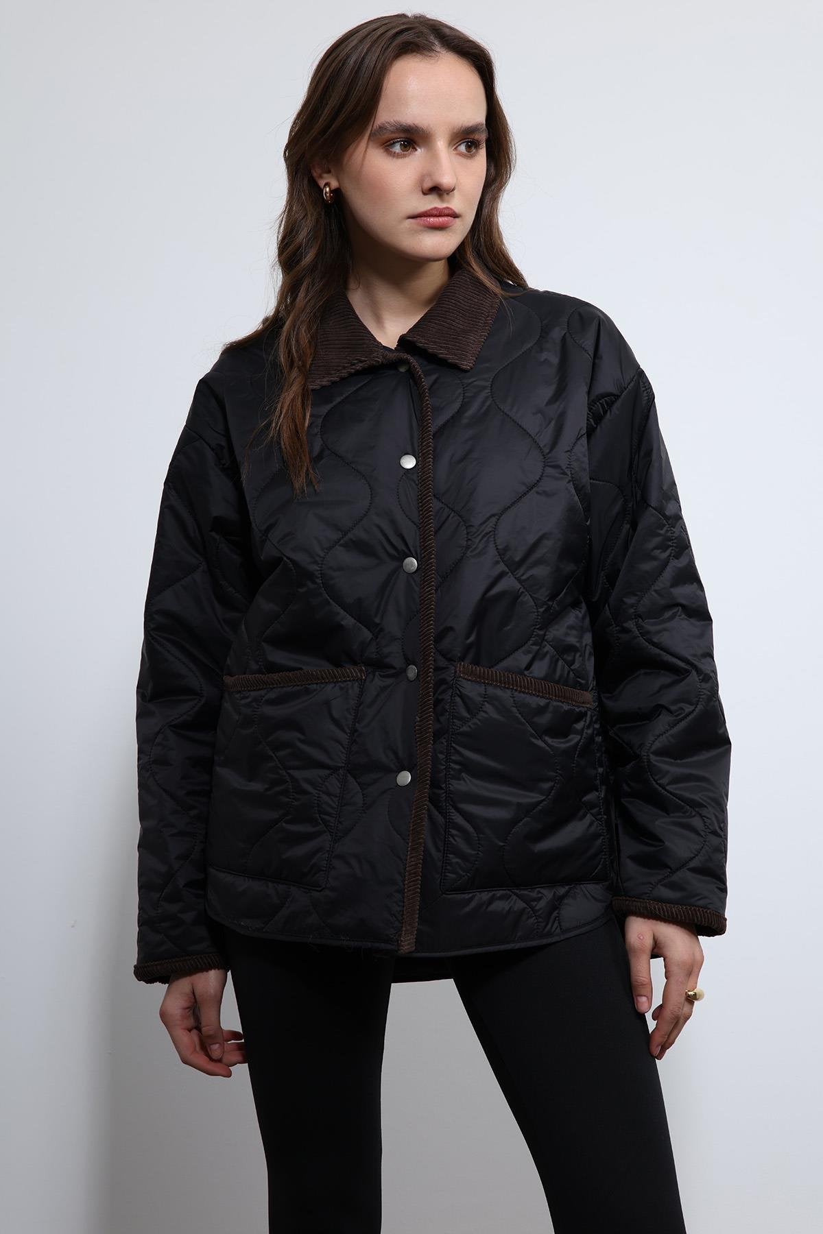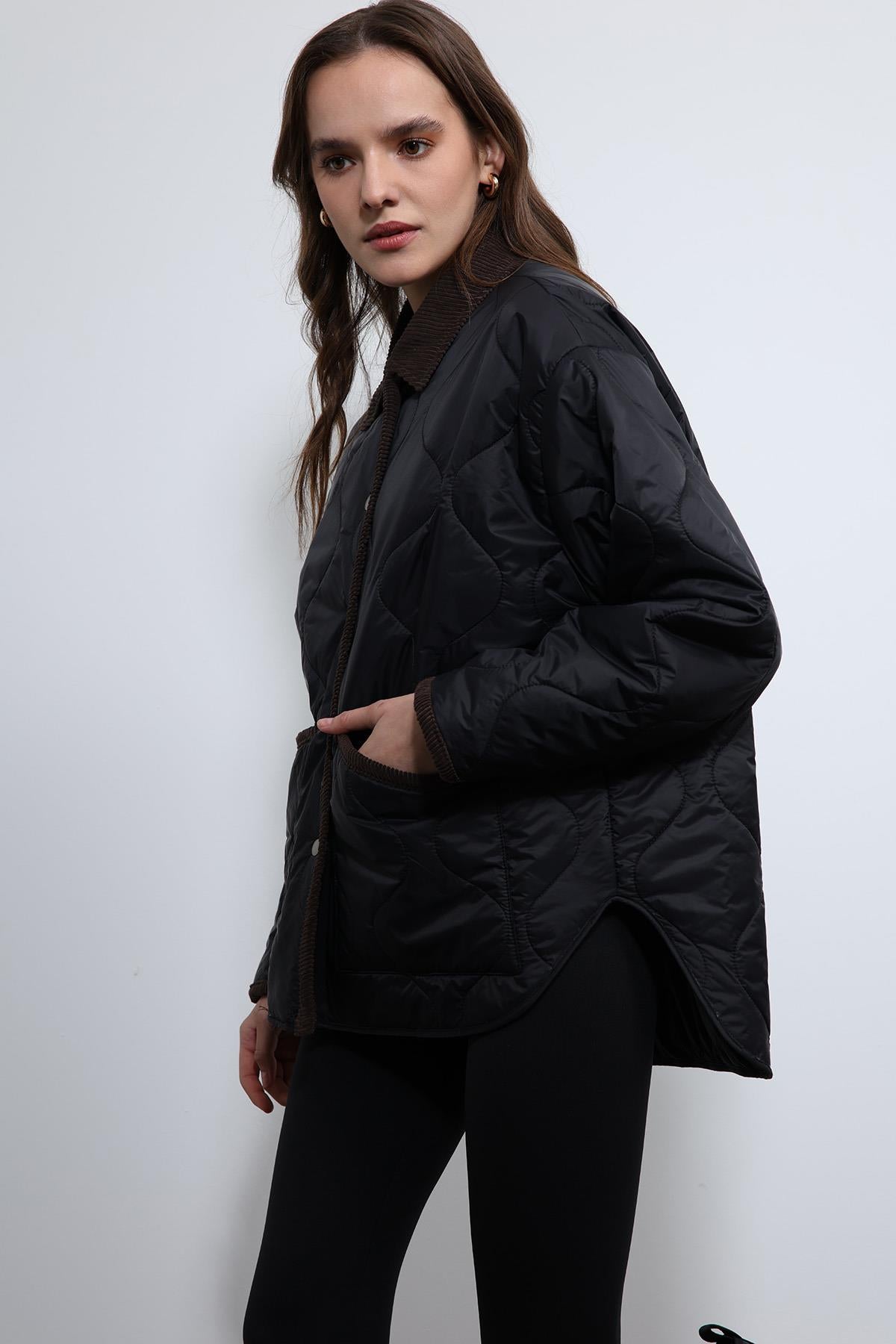 Siyah Kontrast Yaka Desenli Mont