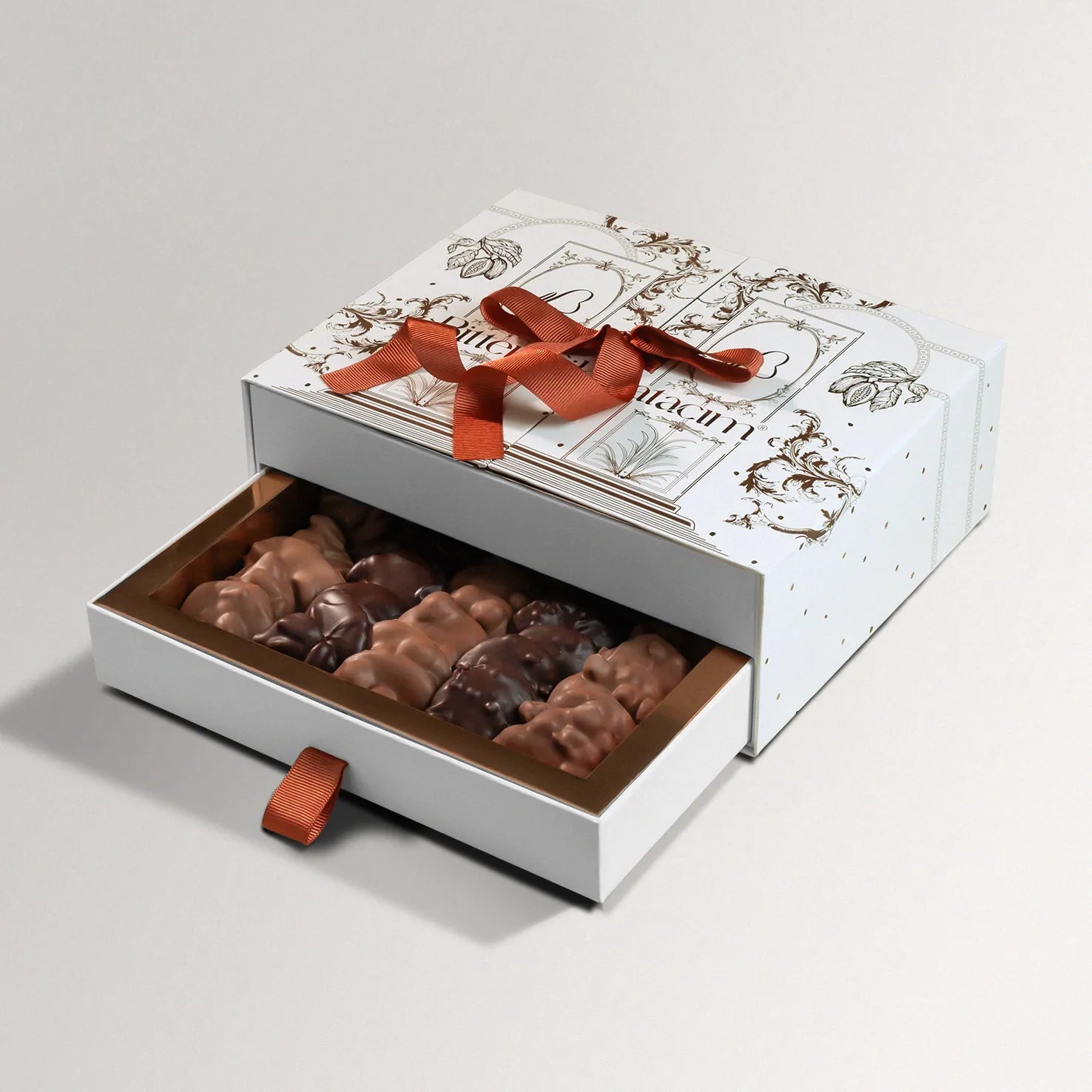 Şık ve kullanışlı çekmeceli kutusunda sunulan bu özel karışım; sütlü, bitter ve beyaz çikolatanın en seçkin çeşitlerini bir araya getiriyor. Özenle seçilmiş malzemelerle hazırlanan çikolatalar, hem göze hem damağa hitap eden zarif bir ikram alternatifi sunar.