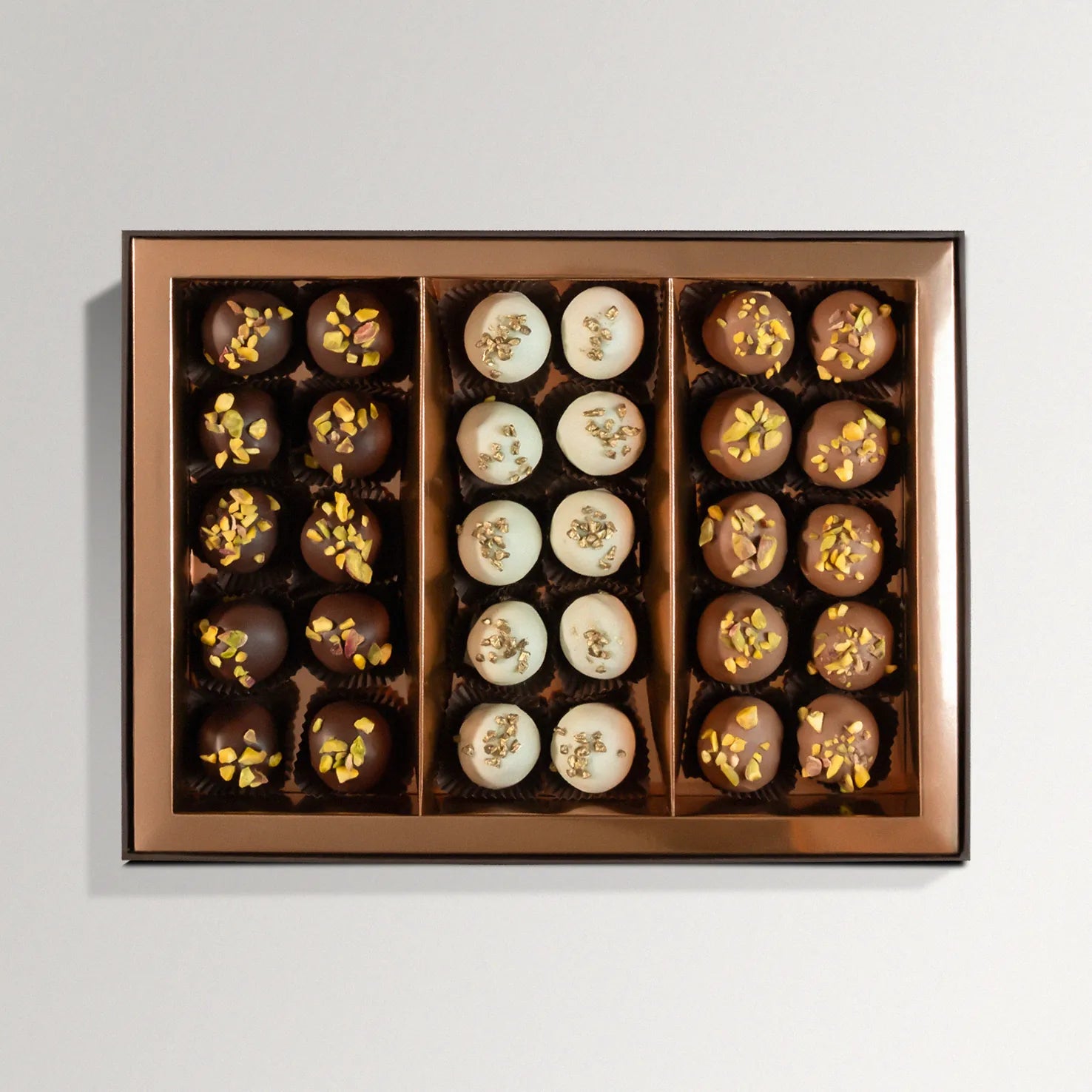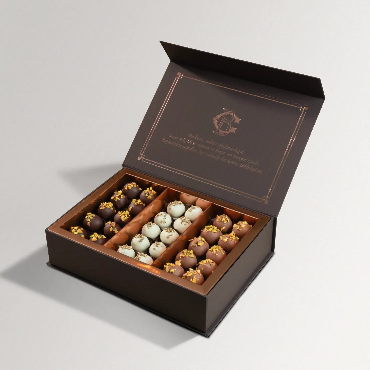 Sütlü, bitter ve beyaz çikolatanın en özel trüf tarifleriyle buluştuğu bu karışım, her damağa hitap eden zengin bir lezzet deneyimi sunar. Yoğun aroması, yumuşak dokusu ve özenle hazırlanan iç dolgularıyla sevdiklerinize hediye etmek ya da kendinizi şımartmak için ideal bir tercihtir.