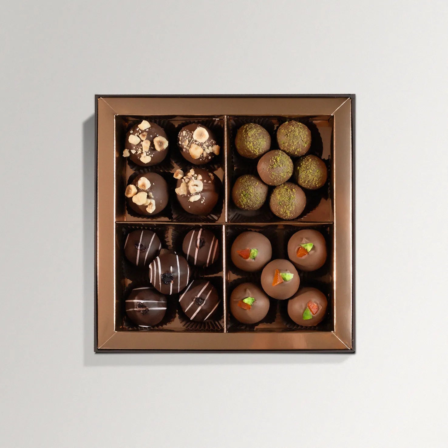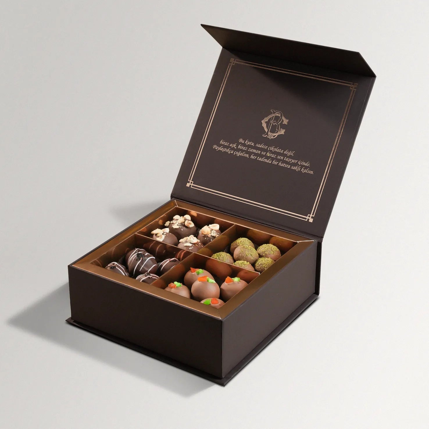 Özenle hazırlanmış sütlü ve bitter çikolataların bir araya geldiği Trüf Karışık, yoğun aroması ve yumuşak dokusuyla çikolata tutkunlarının favorisi olmaya adaydır. Her lokmada özel lezzet ve kaliteyi hissettiren bu seçkin ürün, şık sunumuyla da dikkat çeker.