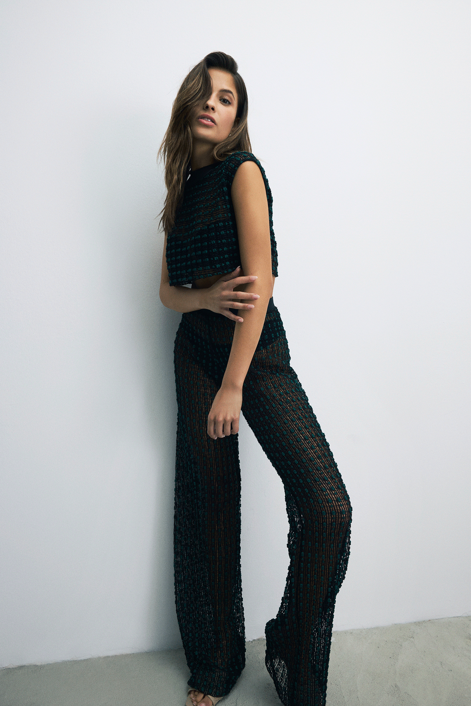 Model'in ölçüleri: Boy 174 cm, Göğüs 85 cm, Bel 60 cm, Kalça 89 cm