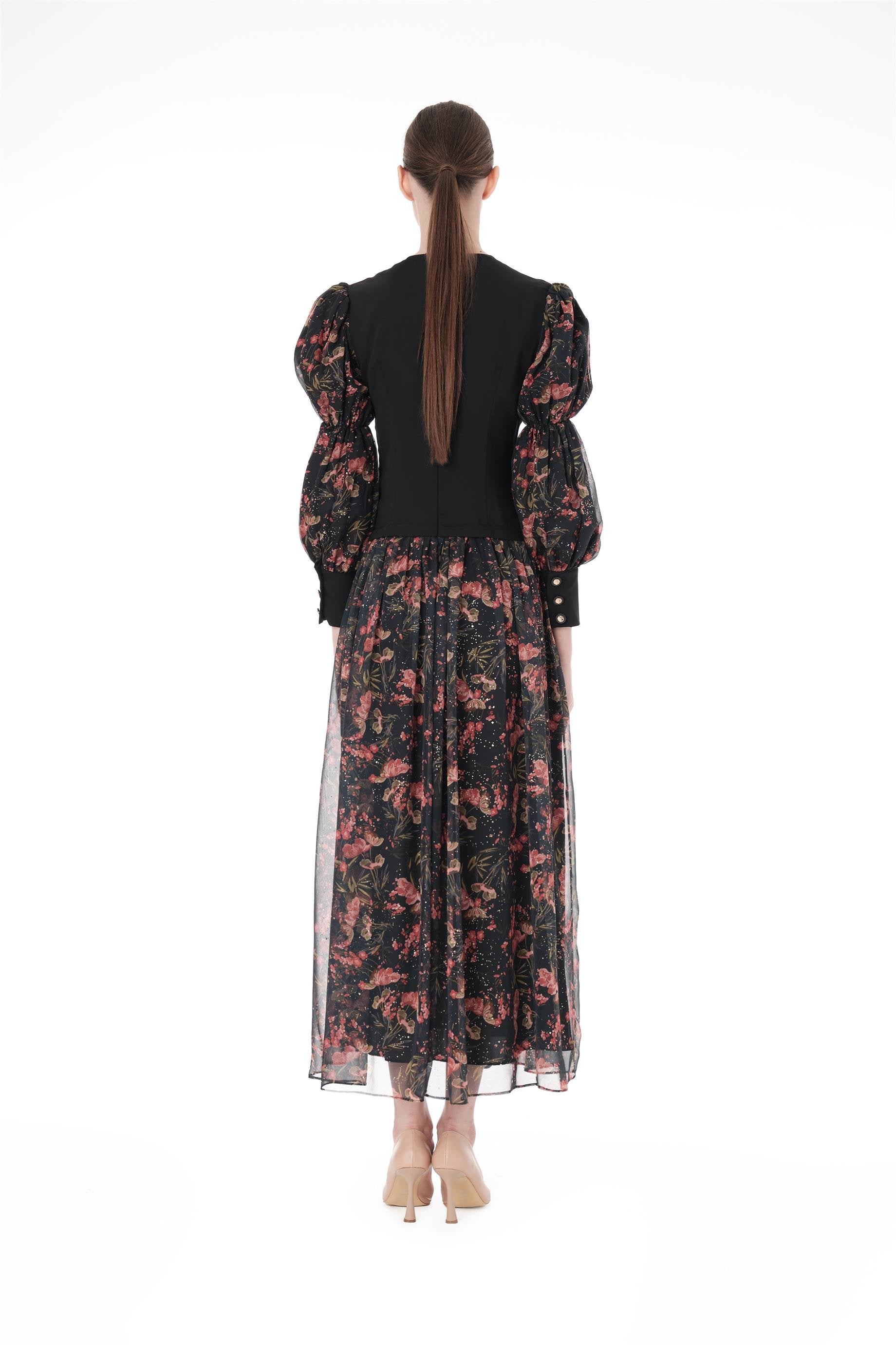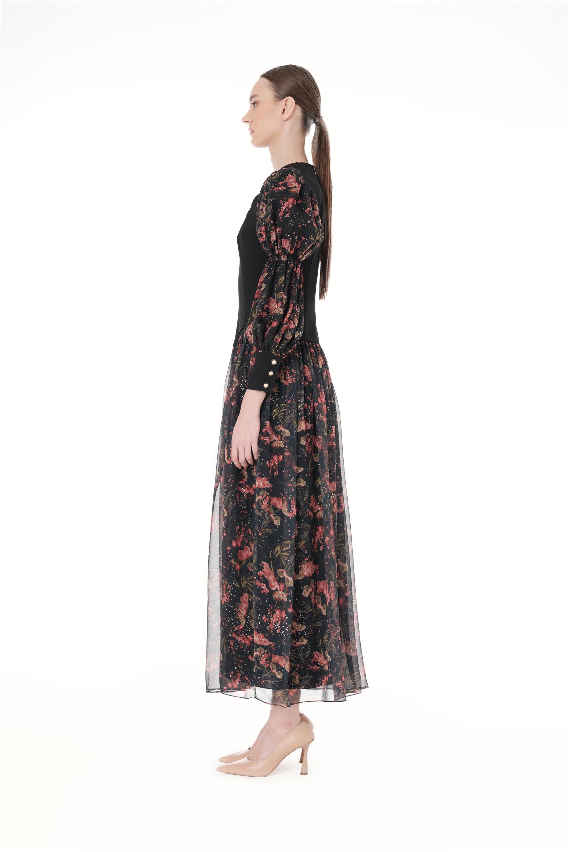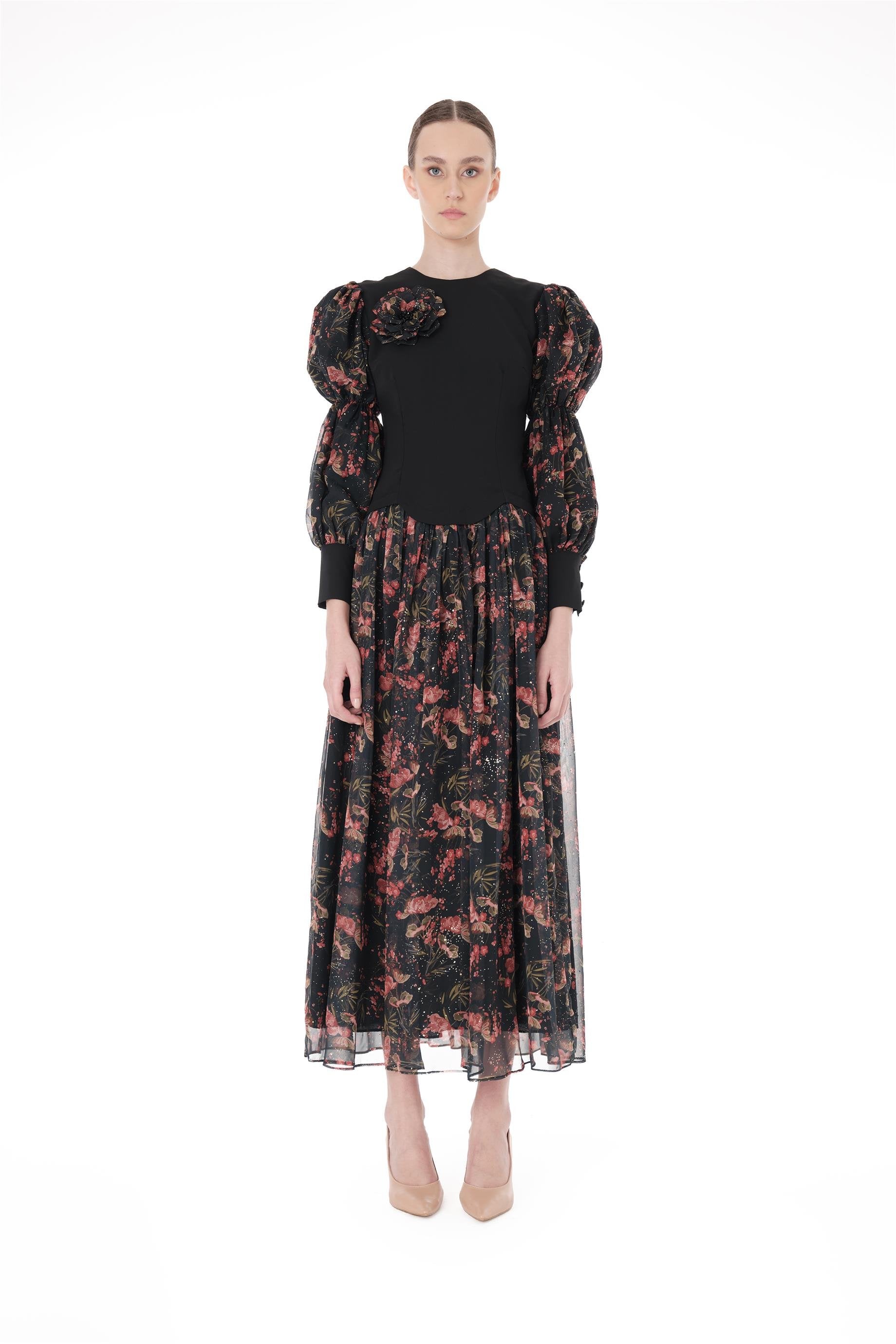 - Ürün Açıklaması: Basen kısmına kadar oturan, eteği büzgülü. Lazer kesimli gül broş detaylı. Manşeti gold detaylı düğme kapamalı. Arkadan fermuar kapamalı uzun elbise.