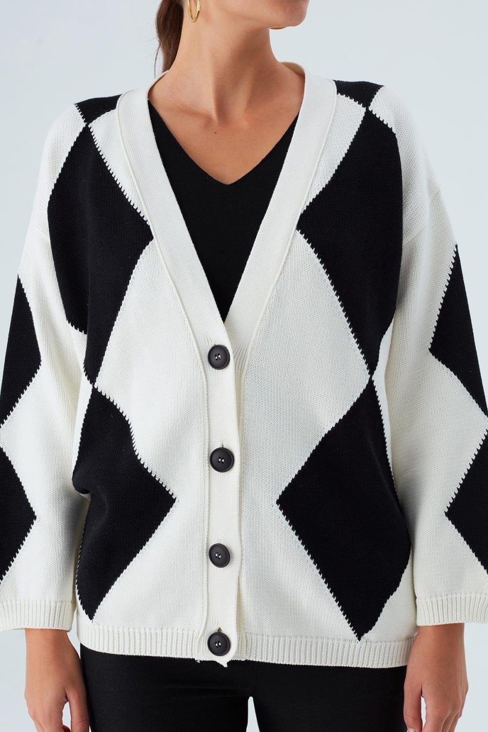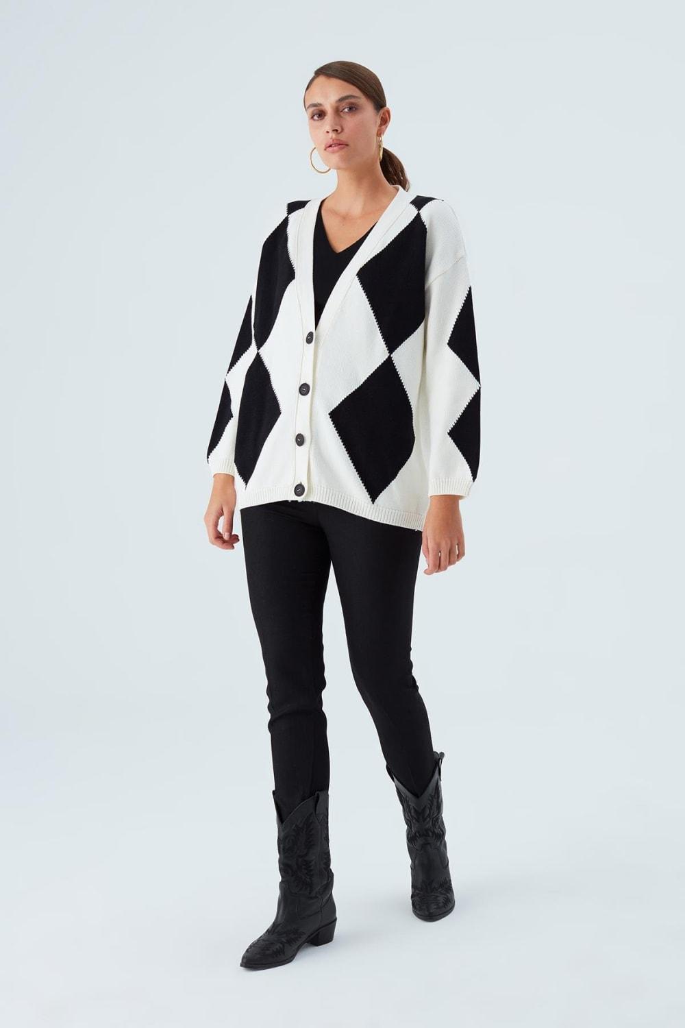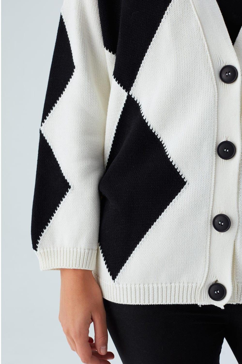 Irene Cardi̇gan Large Diamond Patterned Loose Cut Seasonal Women's Knitwear Cardigan Ecru/Black