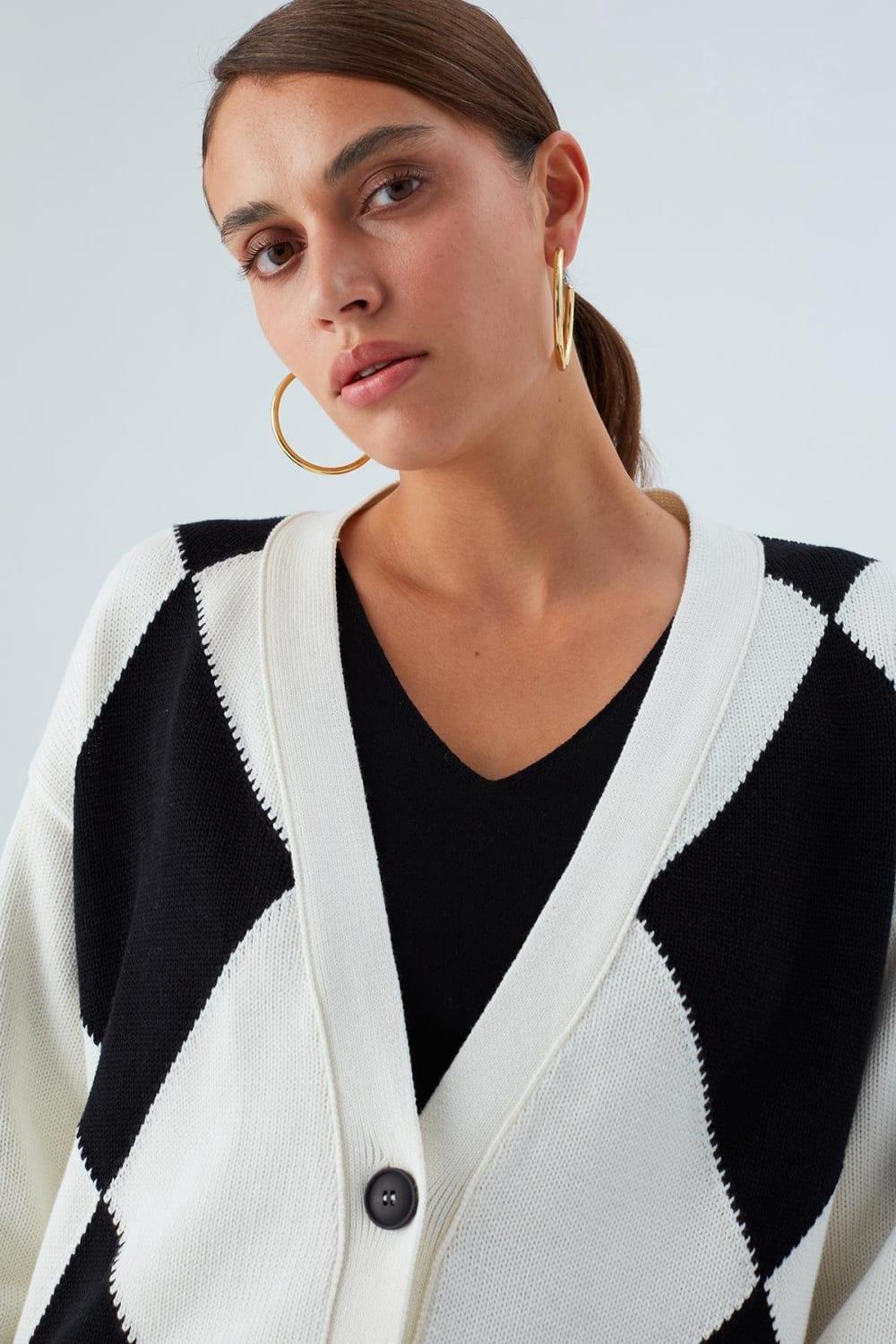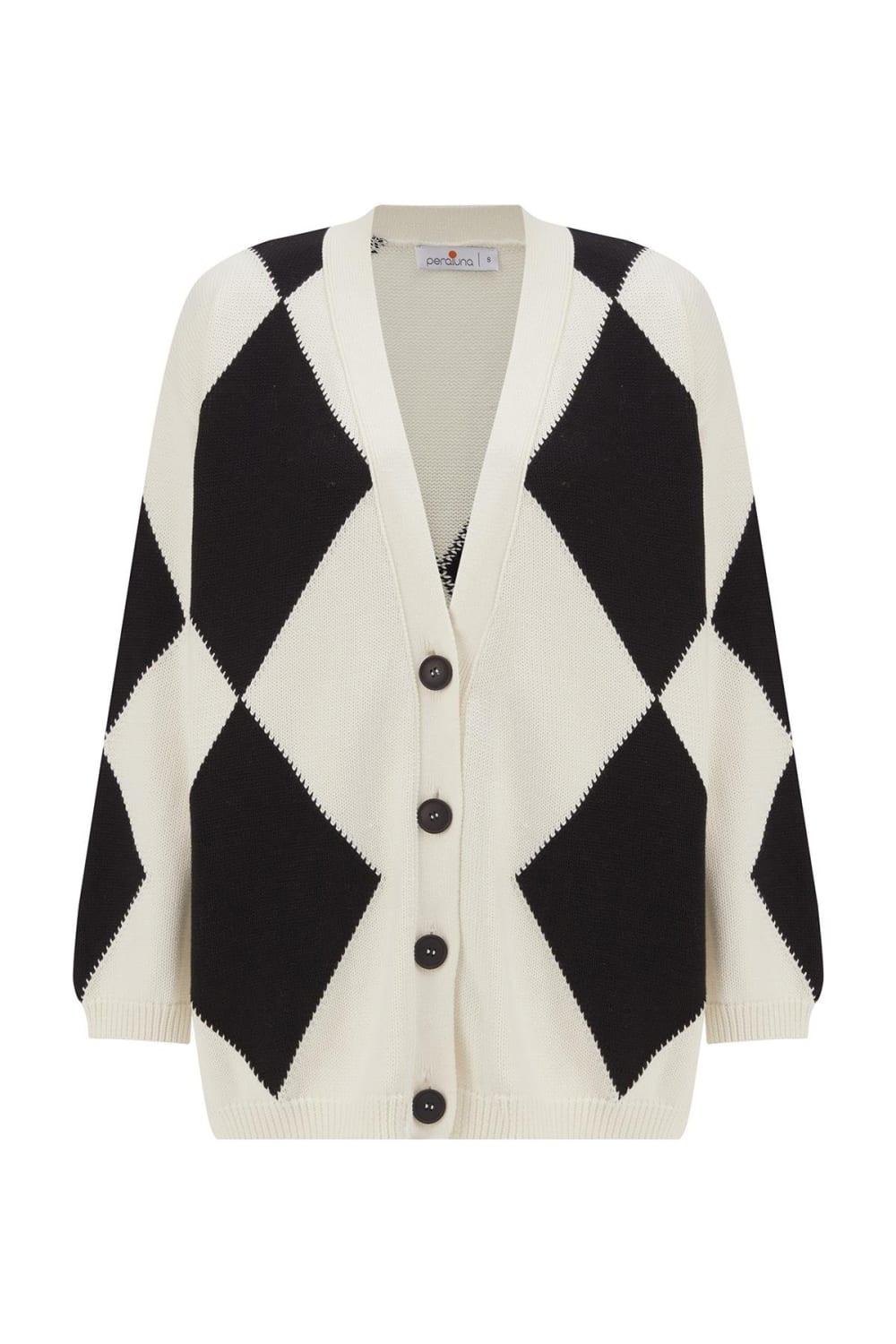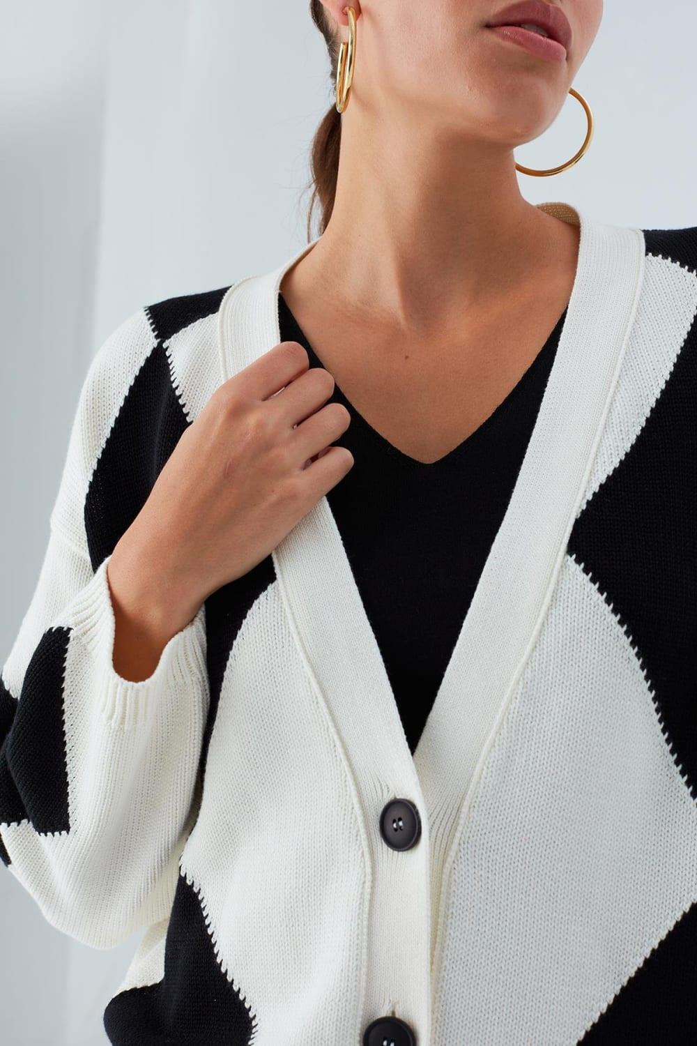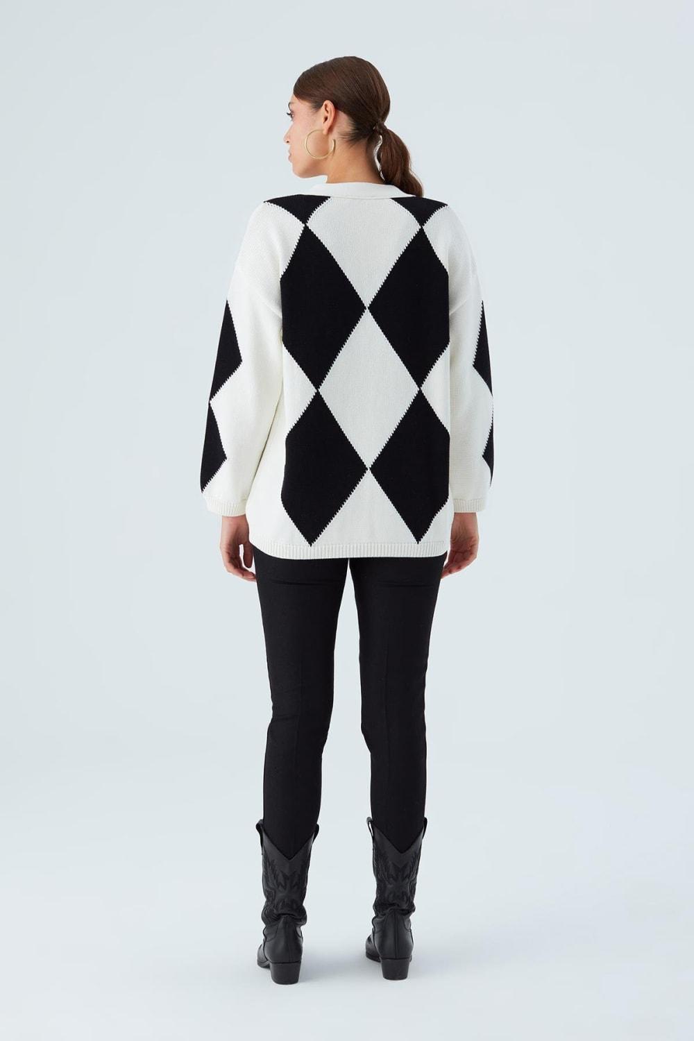 Irene Cardi̇gan Large Diamond Patterned Loose Cut Seasonal Women's Knitwear Cardigan Ecru/Black