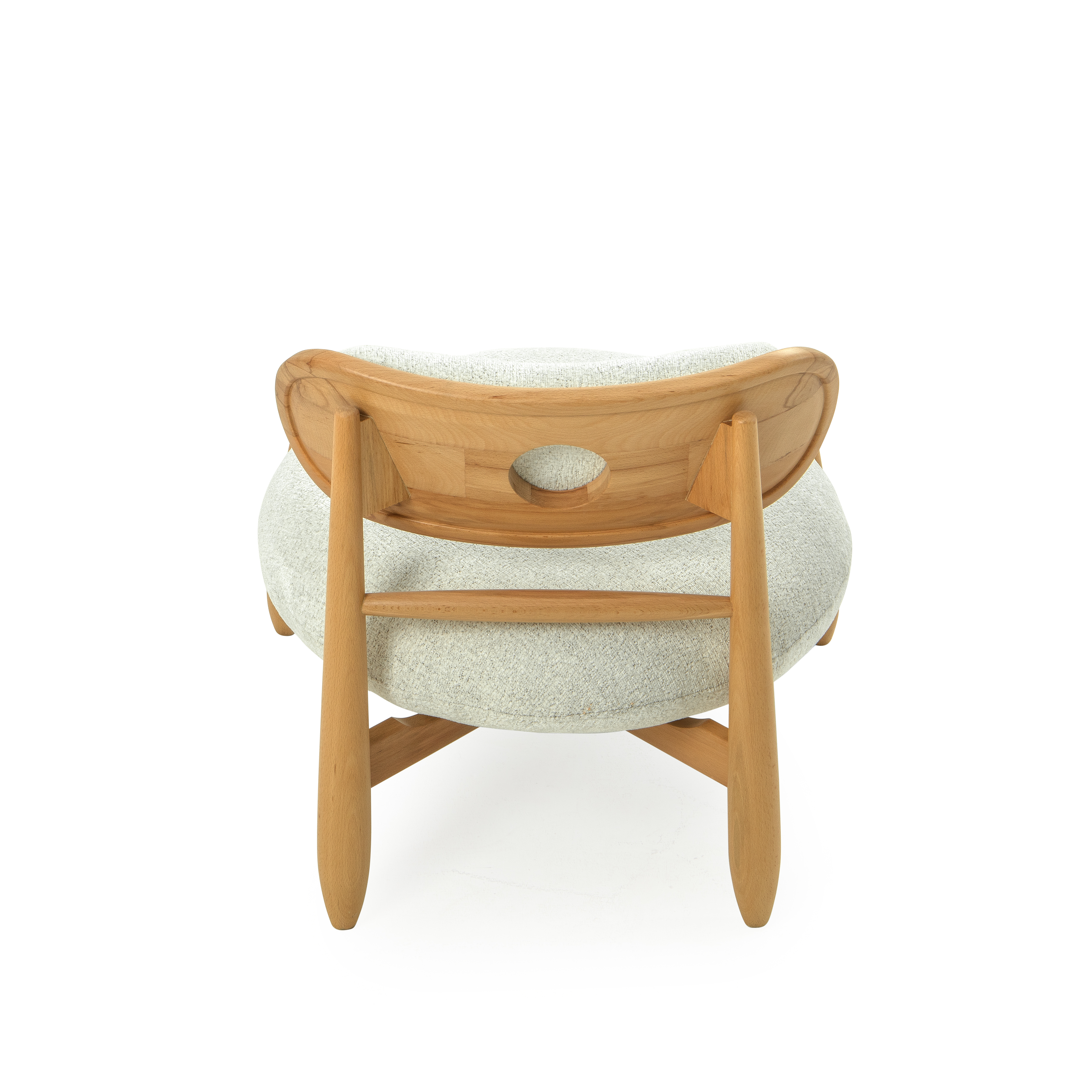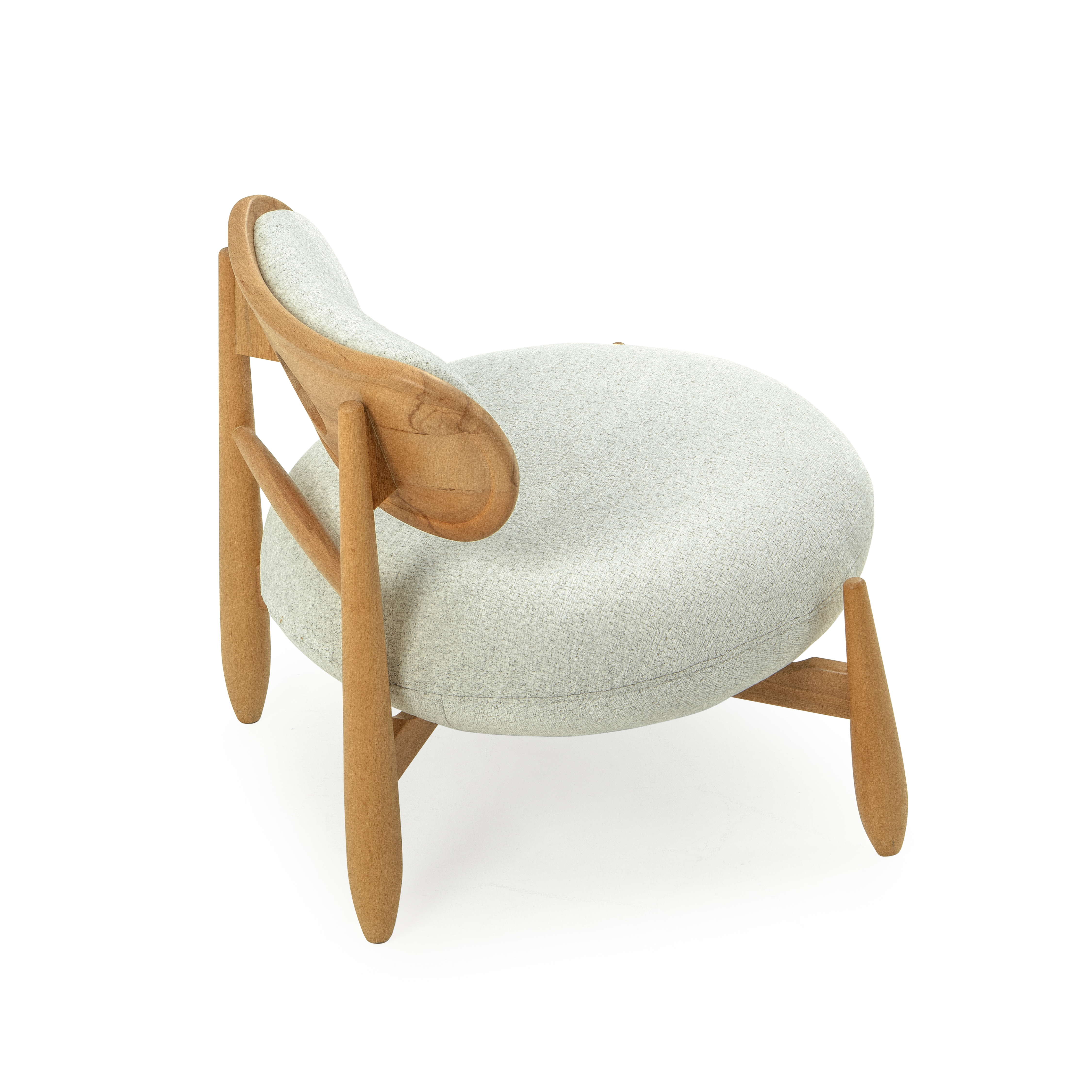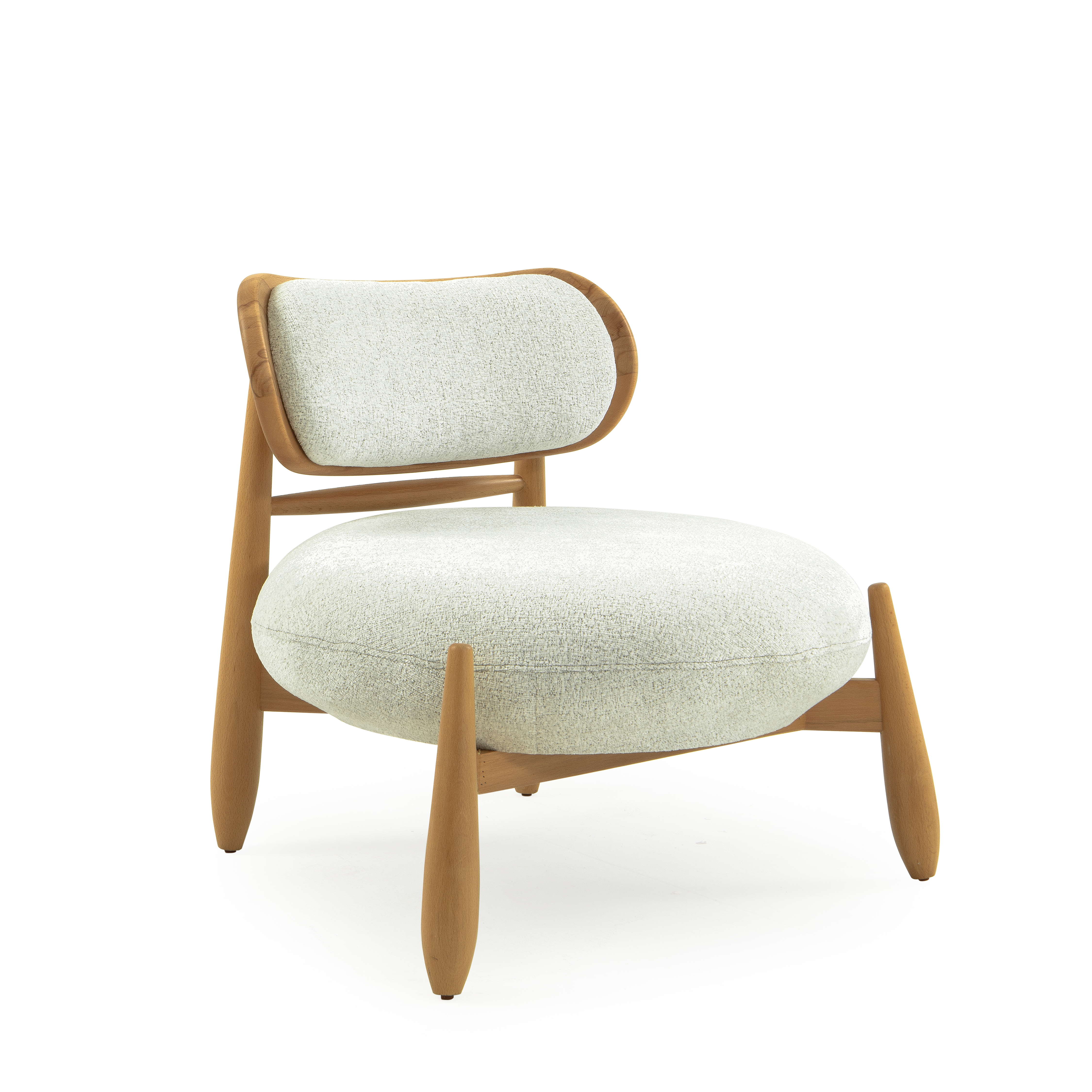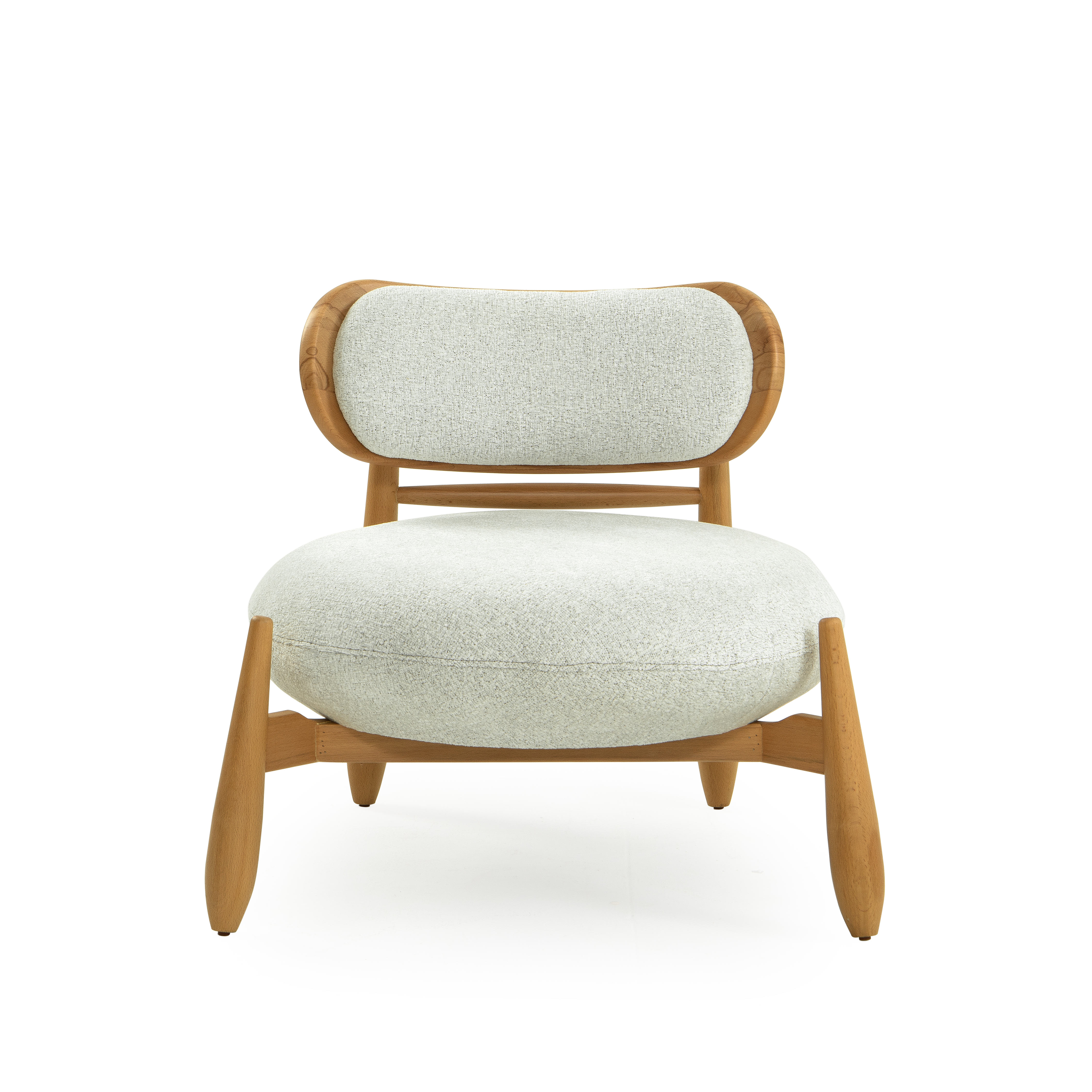 Bu berjer, oval hatları ve ahşap iskeletiyle doğal zarafeti modern konforla buluşturuyor. Akışkan formu sayesinde bulunduğu mekâna sıcak ve samimi bir hava katarken, geniş oturumuyla rahat bir oturma deneyimi sunuyor.