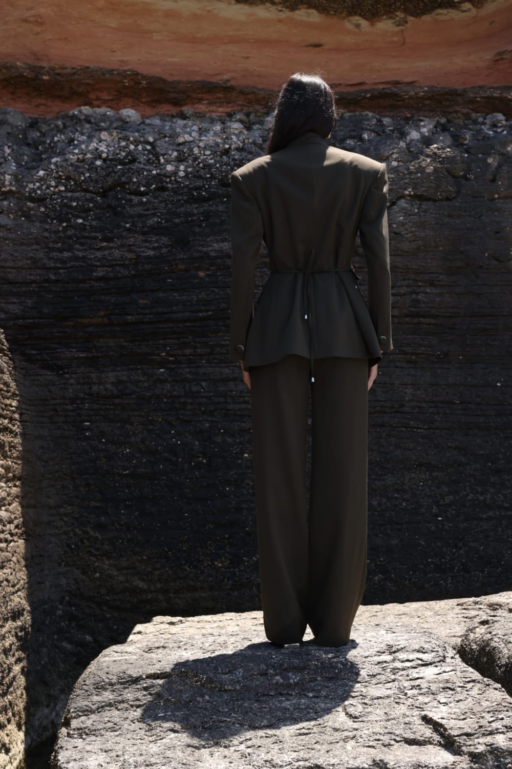Kruvaze kapamalı, astarlı, vatkalı, ip geçişli, bele bağlanan mini çanta detayı